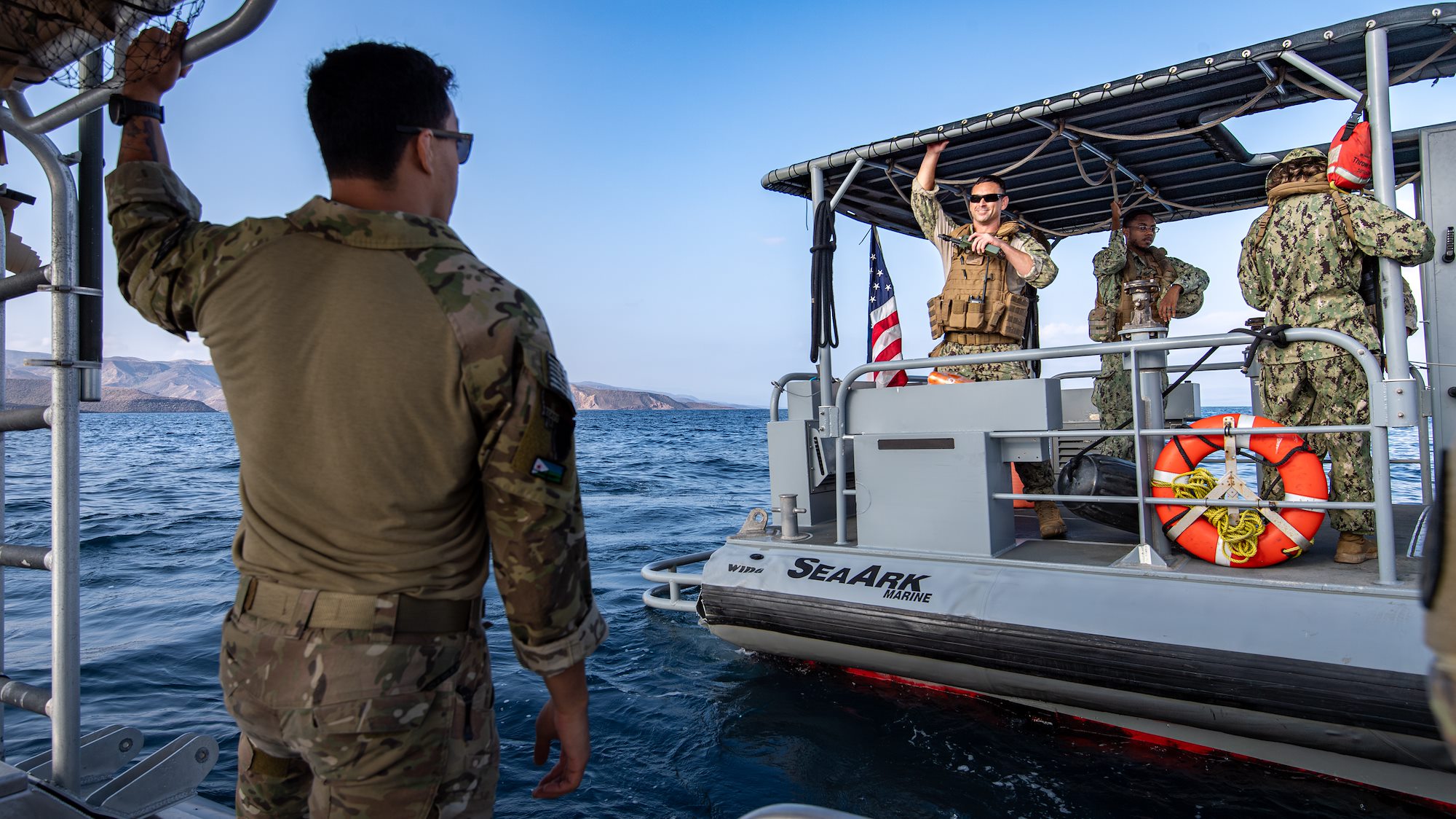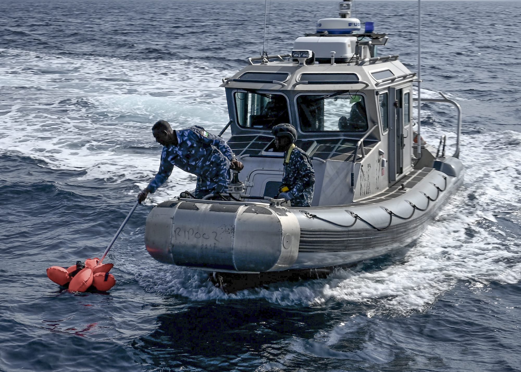 Members of the Djiboutian Navy rescue the dummy beacon during Combined Joint Task Force – Horn of Africa’s Bull Shark 25-1 exercise at Arta, Djibouti, on Nov. 26, 2024. The semiannual exercise brought together U.S., Djiboutian, Spanish, Japanese, and French forces to enhance communication and interoperability among international partners. It simulated complex personnel recovery scenarios across land, sea, and air domains, testing coordination and operational readiness while strengthening regional security and