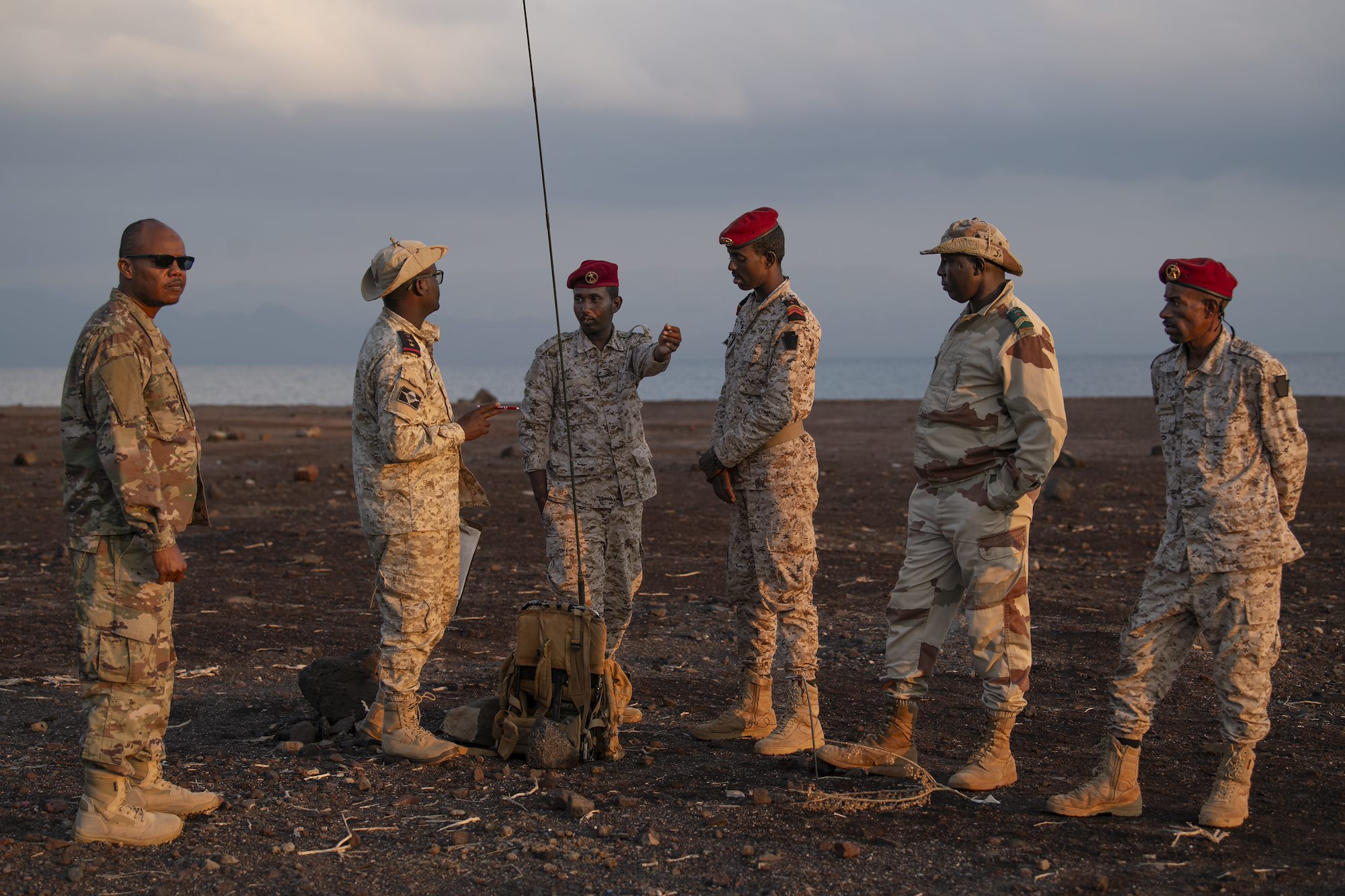 Members of the Djibouti Armed Forces discuss exercise operations during Bull Shark 25-1 at Arta, Djibouti, on Nov. 26, 2024. The semiannual exercise brought together U.S., Djiboutian, Spanish, Japanese, and French forces to enhance communication and interoperability among international partners. It simulated complex personnel recovery scenarios across land, sea, and air domains, testing coordination and operational readiness while strengthening regional security and stability. (U.S. Air National Guard photo by Tech. Sgt. Kathleen LaCorte)