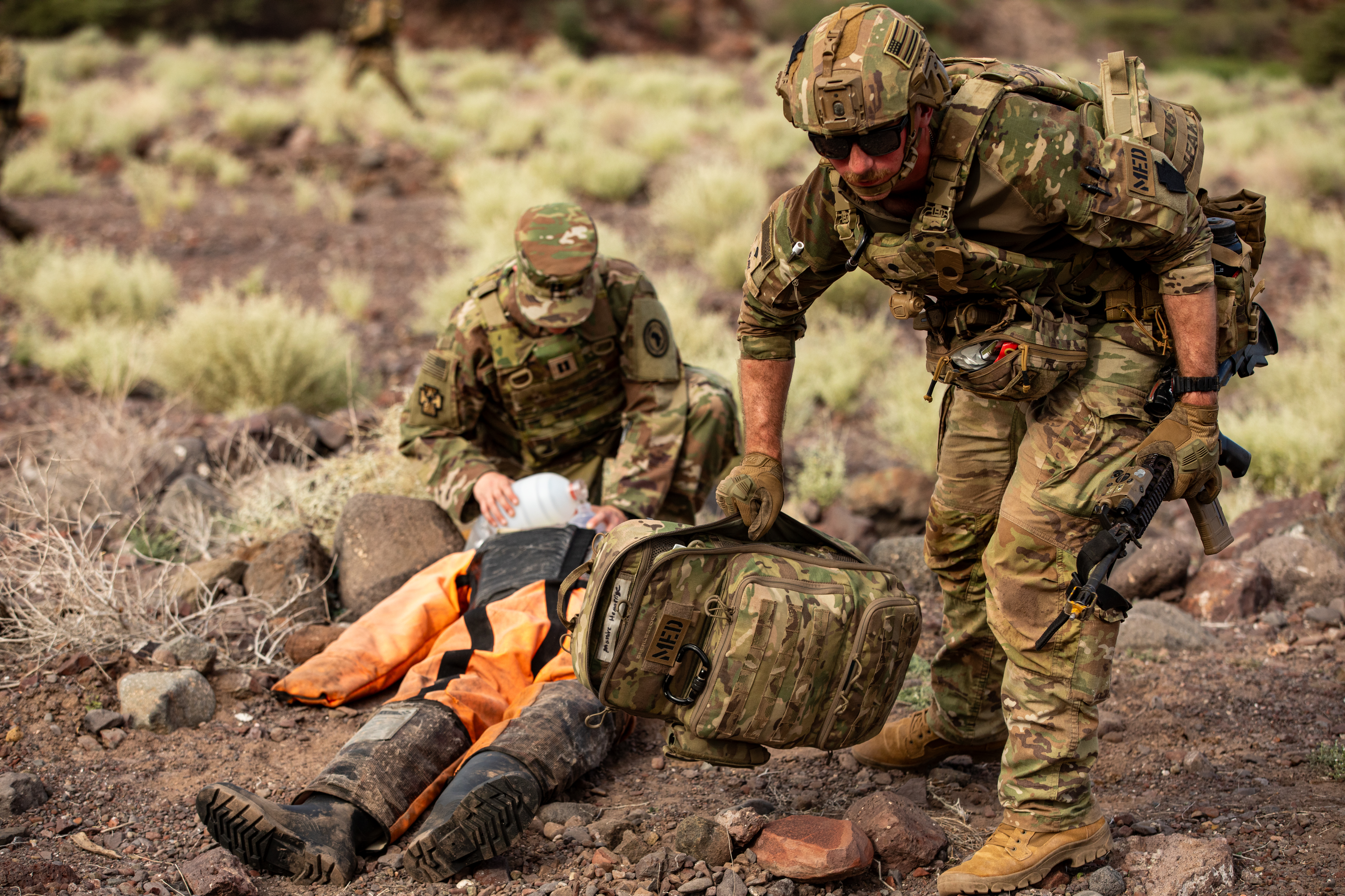 A U.S. Army Soldier with the East Africa Response Force, Task Force Associator, Combined Joint Task Force – Horn of Africa, conduct a training exercise encompassing, tactical, medical and emergency air evacuation during Bull Shark 25-1 exercise at Arta, Djibouti, on Nov. 26, 2024. The semiannual exercise brought together U.S., Djiboutian, Spanish, Japanese, and French forces to enhance communication and interoperability among international partners. It simulated complex personnel recovery scenarios across land, sea, and air domains, testing coordination and operational readiness while strengthening regional security and stability. (U.S. Army photo by Sgt. Michael Knight)