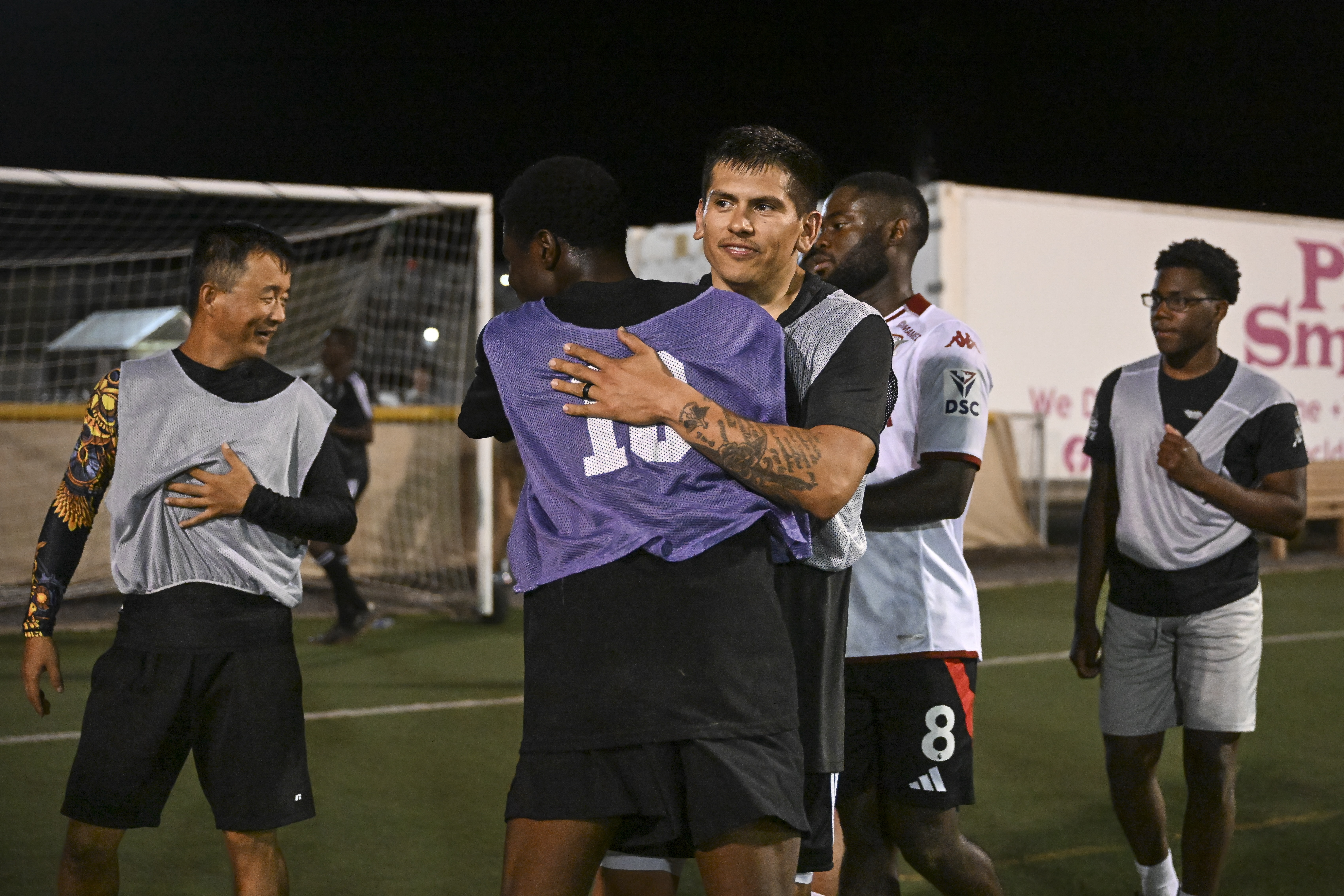 Players from the Camp Lemmonier, Djibouti and Task Force Associator soccer teams shake hands after a game during a multinational sports event at Camp Lemonnier, Djibouti, Jan. 15, 2025. Combined Joint Task Force - Horn of Africa works with allies and partners throughout the continent, building relationships to maintain and protect capable and enduring locations across East Africa. (U.S. Air Force photo by Airman 1st Class Joseph Bartoszek)