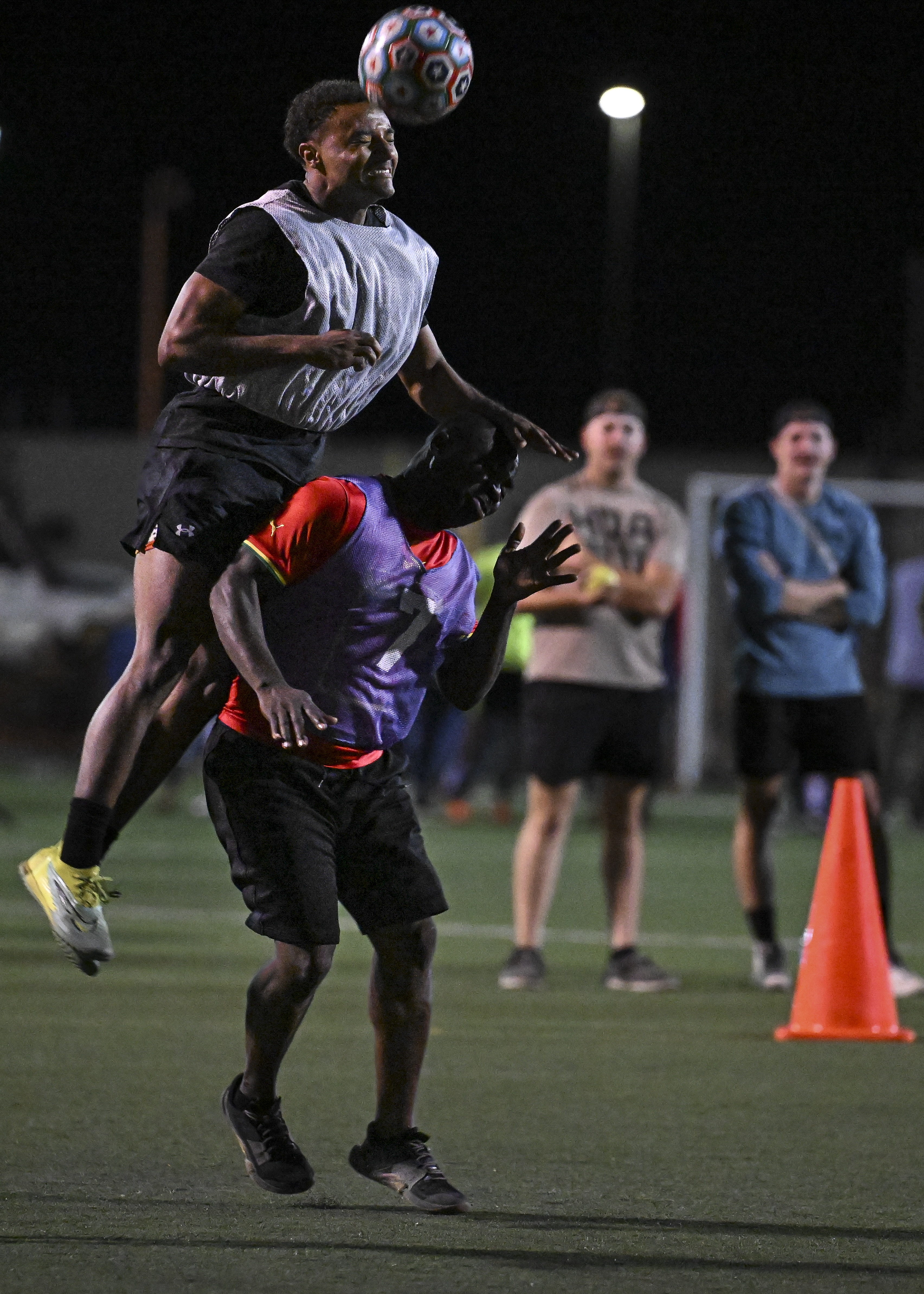 A player assigned to the Camp Lemonnier, Djibouti soccer team hits the ball with his head during a multinational sports event at Camp Lemonnier, Djibouti, Jan. 15, 2025. Combined Joint Task Force - Horn of Africa seeks to maintain a positive relationship and build cohesiveness with Allies and partners in the Horn of Africa. (U.S. Air Force photo by Airman 1st Class Joseph Bartoszek)