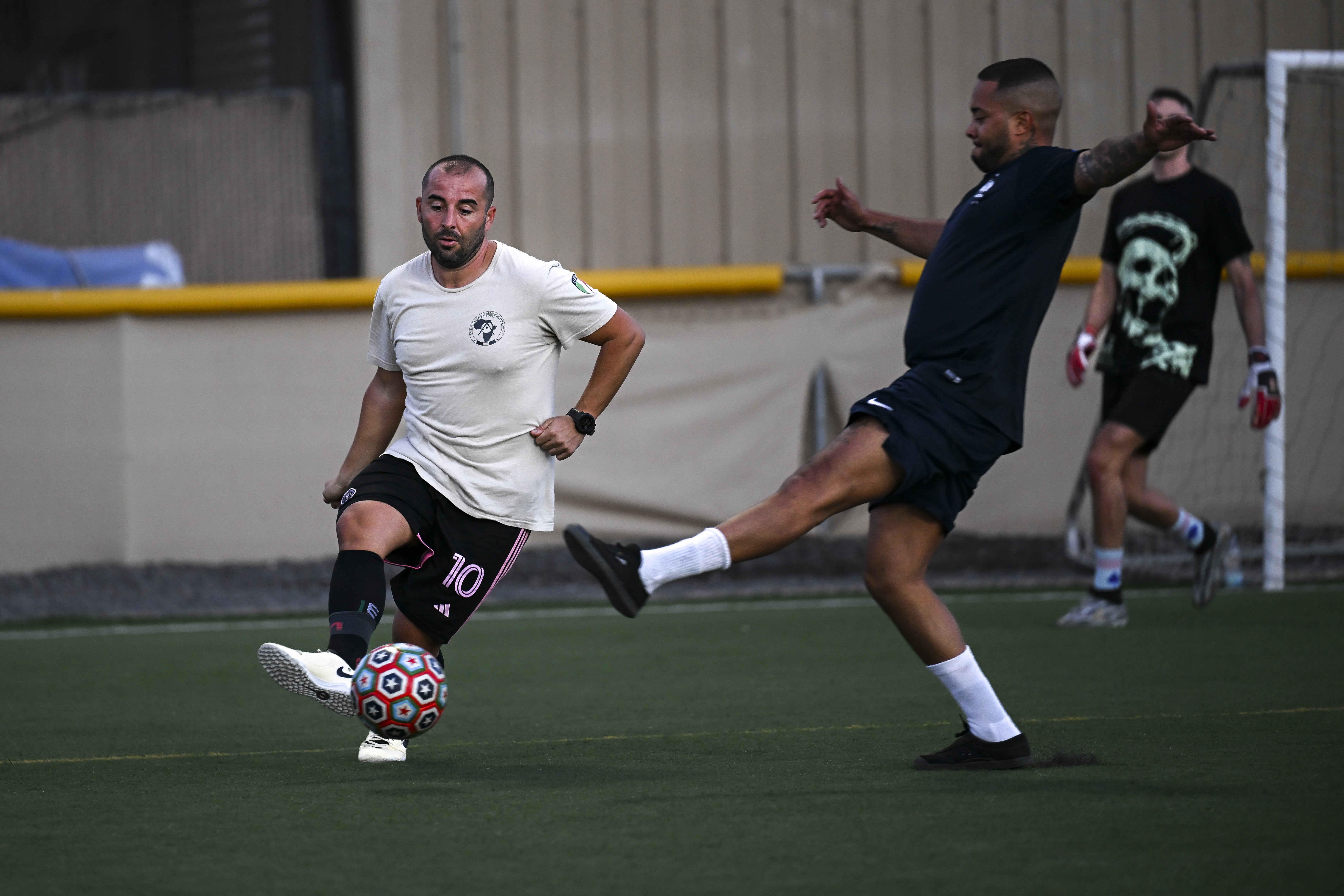 A player assigned to the Italian soccer team, left, runs past a player assigned to the French soccer team, right, during a multinational sports event at Camp Lemonnier, Djibouti, Jan. 15, 2025. The multinational sports event hosted members from Djibouti, Italy, France, Germany, Spain, Japan, South Korea, and the U.S. (U.S. Air Force photo by Airman 1st Class Joseph Bartoszek)