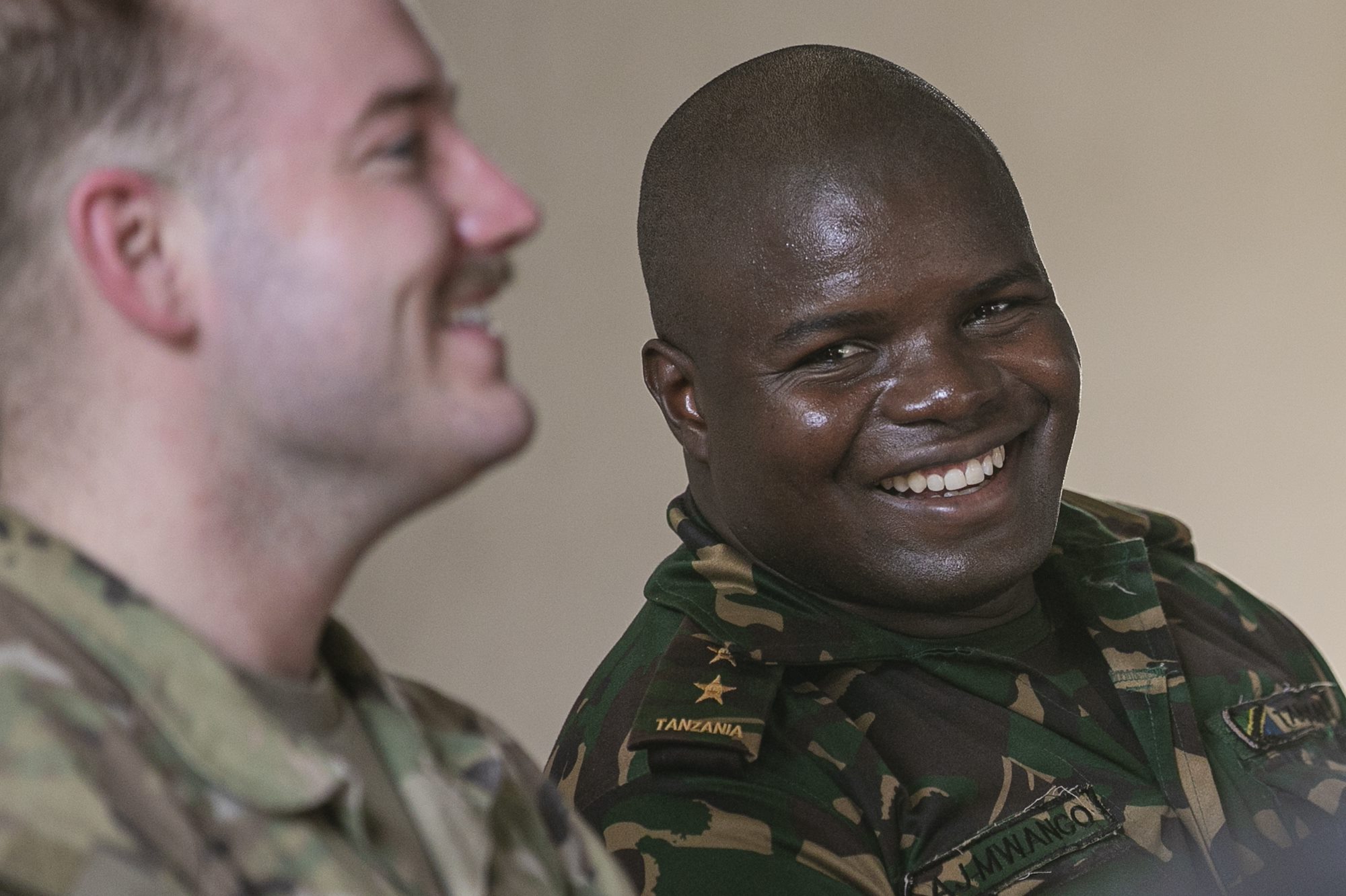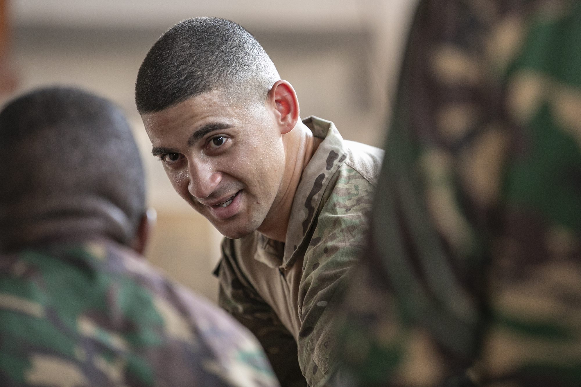 U.S. Army Capt. Omar Aybar, East Africa Response Force (EARF) company commander, assigned to Combined Joint Task Force – Horn of Africa (CJTF-HOA) talks with Tanzania People’s Defense Force (TPDF) service members during the opening ceremony for the multinational exercise Justified Accord 2025 (JA25) at the Msata Military Training Base, Msata, Tanzania, Feb. 11, 2025. JA25 is the premier U.S. Africa Command (USAFRICOM) exercise in East Africa, designed to enhance multinational combat readiness, strengthen crisis response capabilities and empower allies and partners in the region. Led by U.S. Army Southern European Task Force, Africa (SETAF-AF) and hosted in Kenya, Djibouti and Tanzania, JA25 integrates high-intensity training scenarios that sharpen warfighting skills, increase operational reach and enhance the ability to execute complex joint and multinational operations. The exercise runs from Feb. 10–21, 2025. (U.S. Army photo by Sgt. Michael Knight)
