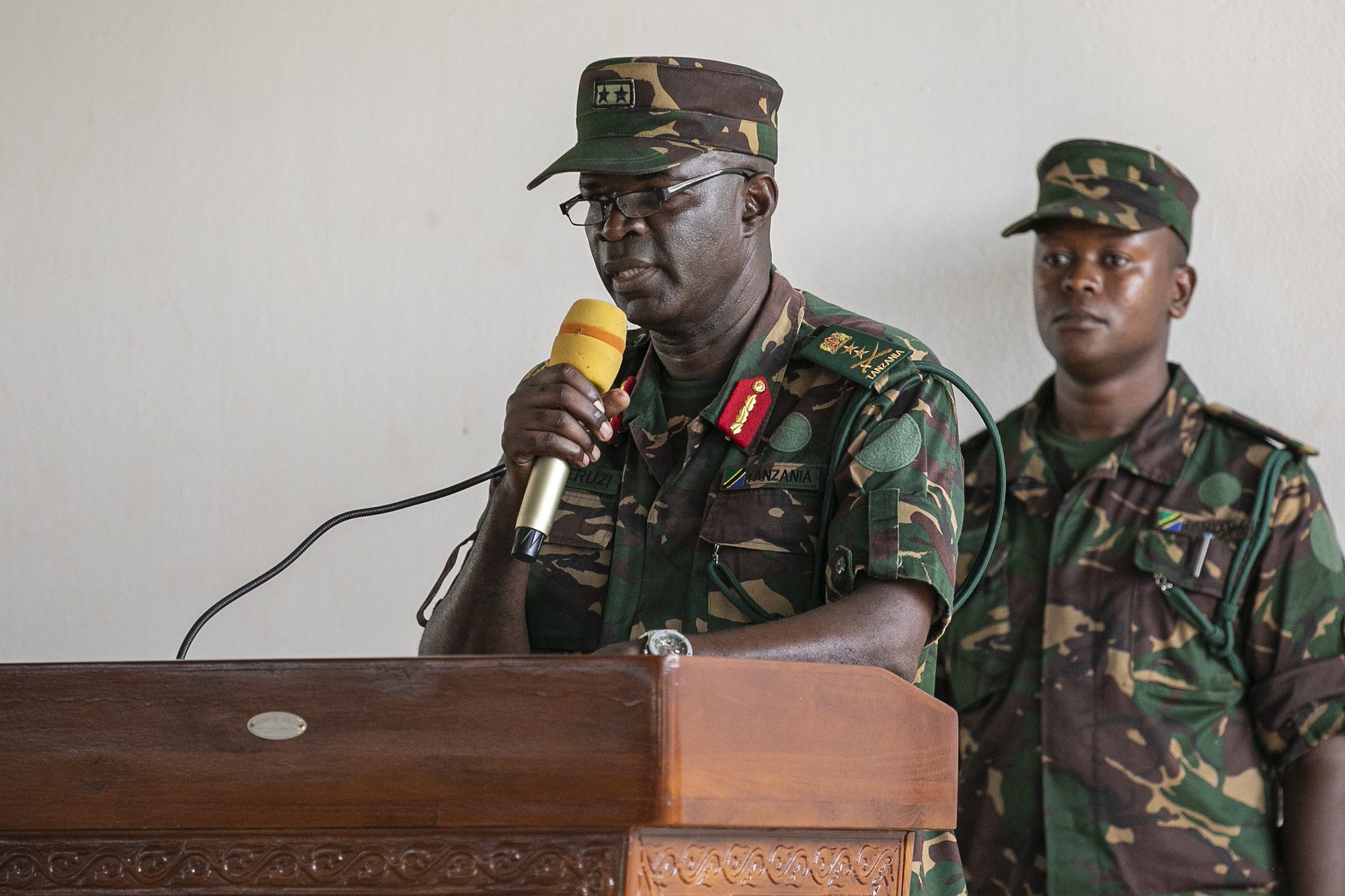 Maj. Gen. Charles Patnik, Tanzania People’s Defense Force (TPDF), delivers a speech to signify the start of the multinational exercise Justified Accord 2025 (JA25) at Msata Military Training Base in Msata, Tanzania, Feb. 11, 2025. JA25 is the premier U.S. Africa Command (USAFRICOM) exercise in East Africa, designed to enhance multinational combat readiness, strengthen crisis response capabilities and empower allies and partners in the region. Led by U.S. Army Southern European Task Force, Africa (SETAF-AF) and hosted in Kenya, Djibouti and Tanzania, JA25 integrates high-intensity training scenarios that sharpen warfighting skills, increase operational reach and enhance the ability to execute complex joint and multinational operations. The exercise runs from Feb. 10–21, 2025. (U.S. Army photo by Sgt. Michael Knight)