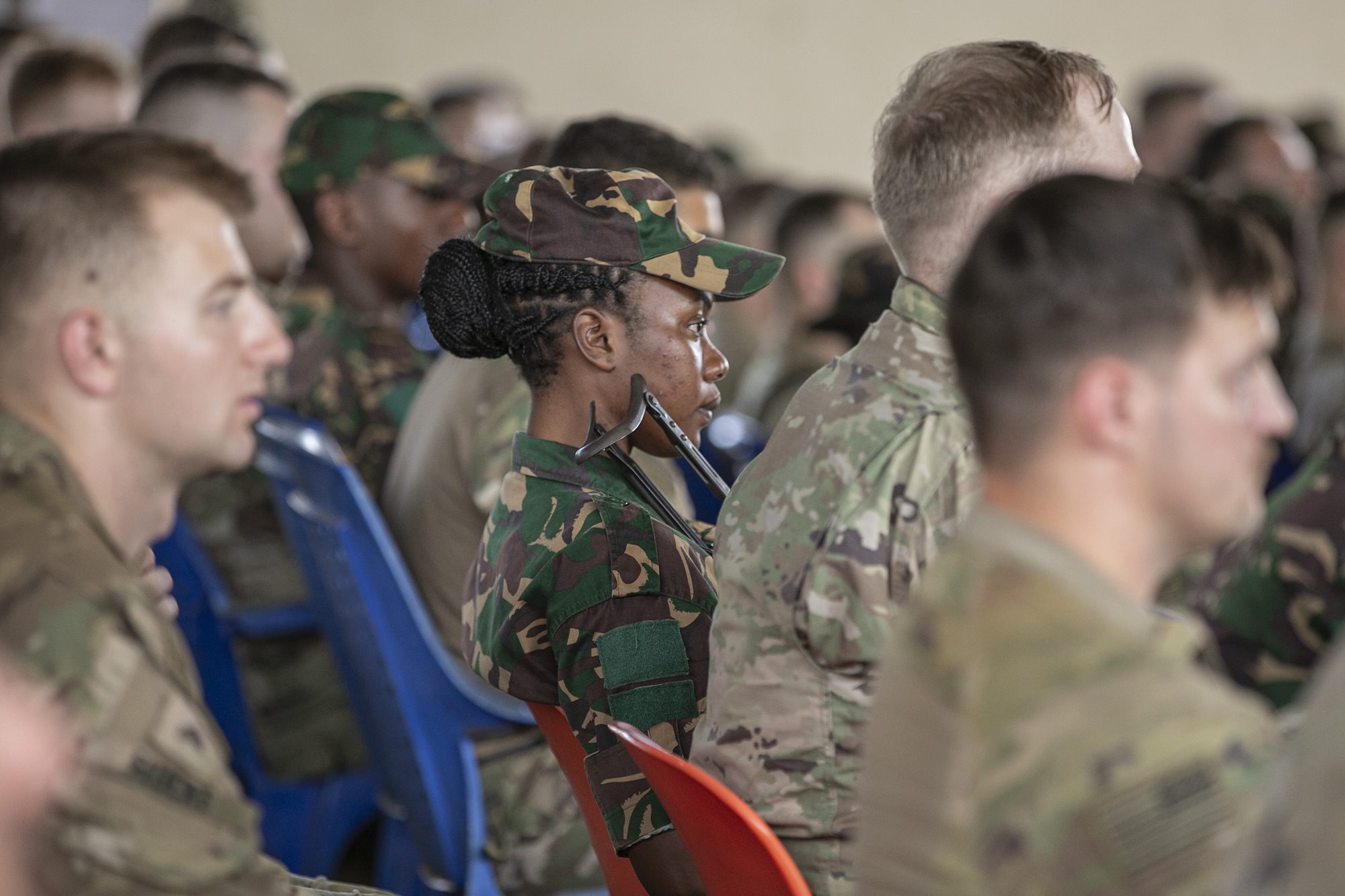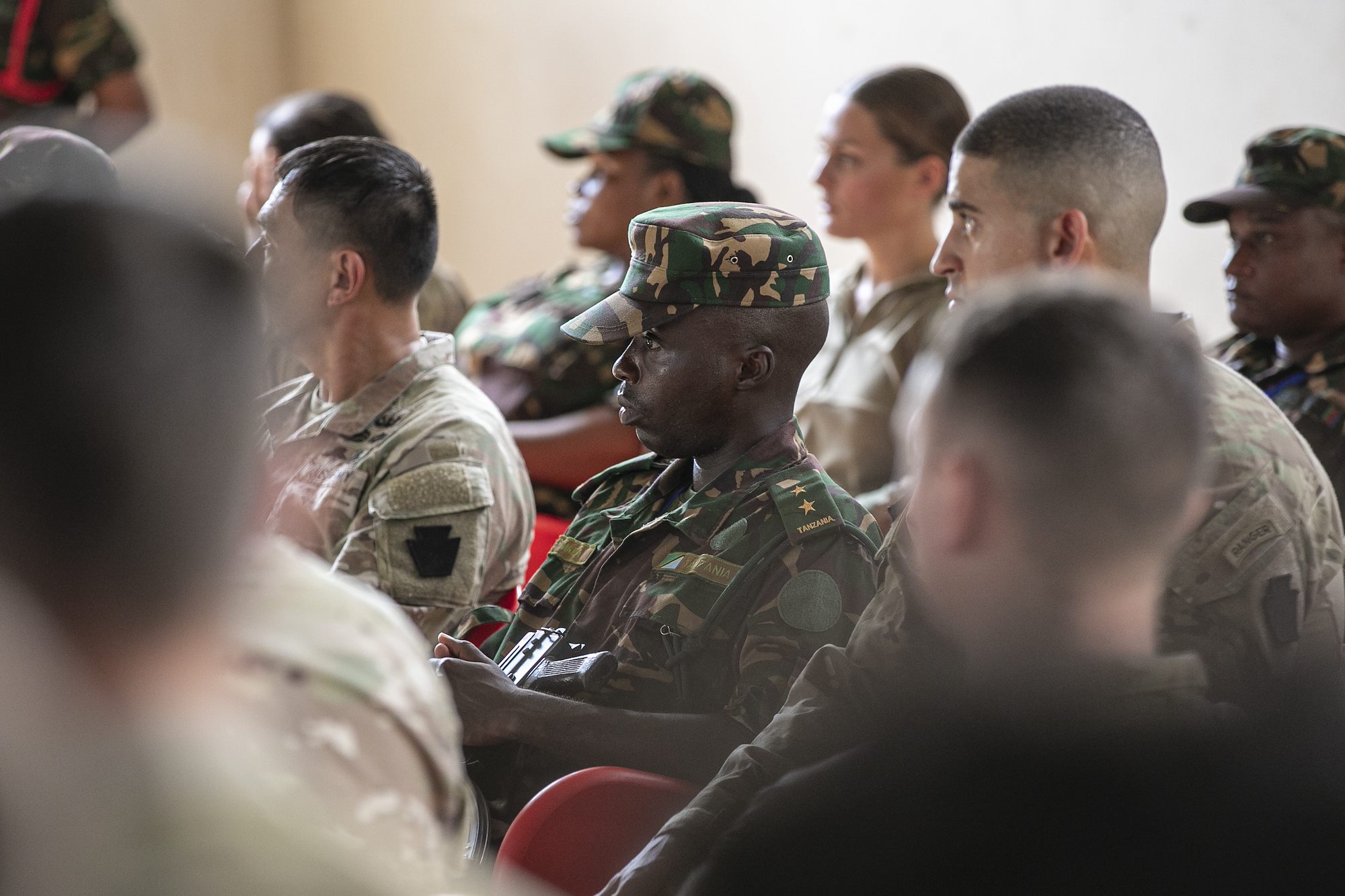 U.S. Army Soldiers of the East Africa Response Force (EARF), assigned to Combined Joint Task Force – Horn of Africa (CJTF-HOA), U.S. Army Southern European Task Force, Africa (SETAF-AF) Soldiers, Nebraska National Guard Soldiers, and the Tanzania People’s Defense Force (TPDF) listen to opening remarks during the opening ceremony for the multinational exercise Justified Accord 2025 (JA25) at the Msata Military Training Base, Msata, Tanzania, Feb. 11, 2025. JA25 is the premier U.S. Africa Command (USAFRICOM) exercise in East Africa, designed to enhance multinational combat readiness, strengthen crisis response capabilities and empower allies and partners in the region. Led by U.S. Army Southern European Task Force, Africa (SETAF-AF) and hosted in Kenya, Djibouti and Tanzania, JA25 integrates high-intensity training scenarios that sharpen warfighting skills, increase operational reach and enhance the ability to execute complex joint and multinational operations. The exercise runs from Feb. 10–21, 2025. (U.S. Army photo by Sgt. Michael Knight)
