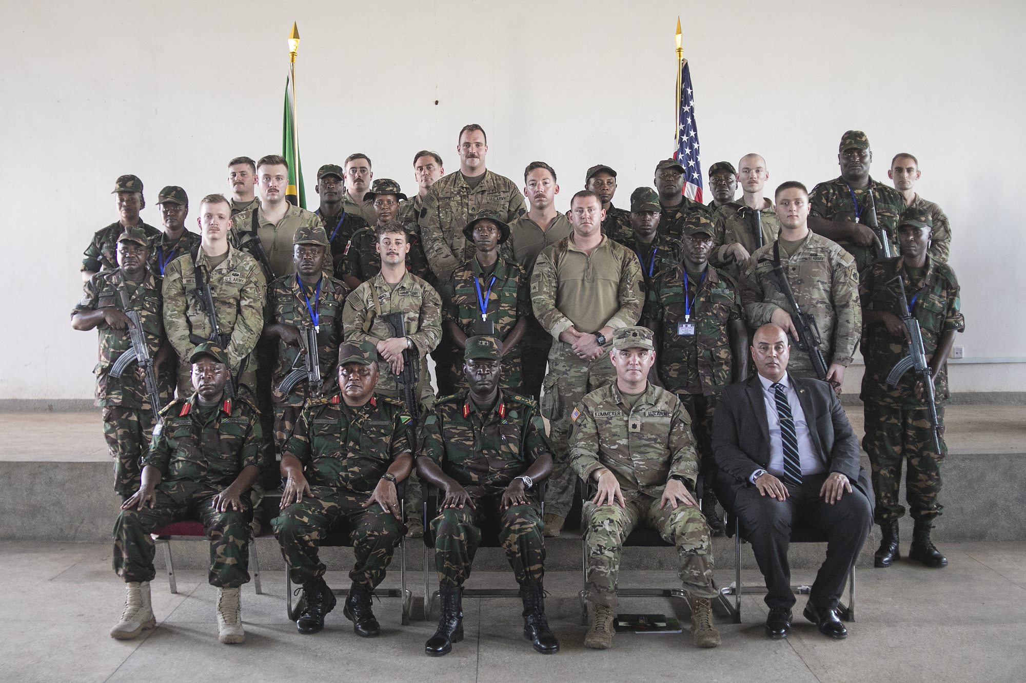 Leaders from U.S. Army Soldiers of the East Africa Response Force (EARF), assigned to Combined Joint Task Force – Horn of Africa (CJTF-HOA), U.S. Army Southern European Task Force, Africa (SETAF-AF) soldiers, and the Tanzania People’s Defense Force (TPDF) pose for a photo during the opening ceremony for the multinational exercise Justified Accord 2025 (JA25) at Msata Military Training Base, Msata, Tanzania, Feb. 11, 2025. JA25 is the premier U.S. Africa Command (USAFRICOM) exercise in East Africa, designed to enhance multinational combat readiness, strengthen crisis response capabilities and empower allies and partners in the region. Led by U.S. Army Southern European Task Force, Africa (SETAF-AF) and hosted in Kenya, Djibouti and Tanzania, JA25 integrates high-intensity training scenarios that sharpen warfighting skills, increase operational reach and enhance the ability to execute complex joint and multinational operations. The exercise runs from Feb. 10–21, 2025. (U.S. Army photo by Sgt. Michael Knight)