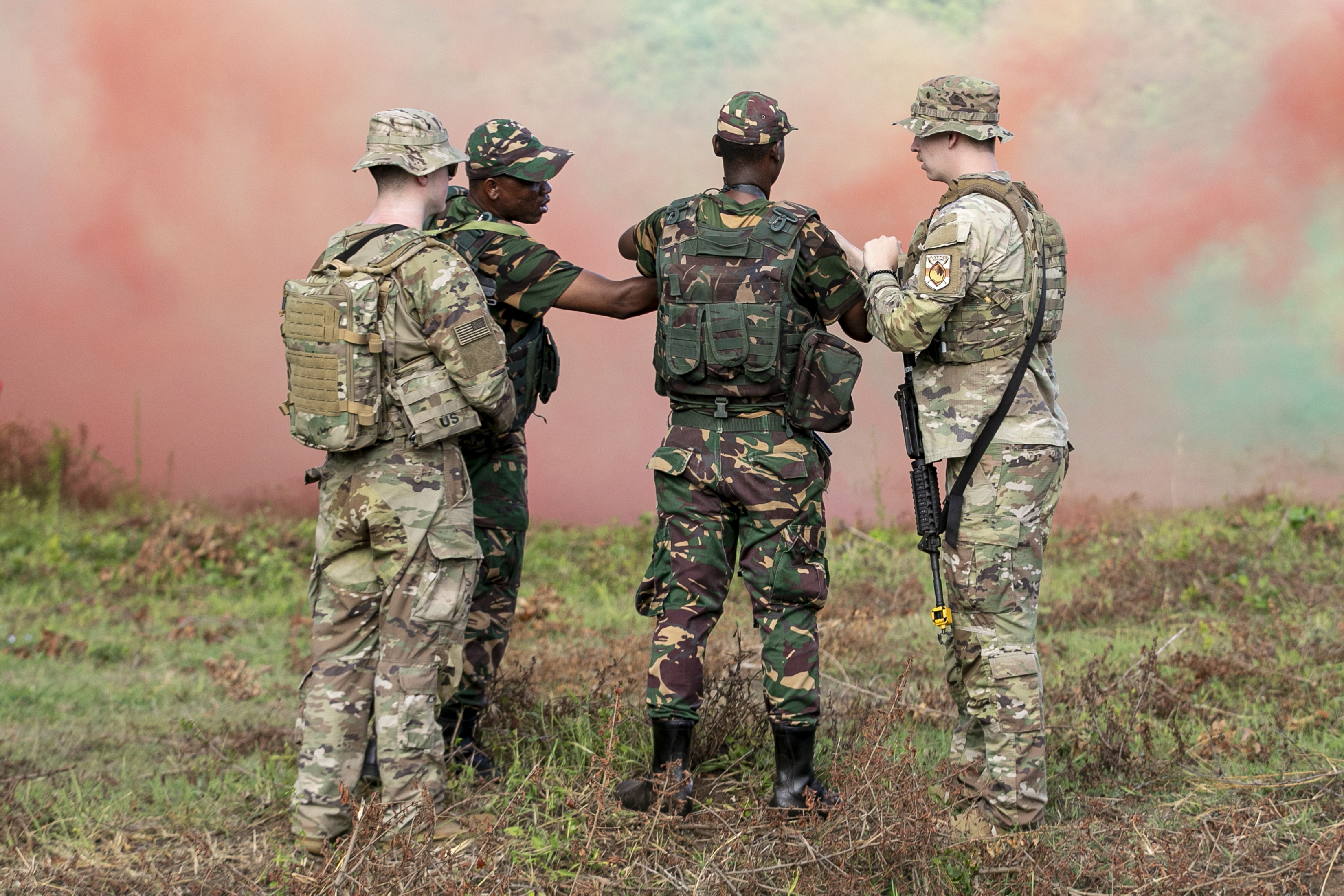 U.S. Army soldiers of the the East Africa Response Force (EARF), assigned to Combined Joint Task Force – Horn of Africa (CJTF-HOA), U.S. Army Southern European Task Force, Africa (SETAF-AF) soldiers, and the Tanzania People’s Defense Force (TPDF) service members use smoke fragmentation grenades during day three of exercise Justified Accord 2025 (JA25) at the Msata Military Training Base, Msata, Tanzania, Feb. 13, 2025. JA25 is the premier U.S. Africa Command (USAFRICOM) exercise in East Africa, designed to enhance multinational combat readiness, strengthen crisis response capabilities and empower allies and partners in the region. Led by U.S. Army Southern European Task Force, Africa (SETAF-AF) and hosted in Kenya, Djibouti and Tanzania, JA25 integrates high-intensity training scenarios that sharpen warfighting skills, increase operational reach and enhance the ability to execute complex joint and multinational operations. The exercise runs from Feb. 10–21, 2025. (U.S. Army photo by Sgt. Michael Knight)