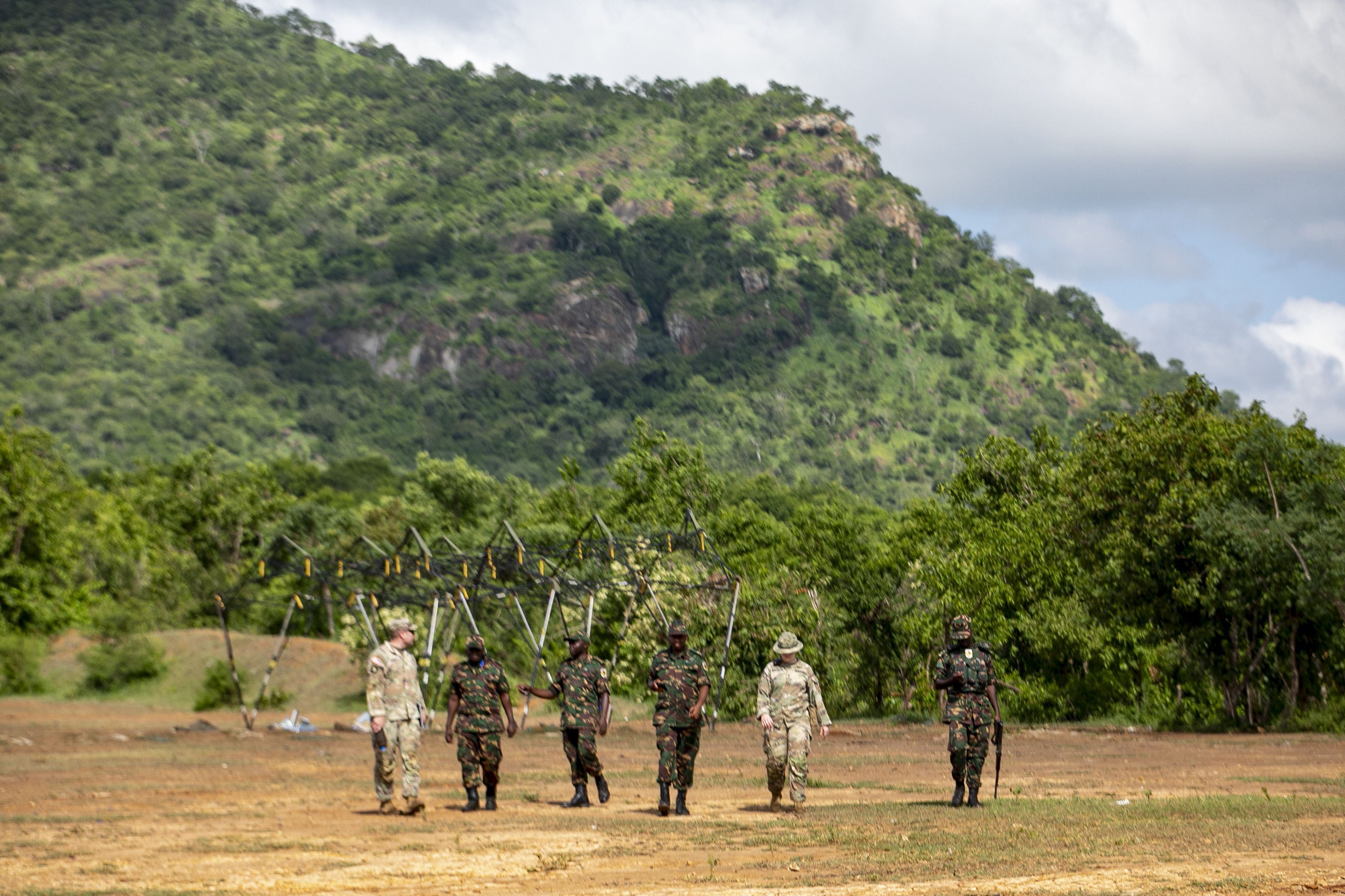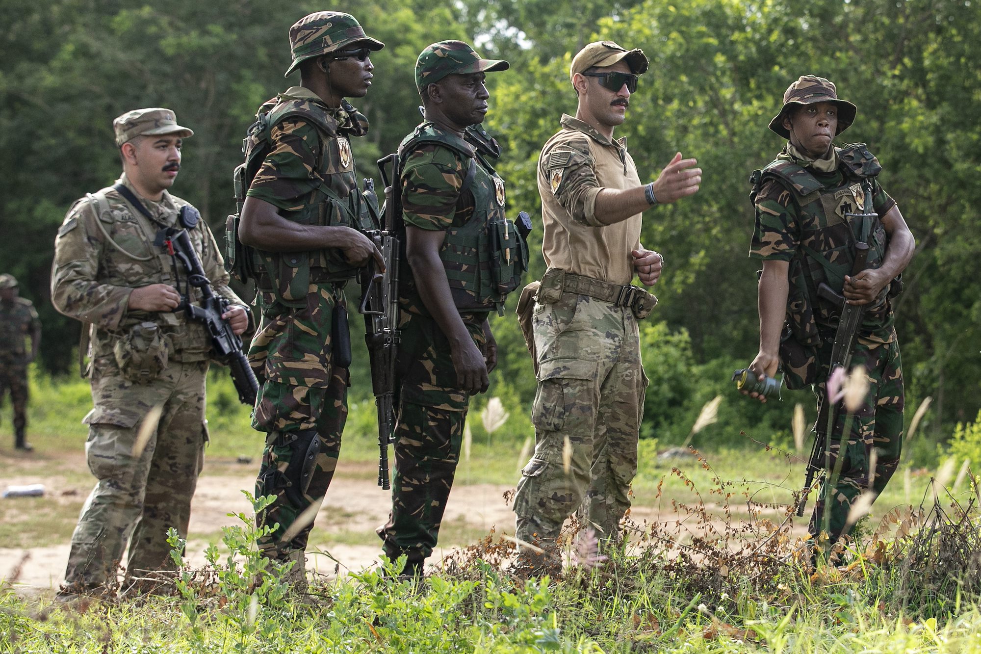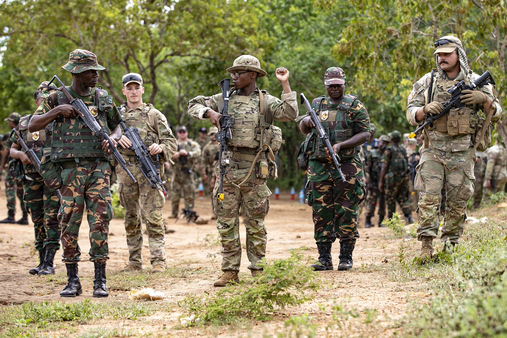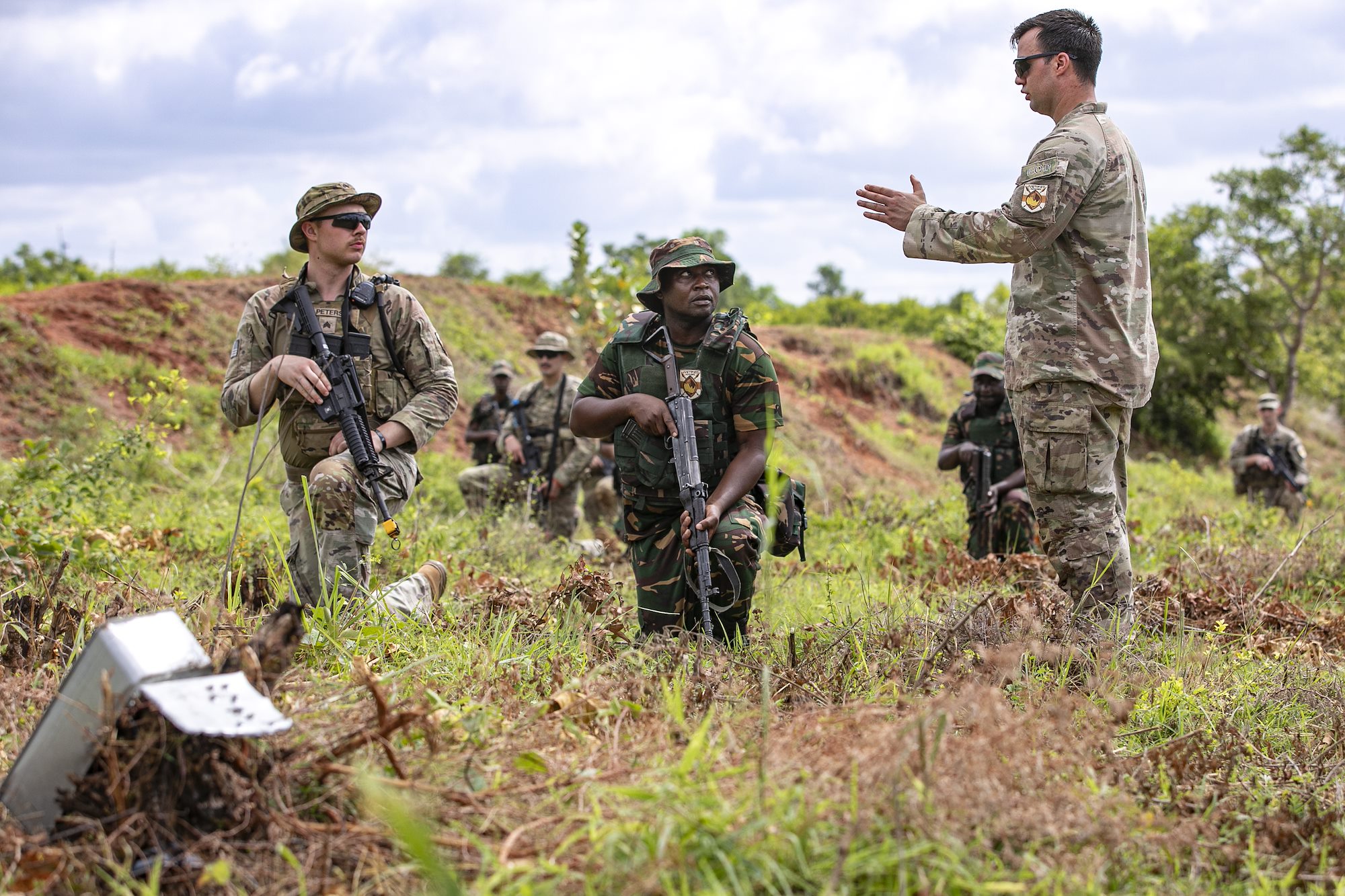 U.S. Army soldiers of the the East Africa Response Force (EARF), assigned to Combined Joint Task Force – Horn of Africa (CJTF-HOA), U.S. Army Southern European Task Force, Africa (SETAF-AF) soldiers, and the Tanzania People’s Defense Force (TPDF) discuss training objectives during day three of exercise Justified Accord 2025 (JA25) at Msata Military Training Base, Msata, Tanzania, Feb. 13, 2025. JA25 is the premier U.S. Africa Command (USAFRICOM) exercise in East Africa, designed to enhance multinational combat readiness, strengthen crisis response capabilities and empower allies and partners in the region. Led by U.S. Army Southern European Task Force, Africa (SETAF-AF) and hosted in Kenya, Djibouti and Tanzania, JA25 integrates high-intensity training scenarios that sharpen warfighting skills, increase operational reach and enhance the ability to execute complex joint and multinational operations. The exercise runs from Feb. 10–21, 2025. (U.S. Army photo by Sgt. Michael Knight)