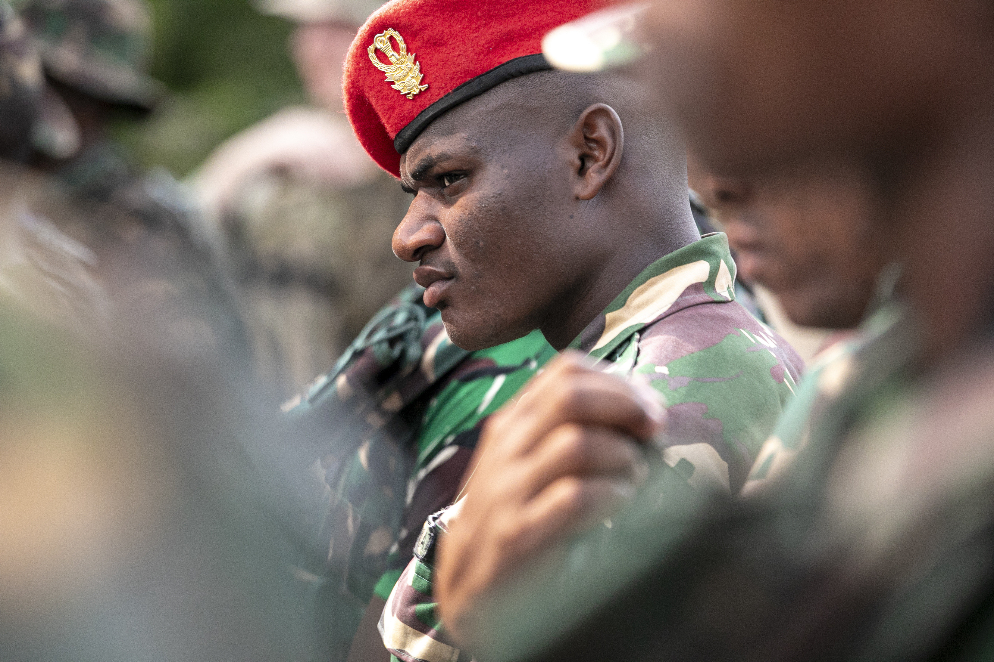 A Tanzania People’s Defense Force (TPDF) service member listens during a briefing on improvised explosive devices (IED) during day three of exercise Justified Accord 2025 (JA25) at the Msata Military Training Base, Msata, Tanzania, Feb. 13, 2025. JA25 is the premier U.S. Africa Command (USAFRICOM) exercise in East Africa, designed to enhance multinational combat readiness, strengthen crisis response capabilities and empower allies and partners in the region. Led by U.S. Army Southern European Task Force, Africa (SETAF-AF) and hosted in Kenya, Djibouti and Tanzania, JA25 integrates high-intensity training scenarios that sharpen warfighting skills, increase operational reach and enhance the ability to execute complex joint and multinational operations. The exercise runs from Feb. 10–21, 2025. (U.S. Army photo by Sgt. Michael Knight)