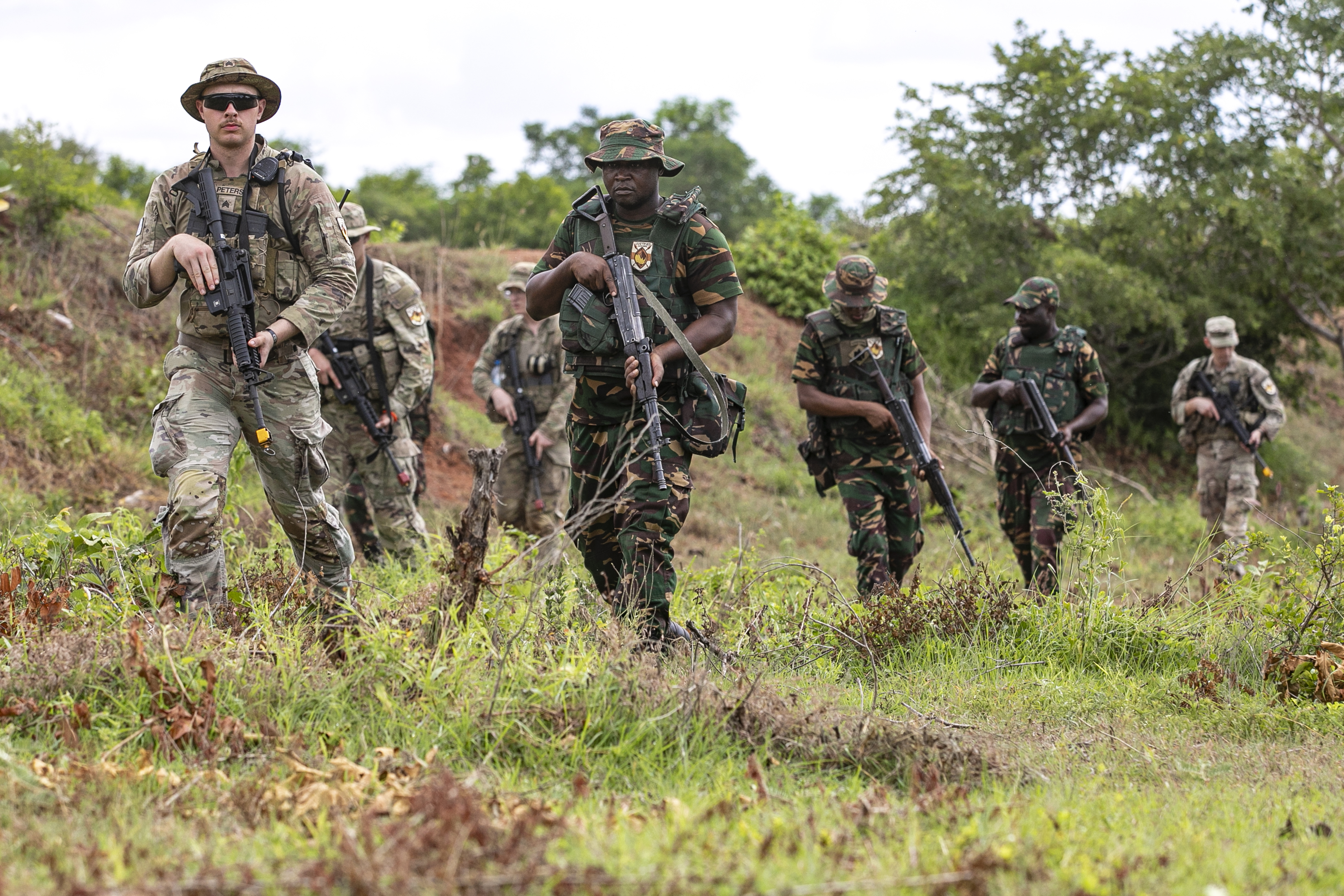 U.S. Army soldiers of the the East Africa Response Force (EARF), assigned to Combined Joint Task Force – Horn of Africa (CJTF-HOA) and Tanzania People’s Defense Force (TPDF) service members begin a patrol to identify improvised explosive devices (IED) during day three of exercise Justified Accord 2025 (JA25) at the Msata Military Training Base, Msata, Tanzania, Feb. 13, 2025. JA25 is the premier U.S. Africa Command (USAFRICOM) exercise in East Africa, designed to enhance multinational combat readiness, strengthen crisis response capabilities and empower allies and partners in the region. Led by U.S. Army Southern European Task Force, Africa (SETAF-AF) and hosted in Kenya, Djibouti and Tanzania, JA25 integrates high-intensity training scenarios that sharpen warfighting skills, increase operational reach and enhance the ability to execute complex joint and multinational operations. The exercise runs from Feb. 10–21, 2025. (U.S. Army photo by Sgt. Michael Knight)