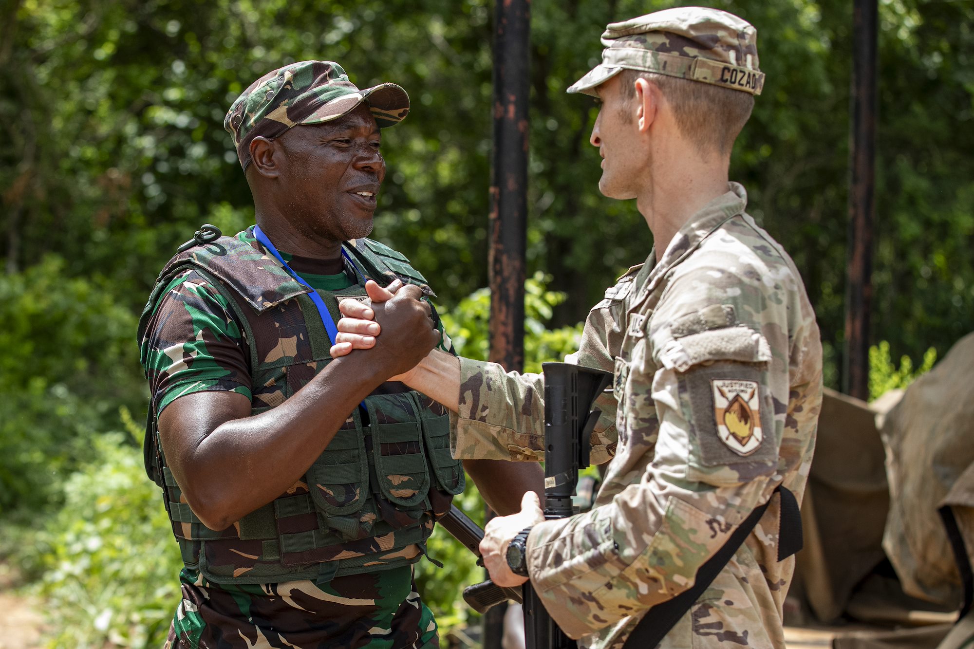 A Tanzania People’s Defense Force (TPDF) service member and U.S. Army Soldier greet each other during day three of exercise Justified Accord 2025 (JA25) at the Msata Military Training Base, Msata, Tanzania, Feb. 13, 2025. JA25 is the premier U.S. Africa Command (USAFRICOM) exercise in East Africa, designed to enhance multinational combat readiness, strengthen crisis response capabilities and empower allies and partners in the region. Led by U.S. Army Southern European Task Force, Africa (SETAF-AF) and hosted in Kenya, Djibouti and Tanzania, JA25 integrates high-intensity training scenarios that sharpen warfighting skills, increase operational reach and enhance the ability to execute complex joint and multinational operations. The exercise runs from Feb. 10–21, 2025. (U.S. Army photo by Sgt. Michael Knight)