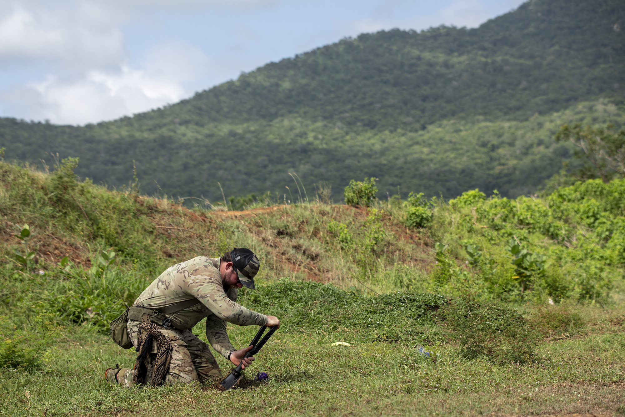 U.S. Navy explosive ordnance disposal (EOD) technician, Petty Officer 2nd class Stephen Sorbom, Explosive Ordnance Disposal Group (EODGRU) 2, prepares an improvised explosive device (IED) training identification lane during day three of exercise Justified Accord 2025 (JA25) at the Msata Military Training Base, Msata, Tanzania, Feb. 13, 2025. JA25 is the premier U.S. Africa Command (USAFRICOM) exercise in East Africa, designed to enhance multinational combat readiness, strengthen crisis response capabilities and empower allies and partners in the region. Led by U.S. Army Southern European Task Force, Africa (SETAF-AF) and hosted in Kenya, Djibouti and Tanzania, JA25 integrates high-intensity training scenarios that sharpen warfighting skills, increase operational reach and enhance the ability to execute complex joint and multinational operations. The exercise runs from Feb. 10–21, 2025. (U.S. Army photo by Sgt. Michael Knight)