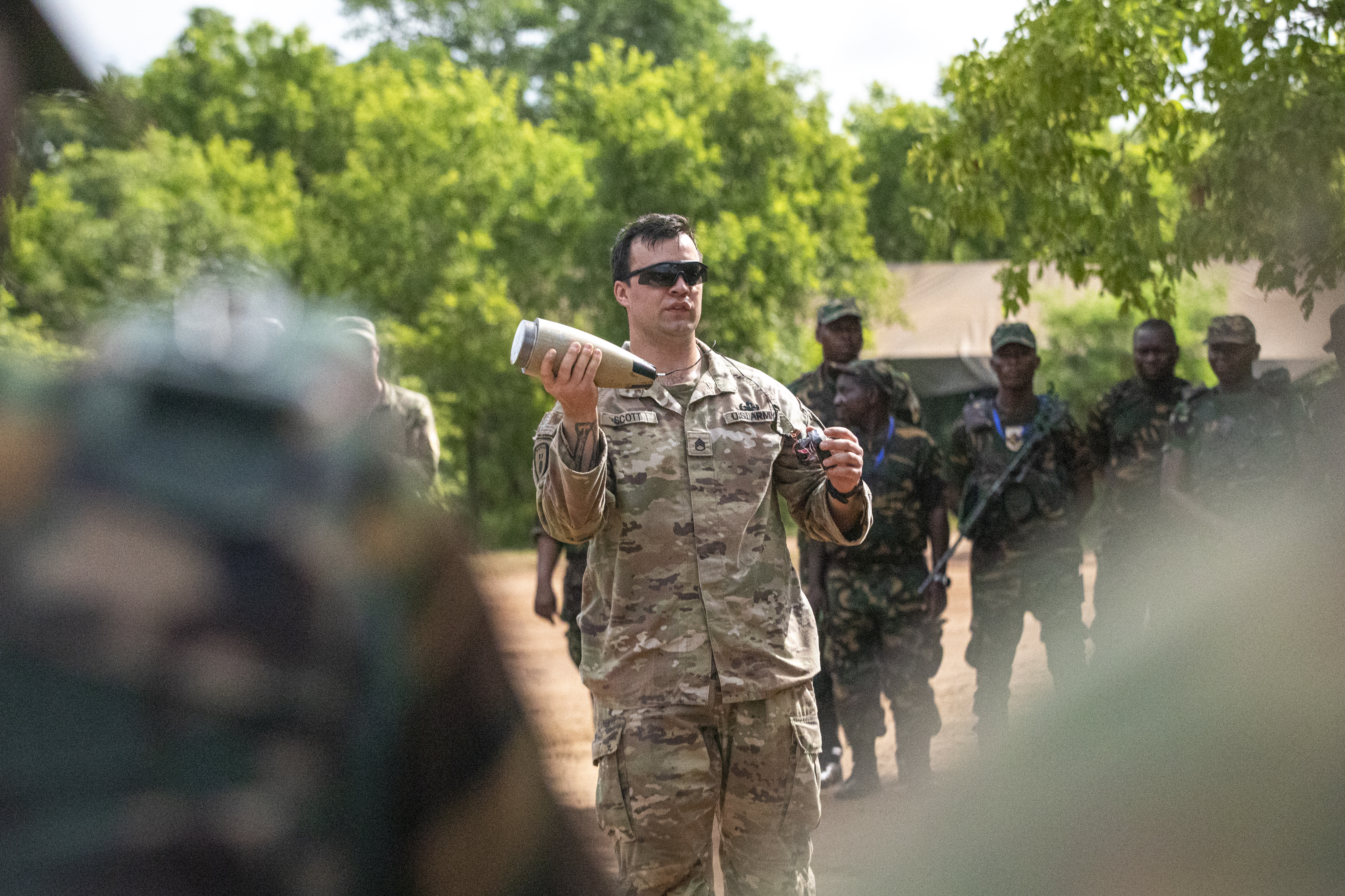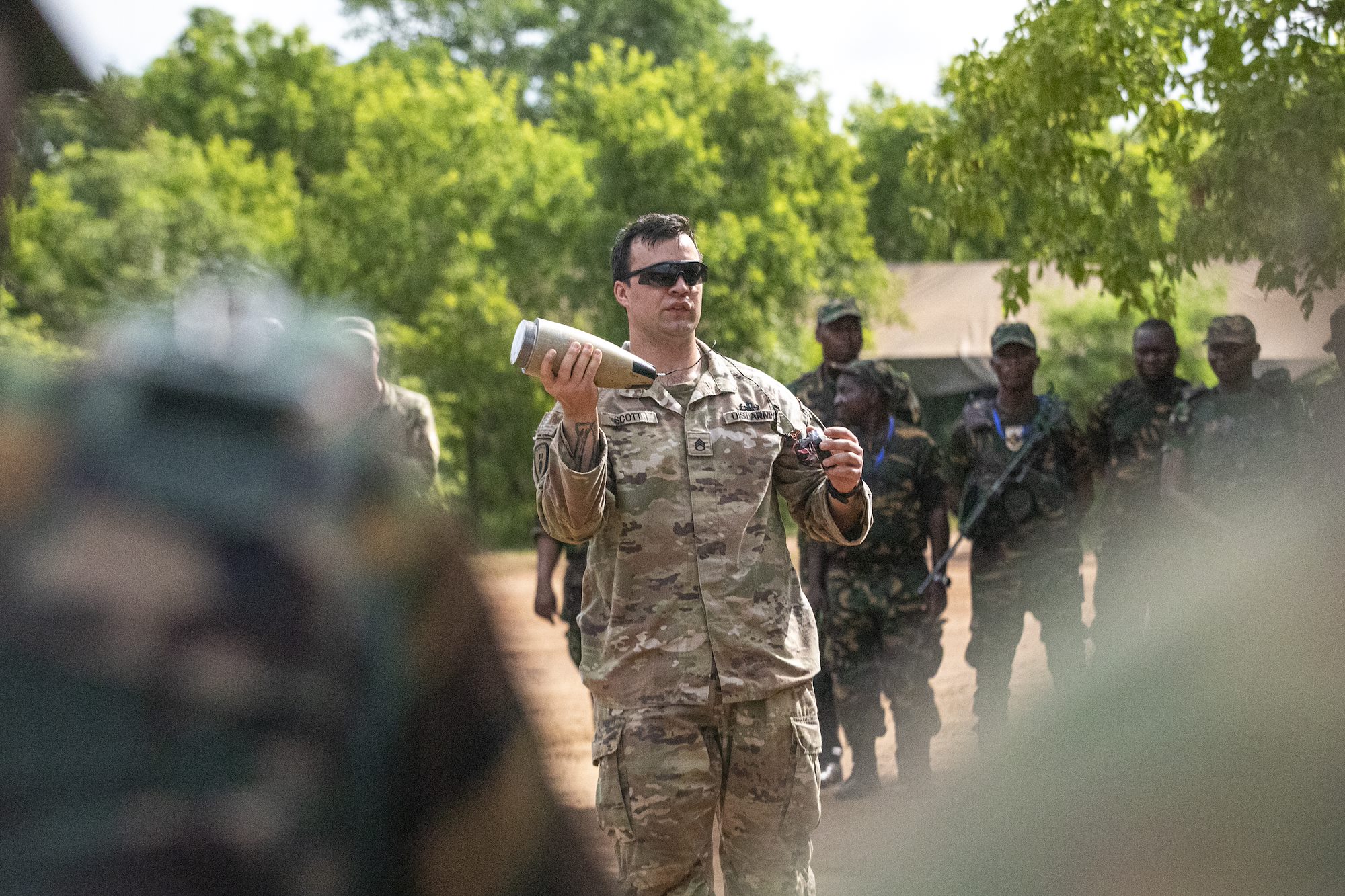 U.S. Army Staff Sgt. Robert Scott, 720th Explosive Ordnance Disposal Detachment technician, gives an improvised explosive device (IED) lesson during day three of exercise Justified Accord 2025 (JA25) at the Msata Military Training Base, Msata, Tanzania, Feb. 13, 2025. JA25 is the premier U.S. Africa Command (USAFRICOM) exercise in East Africa, designed to enhance multinational combat readiness, strengthen crisis response capabilities and empower allies and partners in the region. Led by U.S. Army Southern European Task Force, Africa (SETAF-AF) and hosted in Kenya, Djibouti and Tanzania, JA25 integrates high-intensity training scenarios that sharpen warfighting skills, increase operational reach and enhance the ability to execute complex joint and multinational operations. The exercise runs from Feb. 10–21, 2025. (U.S. Army photo by Sgt. Michael Knight)