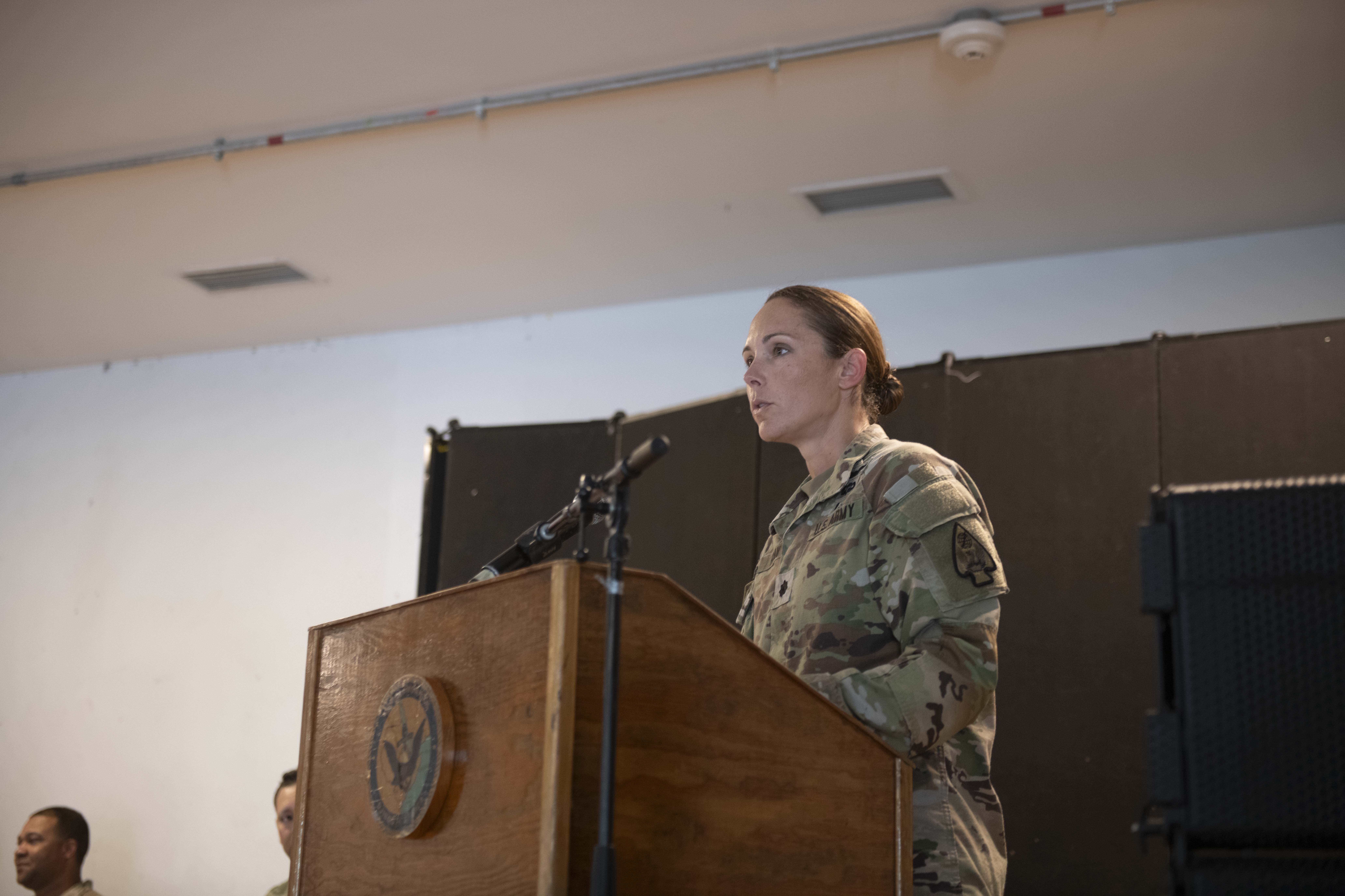 U.S. Army Lt. Col. J. Andrew Birmingham speaks during the Transfer of Authority