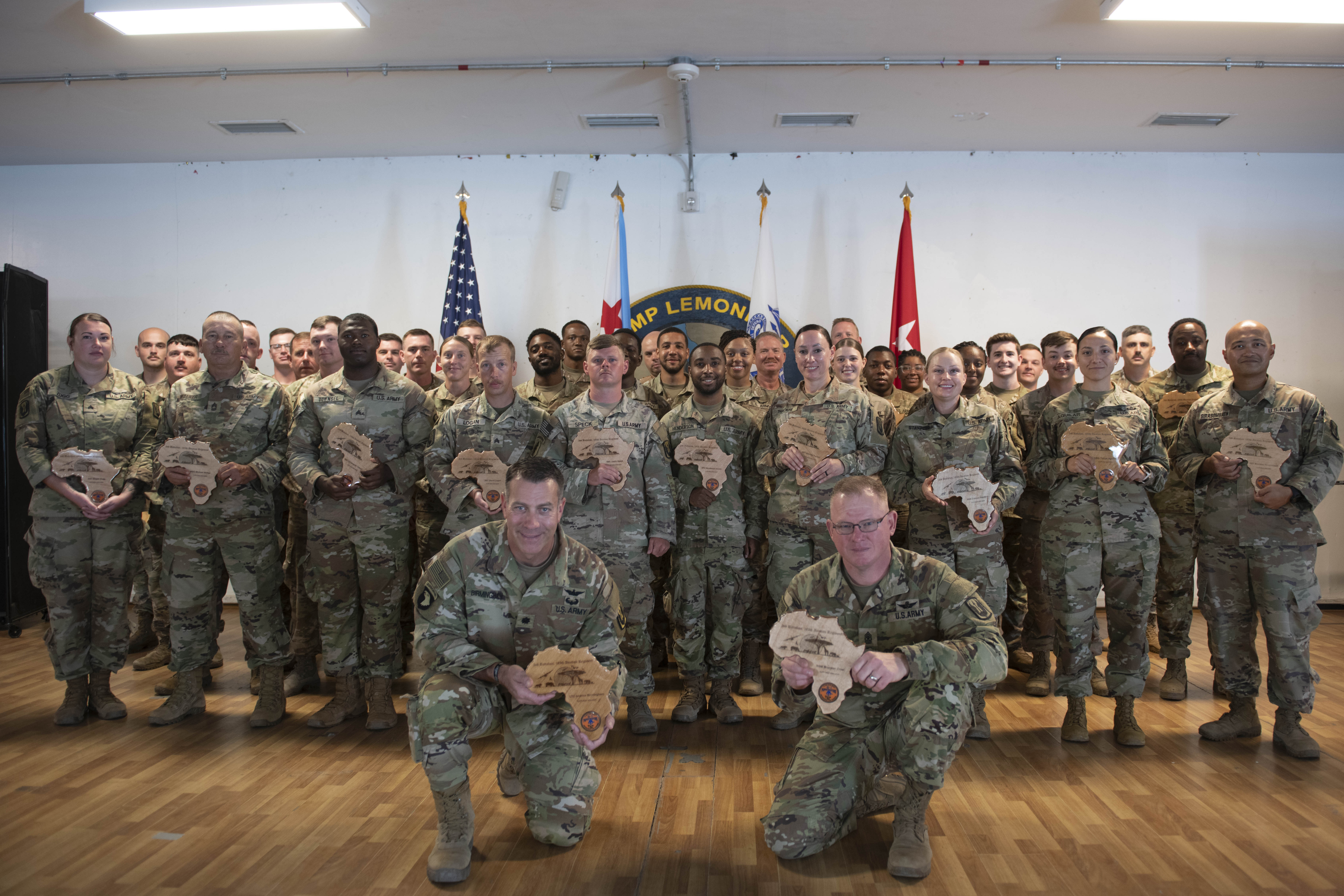 ceremony with the 2-185th Airfield Operations Battalion and 1-58th Airfield Operations Battalion at Camp Lemonnier Djibouti, Feb. 15, 2025. Many of the soldiers played critical roles in crisis response, volunteering in the community and operational efficiency advancements. (U.S. Army photo by Spc. Micheala Maldonado)