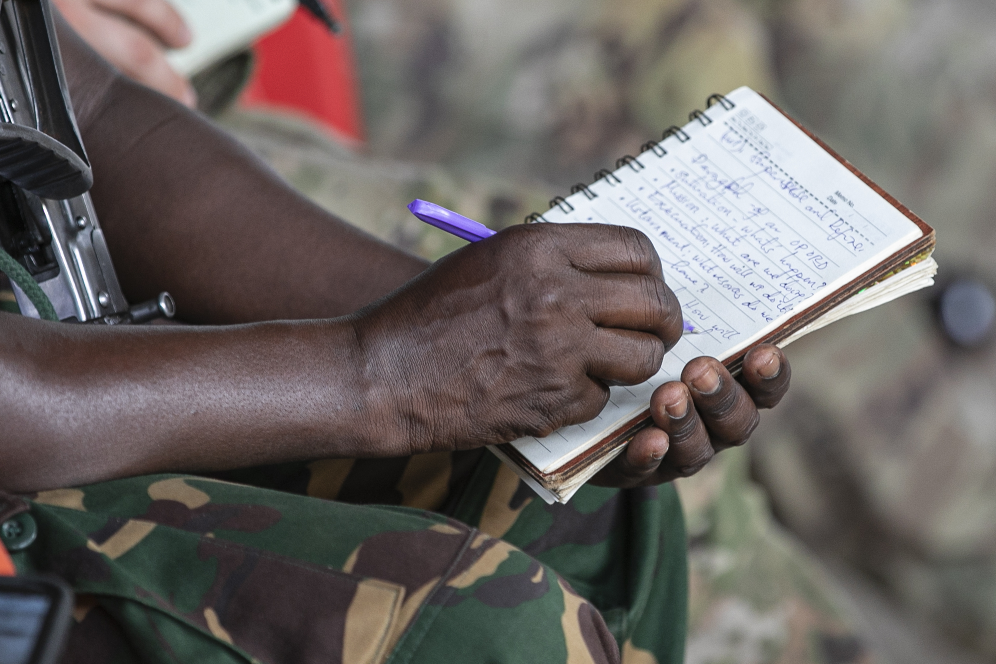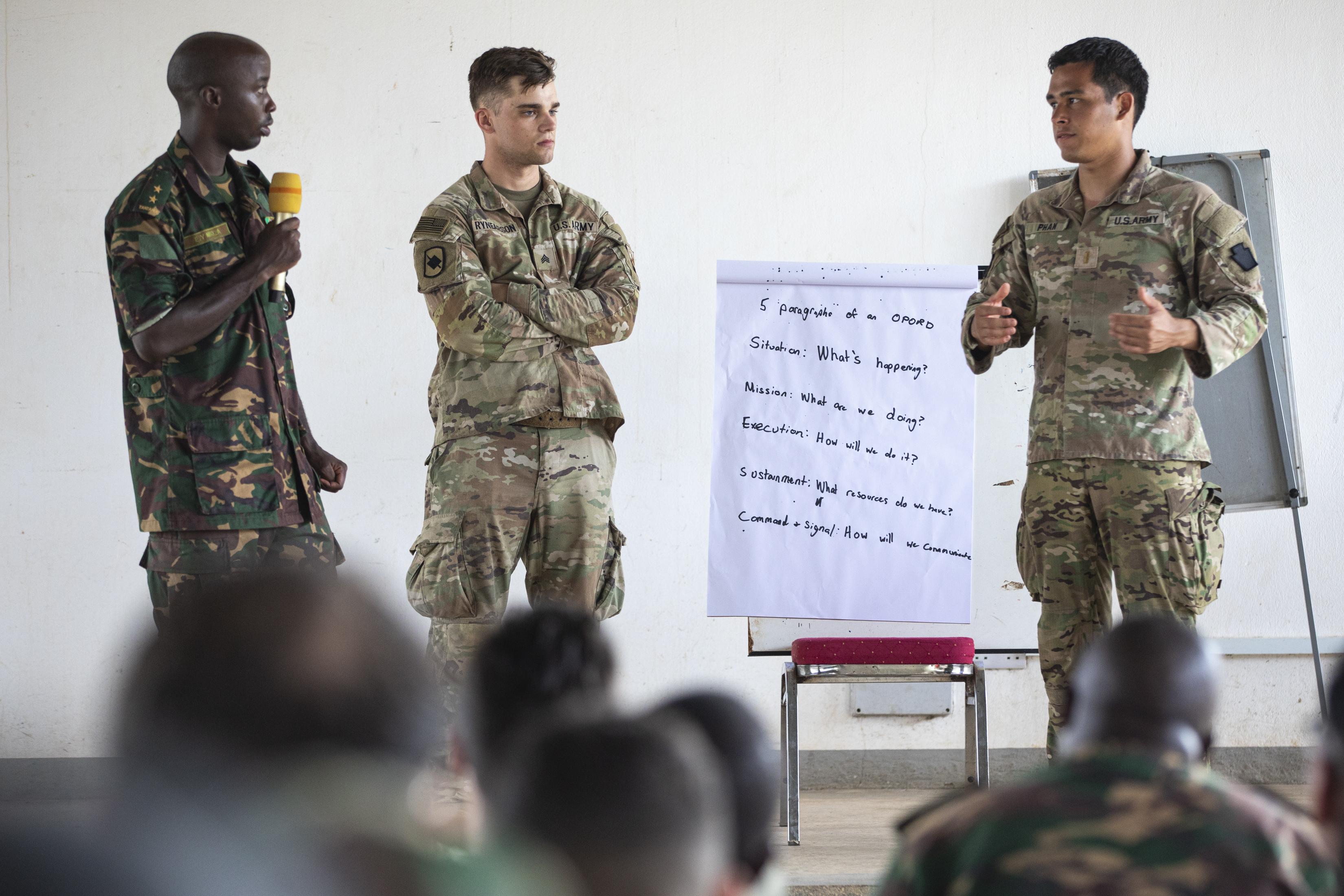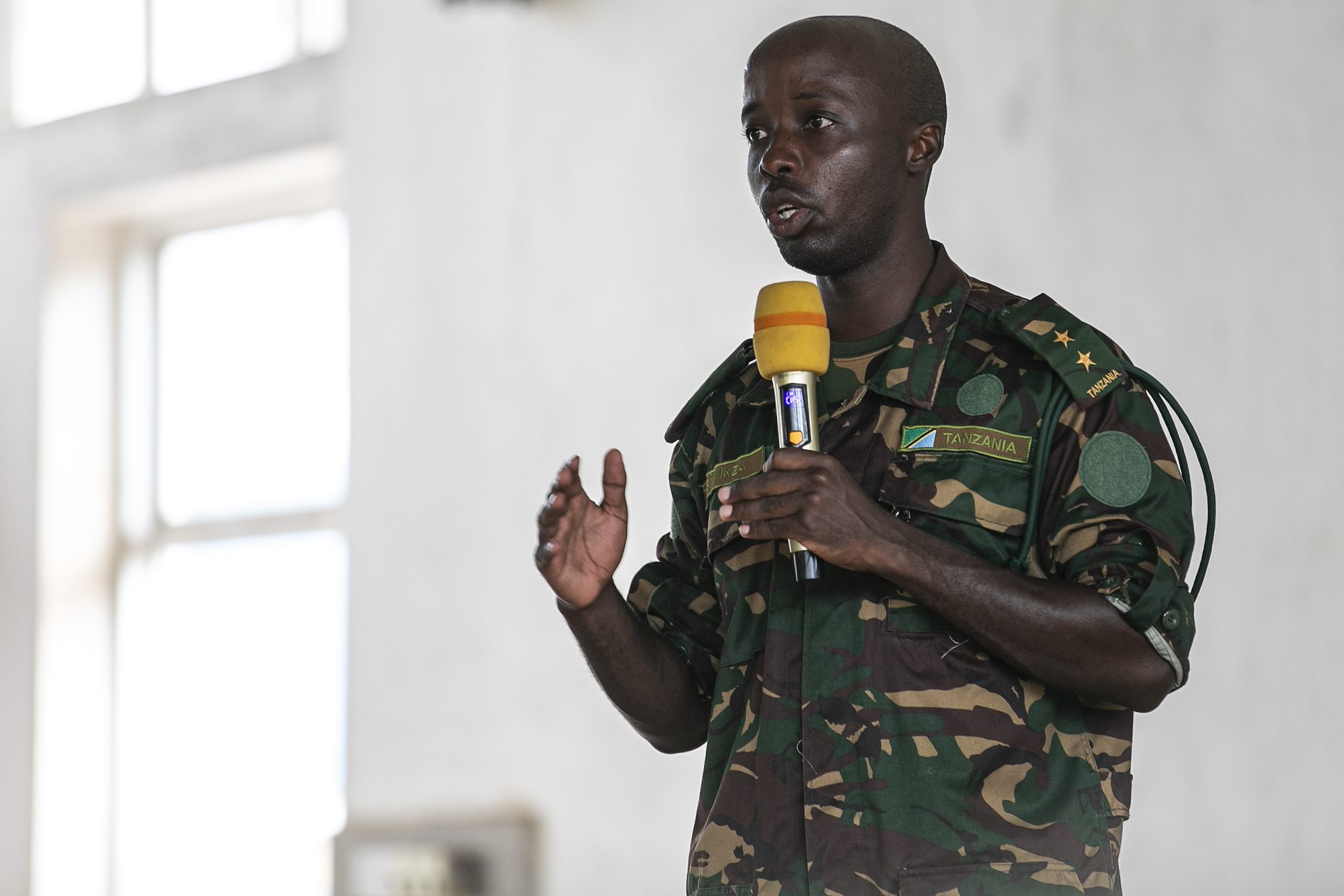 A Tanzania People's Defense Force (TPDF) service member translates during a class on troop leading procedures (TLP) conducted by soldiers with the East Africa Response Force (EARF), assigned to Combined Joint Task Force – Horn of Africa (CJTF-HOA), U.S Army Southern European Task Force, Africa (SETAF-AF) and the Tanzania People's Defense Force (TPDF) during day four of multinational exercise Justified Accord (JA25) at the Msata Military Training Base in Msata, Tanzania, Feb. 14, 2024. JA25 is the premier U.S. Africa Command (USAFRICOM) exercise in East Africa, designed to enhance multinational combat readiness, strengthen crisis response capabilities and empower allies and partners in the region. Led by U.S. Army Southern European Task Force, Africa (SETAF-AF) and hosted in Kenya, Djibouti and Tanzania, JA25 integrates high-intensity training scenarios that sharpen warfighting skills, increase operational reach and enhance the ability to execute complex joint and multinational operations. The exercise runs from Feb. 10–21, 2025. (U.S. Army photo by Sgt. Michael Knight)