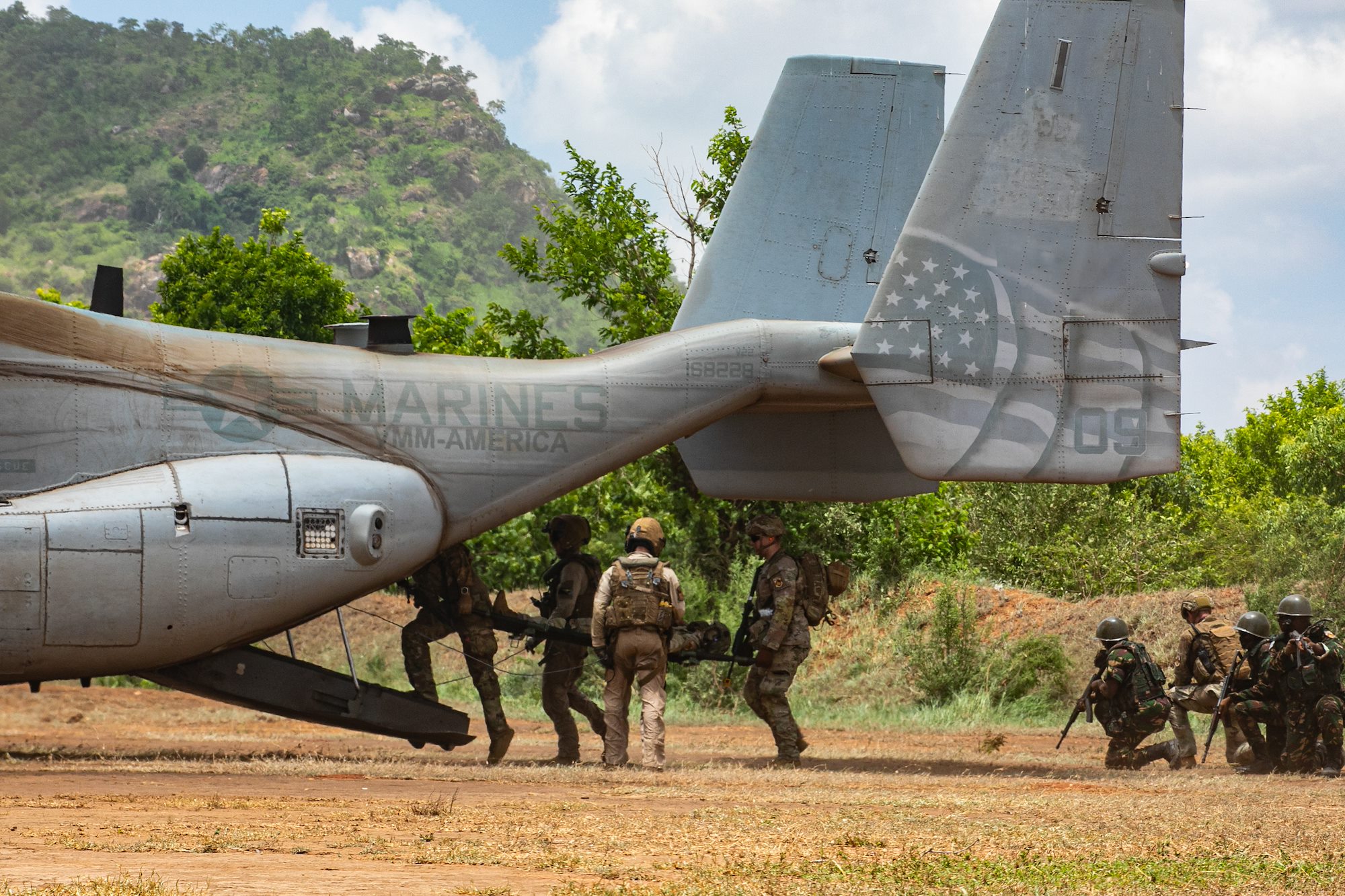 U.S. Army soldiers with the East Africa Response Force (EARF), assigned to Combined Joint Task Force – Horn of Africa (CJTF-HOA) approach a V-22 Osprey to load a casualty with U.S. Army Southern European Task Force, Africa (SETAF-AF) and the Tanzania People’s Defense Force (TPDF) during the culminating field training exercise of exercise Justified Accord 2025 (JA25), at the Msata Military Training Base in Msata, Tanzania, Feb. 15, 2025. JA25 is the premier U.S. Africa Command (USAFRICOM) exercise in East Africa, designed to enhance multinational combat readiness, strengthen crisis response capabilities and empower allies and partners in the region. Led by U.S. Army Southern European Task Force, Africa (SETAF-AF) and hosted by Kenya, Djibouti and Tanzania, JA25 integrates high-intensity training scenarios that sharpen warfighting skills, increase operational reach and enhance the ability to execute complex joint and multinational operations. (U.S. Army photo by Sgt. Michael Knight)