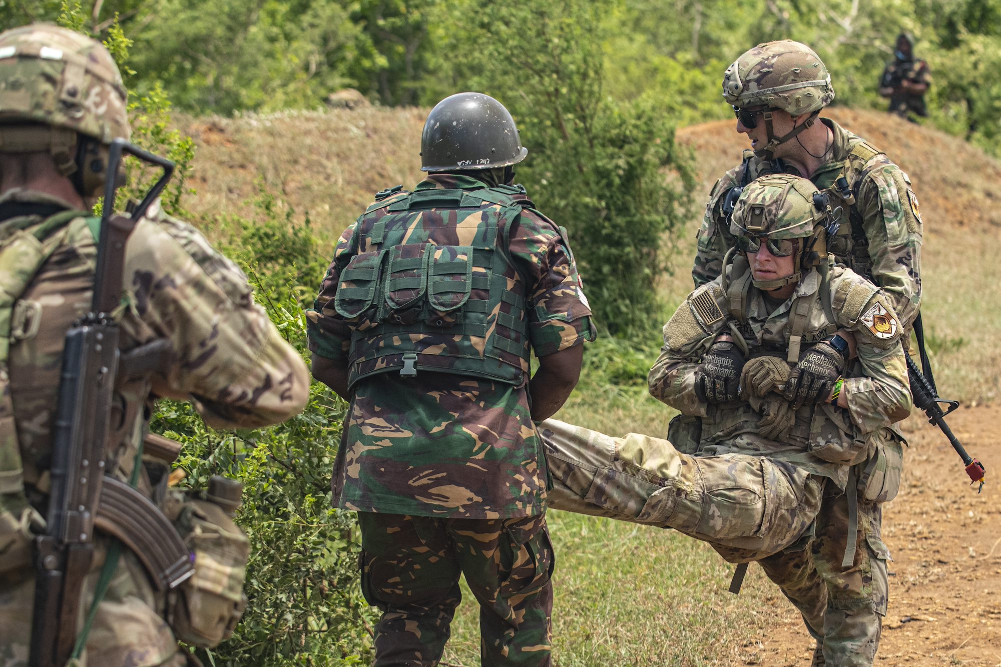 U.S. Army soldiers with the East Africa Response Force (EARF), assigned to Combined Joint Task Force – Horn of Africa (CJTF-HOA), and Tanzania People’s Defense Force (TPDF) service members conduct a buddy-carry during the culminating field training exercise of exercise Justified Accord 2025 (JA25), at the Msata Military Training Base in Msata, Tanzania, Feb. 15, 2025. JA25 is the premier U.S. Africa Command (USAFRICOM) exercise in East Africa, designed to enhance multinational combat readiness, strengthen crisis response capabilities and empower allies and partners in the region. Led by U.S. Army Southern European Task Force, Africa (SETAF-AF) and hosted by Kenya, Djibouti and Tanzania, JA25 integrates high-intensity training scenarios that sharpen warfighting skills, increase operational reach and enhance the ability to execute complex joint and multinational operations. (U.S. Army photo by Sgt. Michael Knight)