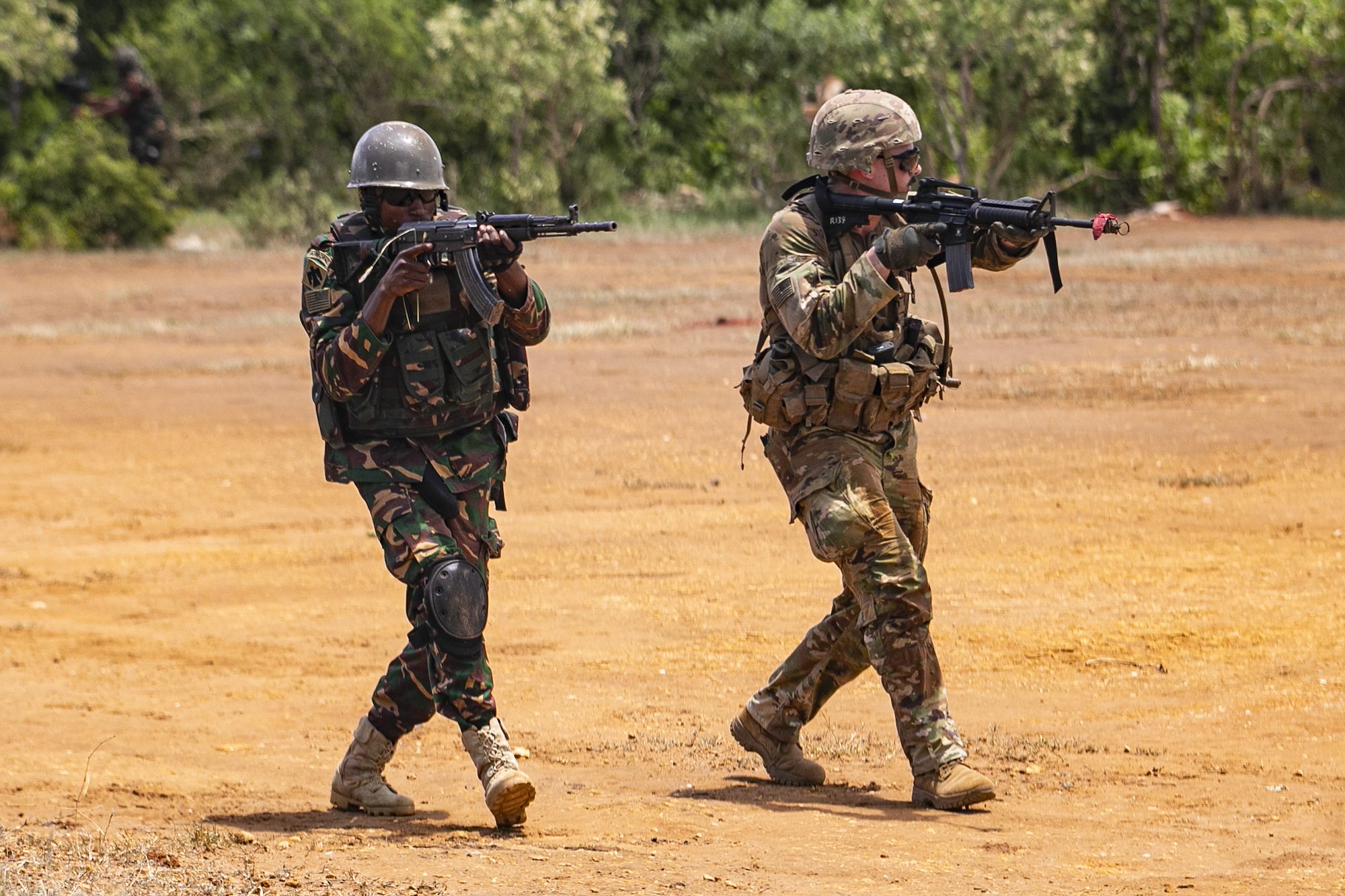 A U.S. Army soldier with the East Africa Response Force (EARF), assigned to Combined Joint Task Force – Horn of Africa (CJTF-HOA) and a Tanzania People’s Defense Force (TPDF) service member advance to their position after neutralizing an enemy opposition during the culminating field training exercise of exercise Justified Accord 2025 (JA25), at the Msata Military Training Base in Msata, Tanzania, Feb. 15, 2025. JA25 is the premier U.S. Africa Command (USAFRICOM) exercise in East Africa, designed to enhance multinational combat readiness, strengthen crisis response capabilities and empower allies and partners in the region. Led by U.S. Army Southern European Task Force, Africa (SETAF-AF) and hosted by Kenya, Djibouti and Tanzania, JA25 integrates high-intensity training scenarios that sharpen warfighting skills, increase operational reach and enhance the ability to execute complex joint and multinational operations. (U.S. Army photo by Sgt. Michael Knight)