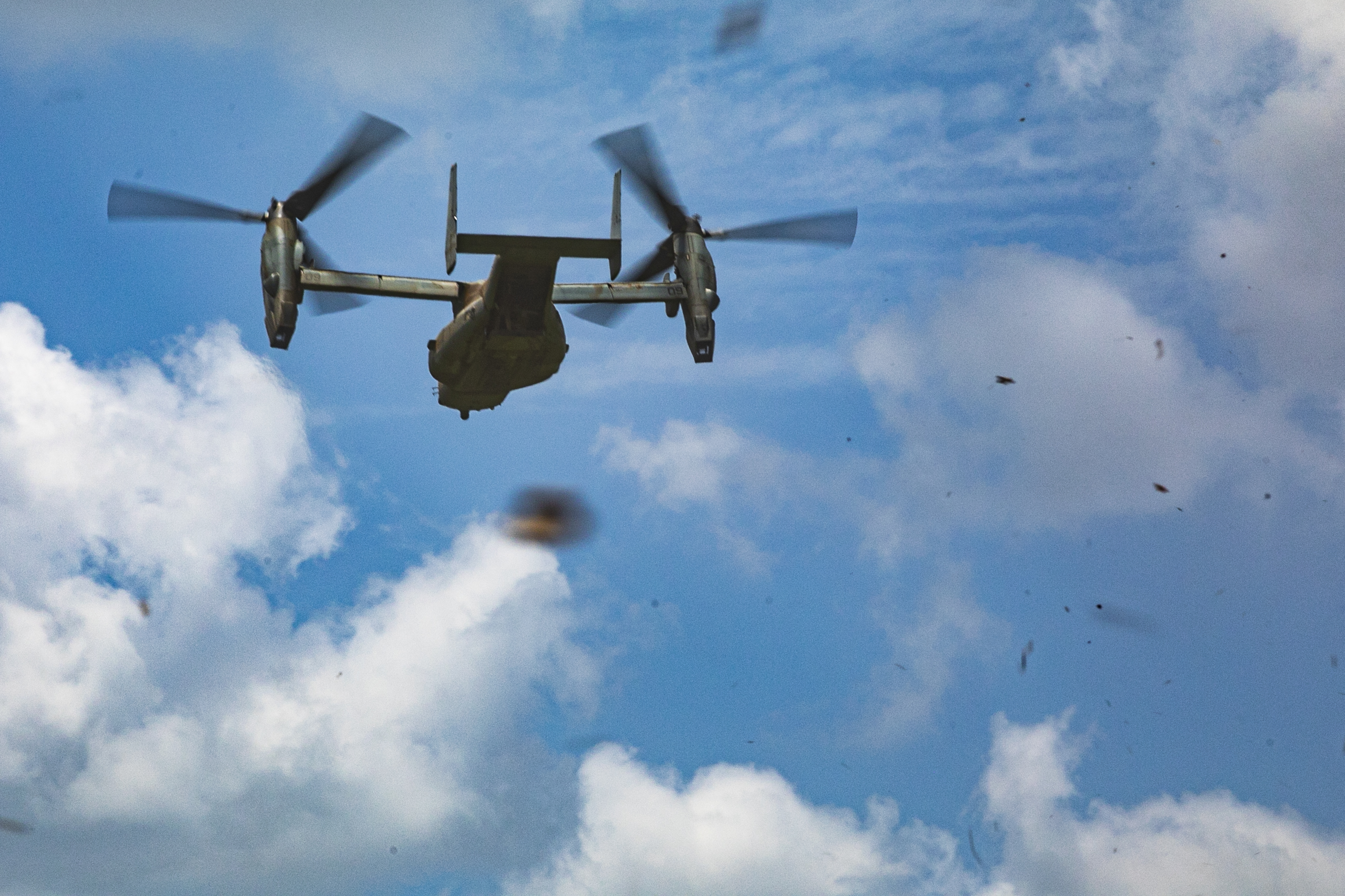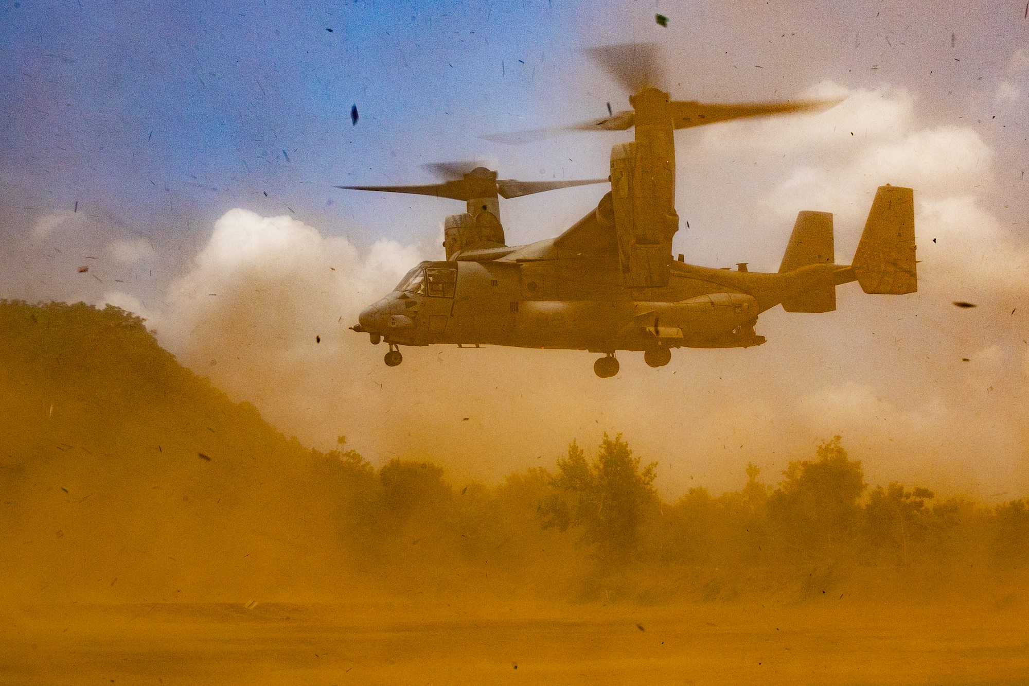 A U.S. Marine Corps V-22 Osprey, assigned to Combined Joint Task Force – Horn of Africa (CJTF-HOA) departs, concluding the field training exercise of exercise Justified Accord 2025 (JA25), at the Msata Military Training Base in Msata, Tanzania, Feb. 15, 2025. JA25 is the premier U.S. Africa Command (USAFRICOM) exercise in East Africa, designed to enhance multinational combat readiness, strengthen crisis response capabilities and empower allies and partners in the region. Led by U.S. Army Southern European Task Force, Africa (SETAF-AF) and hosted by Kenya, Djibouti and Tanzania, JA25 integrates high-intensity training scenarios that sharpen warfighting skills, increase operational reach and enhance the ability to execute complex joint and multinational operations. (U.S. Army photo by Sgt. Michael Knight)