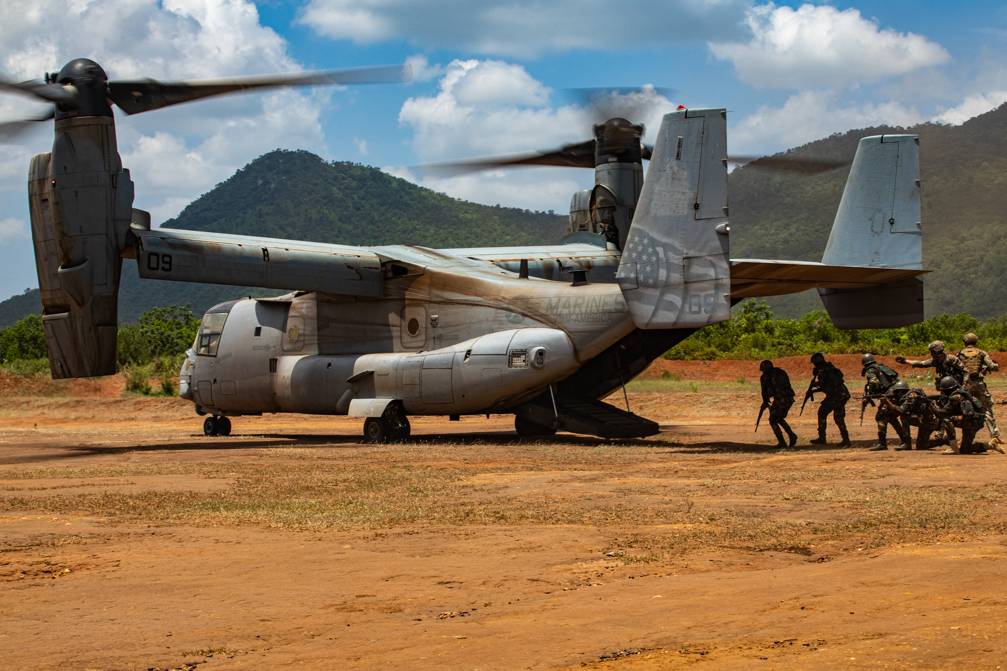 U.S. Army soldiers with the East Africa Response Force (EARF), assigned to Combined Joint Task Force – Horn of Africa (CJTF-HOA) and Tanzania People’s Defense Force (TPDF) service members approach a U.S. Marine VM-22 Osprey to load a casualty with U.S Army Southern European Task Force, Africa (SETAF-AF) and Tanzania people's defence force (TPDF) during the culminating field training exercise of exercise Justified Accord 2025 (JA25), at the Msata Military Training Base in Msata, Tanzania, Feb. 15, 2025. JA25 is the premier U.S. Africa Command (USAFRICOM) exercise in East Africa, designed to enhance multinational combat readiness, strengthen crisis response capabilities and empower allies and partners in the region. Led by U.S. Army Southern European Task Force, Africa (SETAF-AF) and hosted by Kenya, Djibouti and Tanzania, JA25 integrates high-intensity training scenarios that sharpen warfighting skills, increase operational reach and enhance the ability to execute complex joint and multinational operations. (U.S. Army photo by Sgt. Michael Knight)