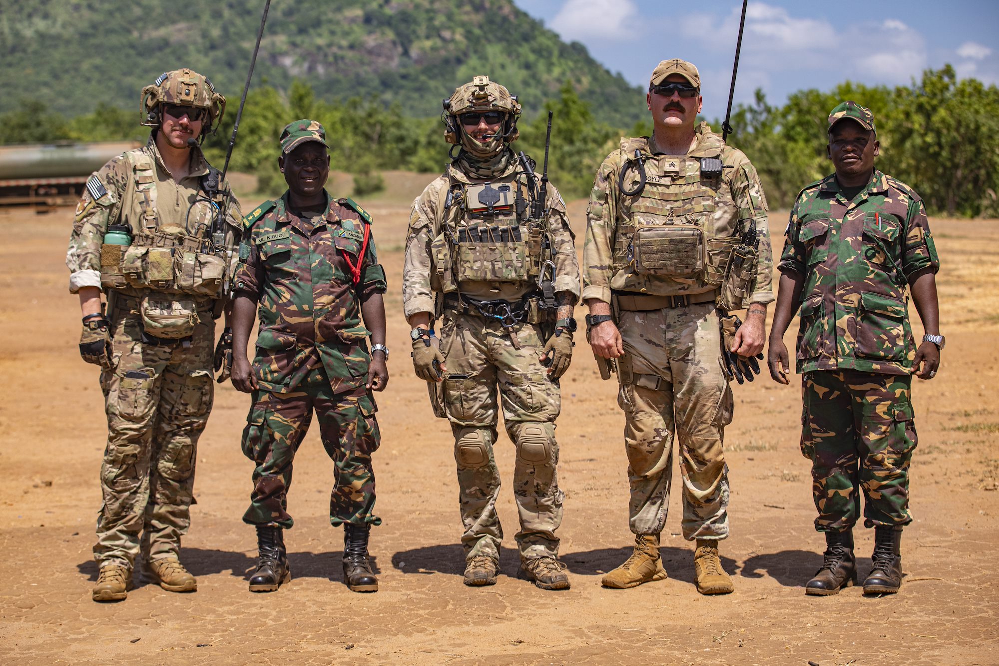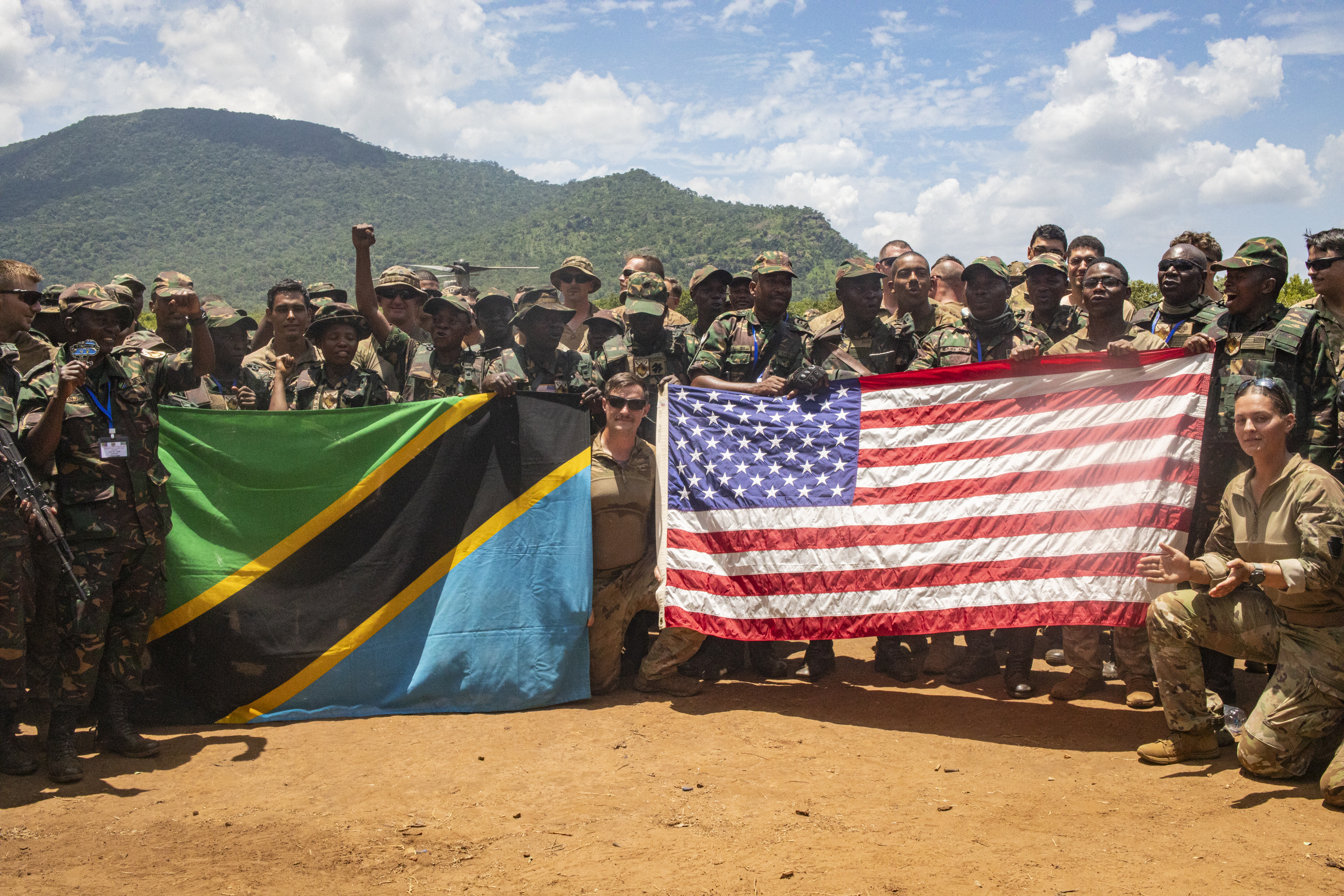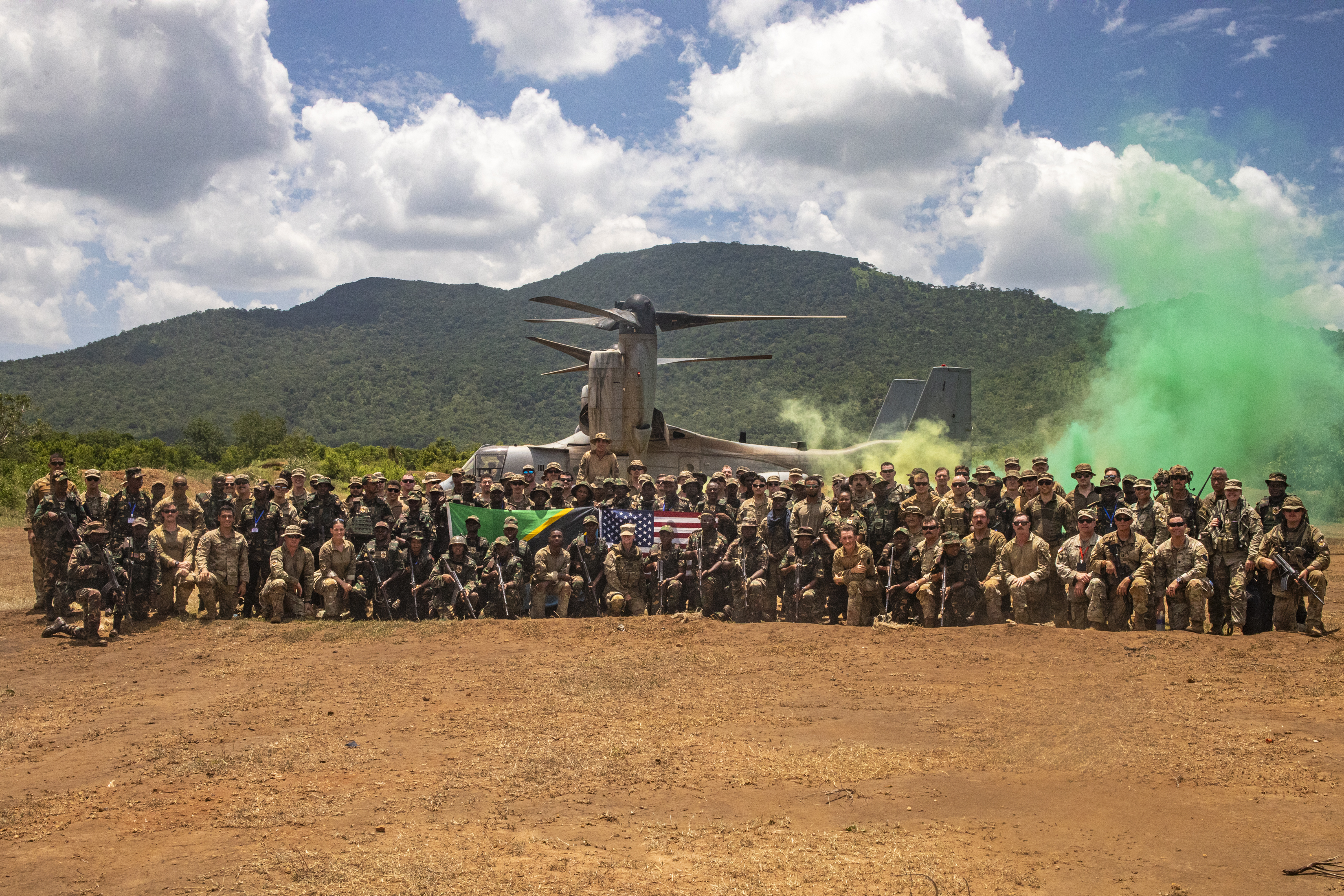 U.S. Army soldiers with the East Africa Response Force (EARF), assigned to Combined Joint Task Force – Horn of Africa (CJTF-HOA), join U.S. Army Southern European Task Force, Africa (SETAF-AF) and Tanzania People’s Defense Force (TPDF) service members for a group photo during the culminating field training exercise of exercise Justified Accord 2025 (JA25), at the Msata Military Training Base in Msata, Tanzania, Feb. 15, 2025. JA25 is the premier U.S. Africa Command (USAFRICOM) exercise in East Africa, designed to enhance multinational combat readiness, strengthen crisis response capabilities and empower allies and partners in the region. Led by U.S. Army Southern European Task Force, Africa (SETAF-AF) and hosted by Kenya, Djibouti and Tanzania, JA25 integrates high-intensity training scenarios that sharpen warfighting skills, increase operational reach and enhance the ability to execute complex joint and multinational operations. (U.S. Army photo by Sgt. Michael Knight)