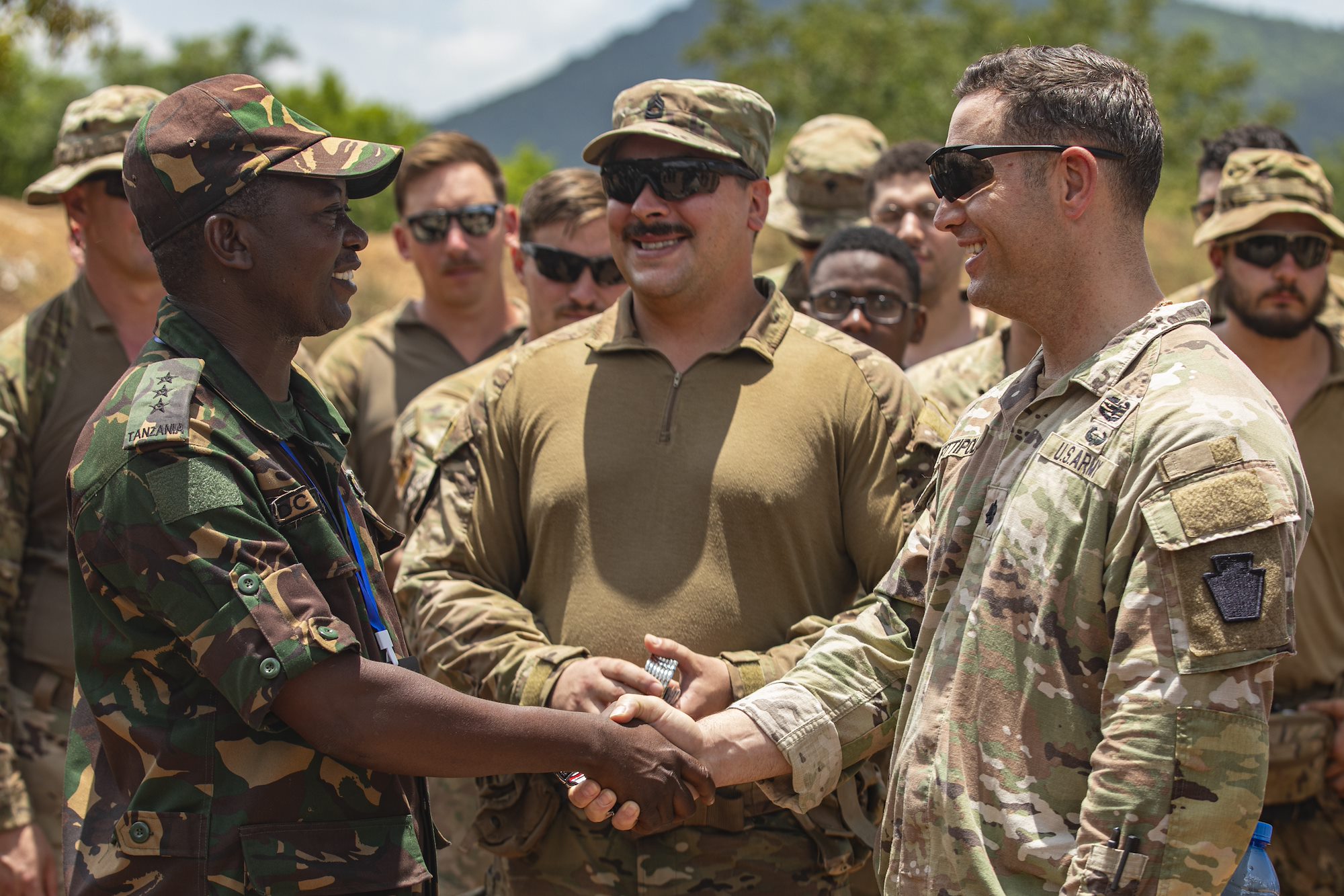 U.S. Army soldiers with the East Africa Response Force (EARF), assigned to Combined Joint Task Force – Horn of Africa (CJTF-HOA), shake hands with a member of the Tanzania People's Defence Force after receiving a coin at the culminating field training exercise of exercise Justified Accord (JA25), Feb. 15, 2025 at the Msata military training base in Msata, Tanzania. The exercise JA25, is the premier U.S. Africa Command (USAFRICOM) exercise in East Africa, designed to enhance multinational combat readiness, strengthen crisis response capabilities and empower allies and partners in the region. Led by U.S. Army Southern European Task Force, Africa (SETAF-AF) and hosted in Kenya, Djibouti and Tanzania, JA25 integrates high-intensity training scenarios that sharpen warfighting skills, increase operational reach and enhance the ability to execute complex joint and multinational operations. The exercise runs from Feb. 10–21, 2025. (U.S. Army photo by Sgt. Michael Knight)