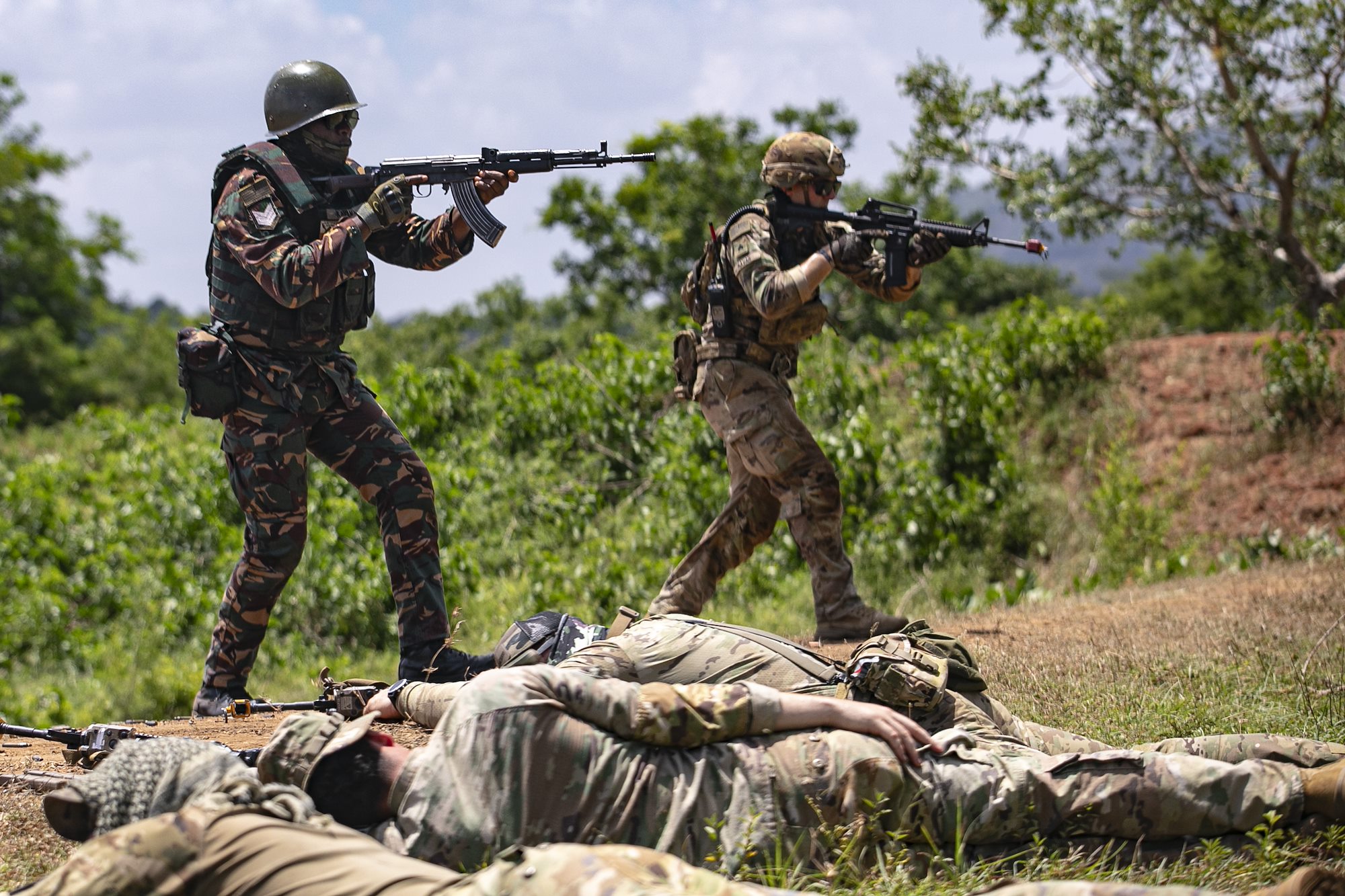 A U.S. Army soldier and a Tanzania People’s Defense Force (TPDF) service member provide security while on patrol during the culminating field training exercise of exercise Justified Accord 2025 (JA25), at the Msata Military Training Base in Msata, Tanzania, Feb. 15, 2025. JA25 is the premier U.S. Africa Command (USAFRICOM) exercise in East Africa, designed to enhance multinational combat readiness, strengthen crisis response capabilities and empower allies and partners in the region. Led by U.S. Army Southern European Task Force, Africa (SETAF-AF) and hosted by Kenya, Djibouti and Tanzania, JA25 integrates high-intensity training scenarios that sharpen warfighting skills, increase operational reach and enhance the ability to execute complex joint and multinational operations. (U.S. Army photo by Sgt. Michael Knight)