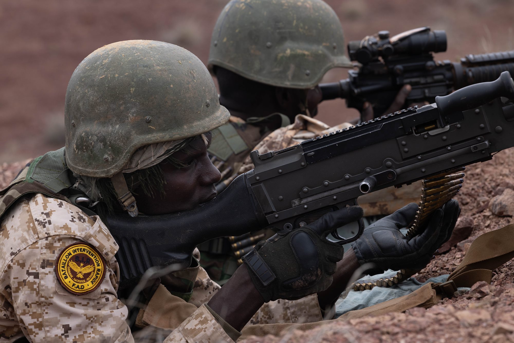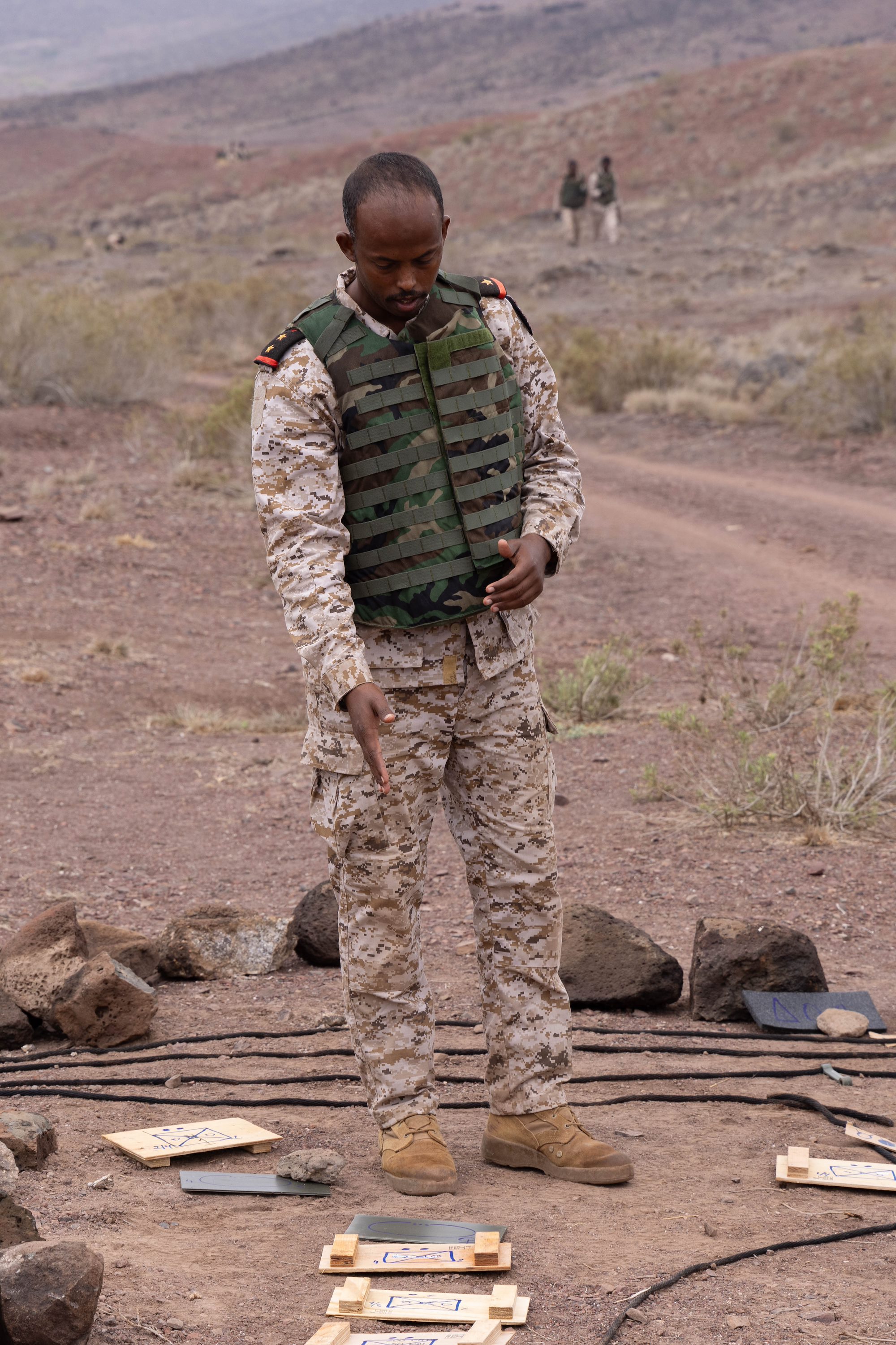 A Djiboutian Battalion Intervention Rapide soldier provides security during exercise Justified Accord 2025 at Arta Range Complex, Djibouti, Feb. 11, 2025. JA25 is the premier U.S. Africa Command (USAFRICOM) exercise in East Africa, designed to enhance multinational combat readiness, strengthen crisis response capabilities and empower allies and partners in the region. Led by U.S. Army Southern European Task Force, Africa (SETAF-AF) and hosted in Kenya, Djibouti and Tanzania, JA25 integrates high-intensity training scenarios that sharpen warfighting skills, increase operational reach and enhance the ability to execute complex joint and multinational operations. The exercise runs from Feb. 10–21, 2025. (U.S. Army photo by Cpl. Joey Ke)