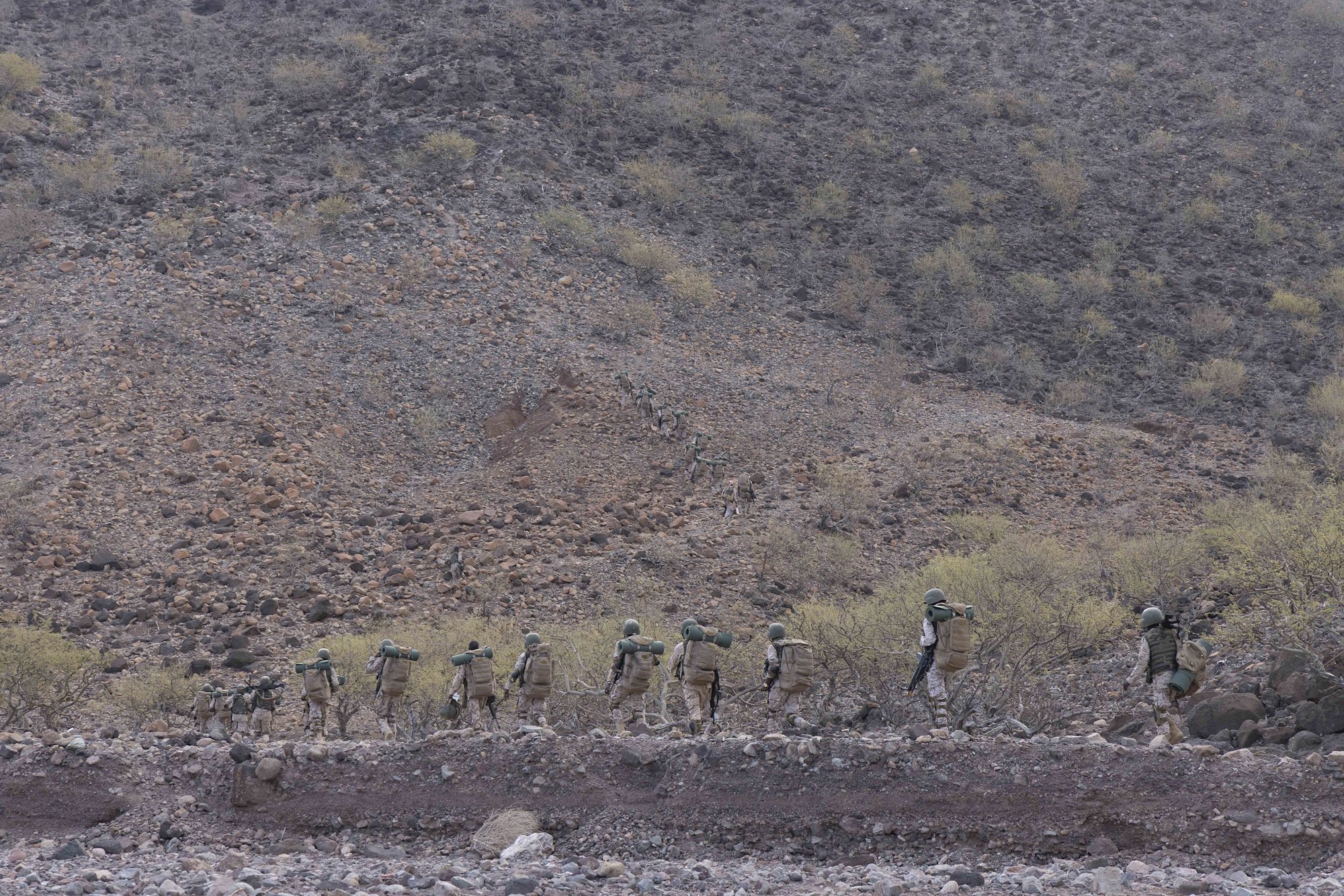 Djiboutian Battalion Intervention Rapide soldiers ruck to their firing positions during exercise Justified Accord 2025 at Arta Range Complex, Djibouti, Feb. 11, 2025. JA25 is the premier U.S. Africa Command (USAFRICOM) exercise in East Africa, designed to enhance multinational combat readiness, strengthen crisis response capabilities and empower allies and partners in the region. Led by U.S. Army Southern European Task Force, Africa (SETAF-AF) and hosted in Kenya, Djibouti and Tanzania, JA25 integrates high-intensity training scenarios that sharpen warfighting skills, increase operational reach and enhance the ability to execute complex joint and multinational operations. The exercise runs from Feb. 10–21, 2025. (U.S. Army photo by Cpl. Joey Ke)