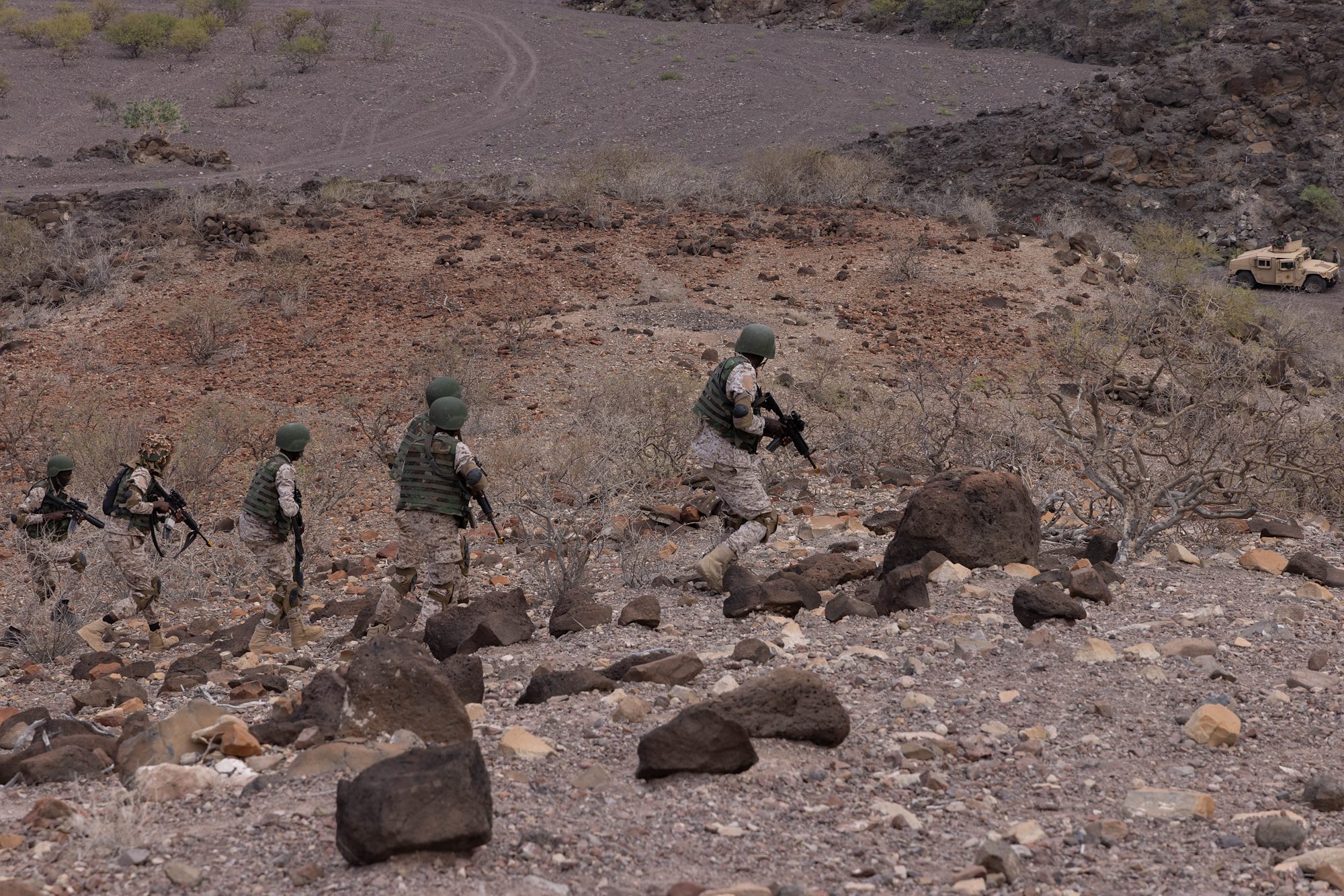 Djiboutian Battalion Intervention Rapide soldiers ruck to firing positions during exercise Justified Accord 2025 at Arta Range Complex, Djibouti, Feb. 11, 2025. JA25 is the premier U.S. Africa Command (USAFRICOM) exercise in East Africa, designed to enhance multinational combat readiness, strengthen crisis response capabilities and empower allies and partners in the region. Led by U.S. Army Southern European Task Force, Africa (SETAF-AF) and hosted in Kenya, Djibouti and Tanzania, JA25 integrates high-intensity training scenarios that sharpen warfighting skills, increase operational reach and enhance the ability to execute complex joint and multinational operations. The exercise runs from Feb. 10–21, 2025. (U.S. Army photo by Cpl. Joey Ke)