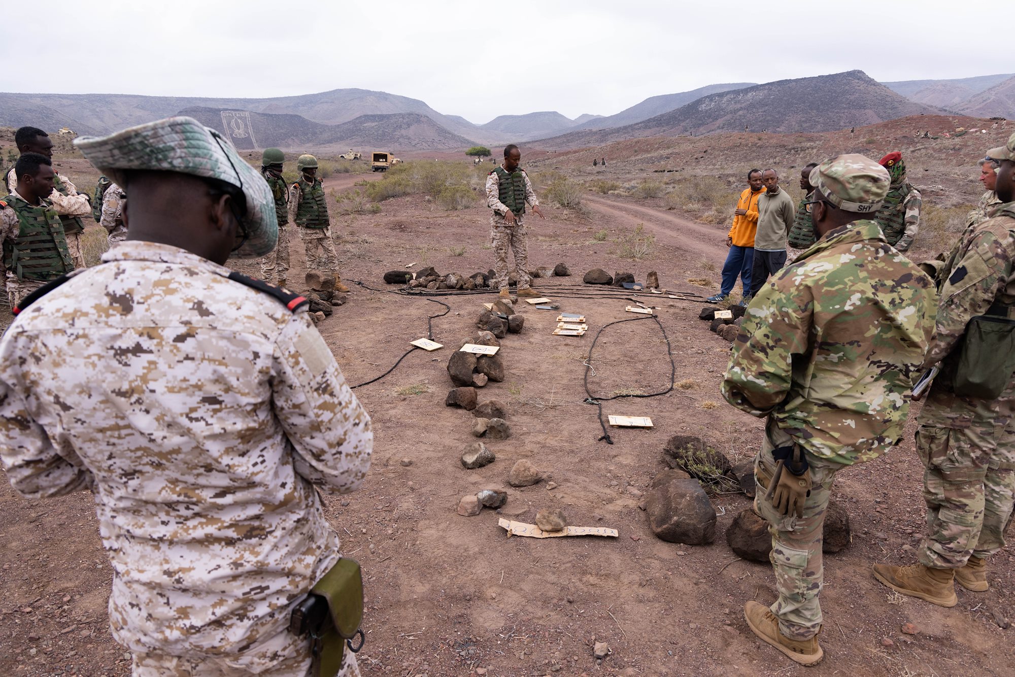 A Djiboutian Battalion Intervention Rapide soldier reviews a plan with his team during exercise Justified Accord 2025 at Arta Range Complex, Djibouti, Feb. 11, 2025. JA25 is the premier U.S. Africa Command (USAFRICOM) exercise in East Africa, designed to enhance multinational combat readiness, strengthen crisis response capabilities and empower allies and partners in the region. Led by U.S. Army Southern European Task Force, Africa (SETAF-AF) and hosted in Kenya, Djibouti and Tanzania, JA25 integrates high-intensity training scenarios that sharpen warfighting skills, increase operational reach and enhance the ability to execute complex joint and multinational operations. The exercise runs from Feb. 10–21, 2025. (U.S. Army photo by Cpl. Joey Ke)