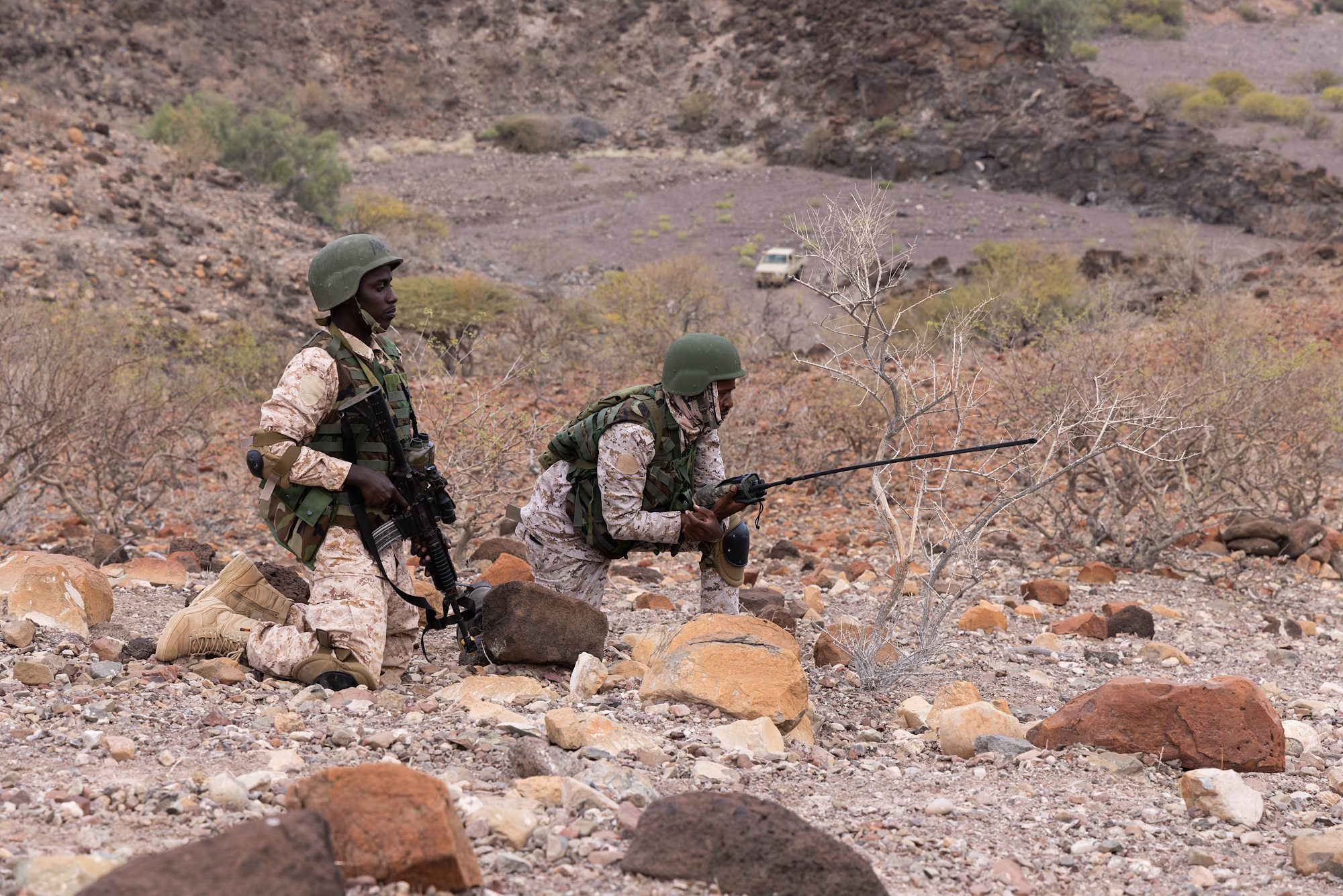Djiboutian Battalion Intervention Rapide soldiers establish security during exercise Justified Accord 2025 at Arta Range Complex, Djibouti, Feb. 11, 2025. JA25 is the premier U.S. Africa Command (USAFRICOM) exercise in East Africa, designed to enhance multinational combat readiness, strengthen crisis response capabilities and empower allies and partners in the region. Led by U.S. Army Southern European Task Force, Africa (SETAF-AF) and hosted in Kenya, Djibouti and Tanzania, JA25 integrates high-intensity training scenarios that sharpen warfighting skills, increase operational reach and enhance the ability to execute complex joint and multinational operations. The exercise runs from Feb. 10–21, 2025. (U.S. Army photo by Cpl. Joey Ke)