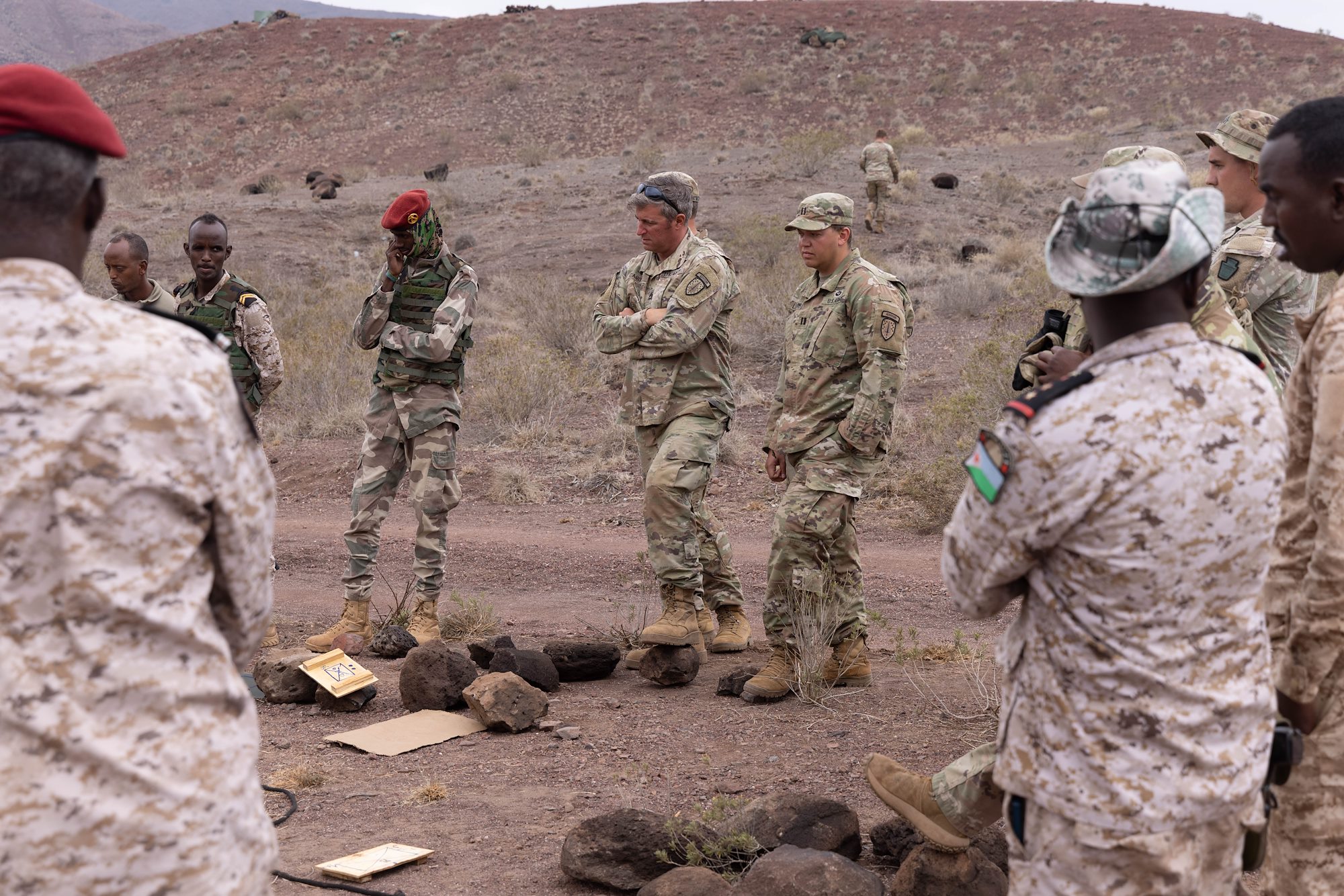 Djiboutian Battalion Intervention Rapide soldiers review a plan with his team during exercise Justified Accord 2025 at Arta Range Complex, Djibouti, Feb. 11, 2025. JA25 is the premier U.S. Africa Command (USAFRICOM) exercise in East Africa, designed to enhance multinational combat readiness, strengthen crisis response capabilities and empower allies and partners in the region. Led by U.S. Army Southern European Task Force, Africa (SETAF-AF) and hosted in Kenya, Djibouti and Tanzania, JA25 integrates high-intensity training scenarios that sharpen warfighting skills, increase operational reach and enhance the ability to execute complex joint and multinational operations. The exercise runs from Feb. 10–21, 2025. (U.S. Army photo by Cpl. Joey Ke)