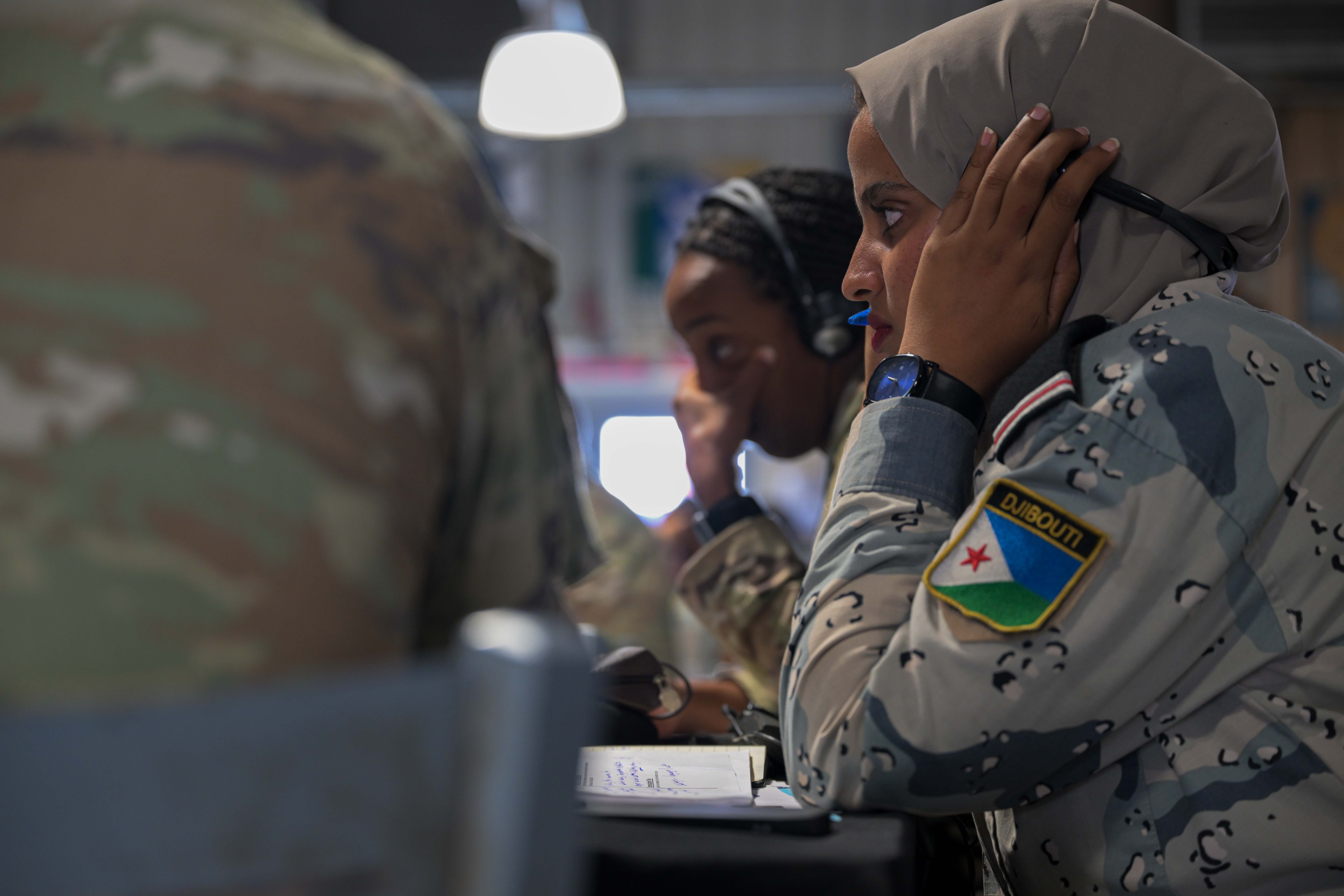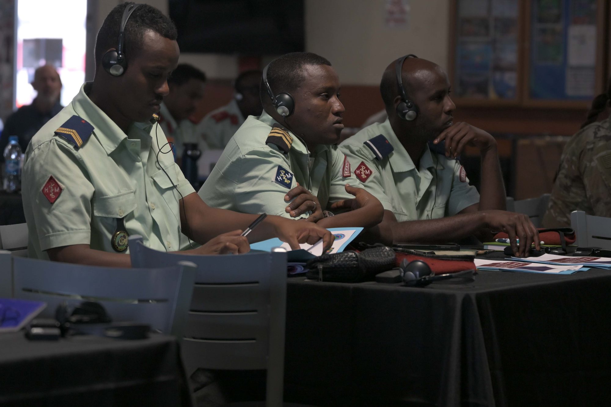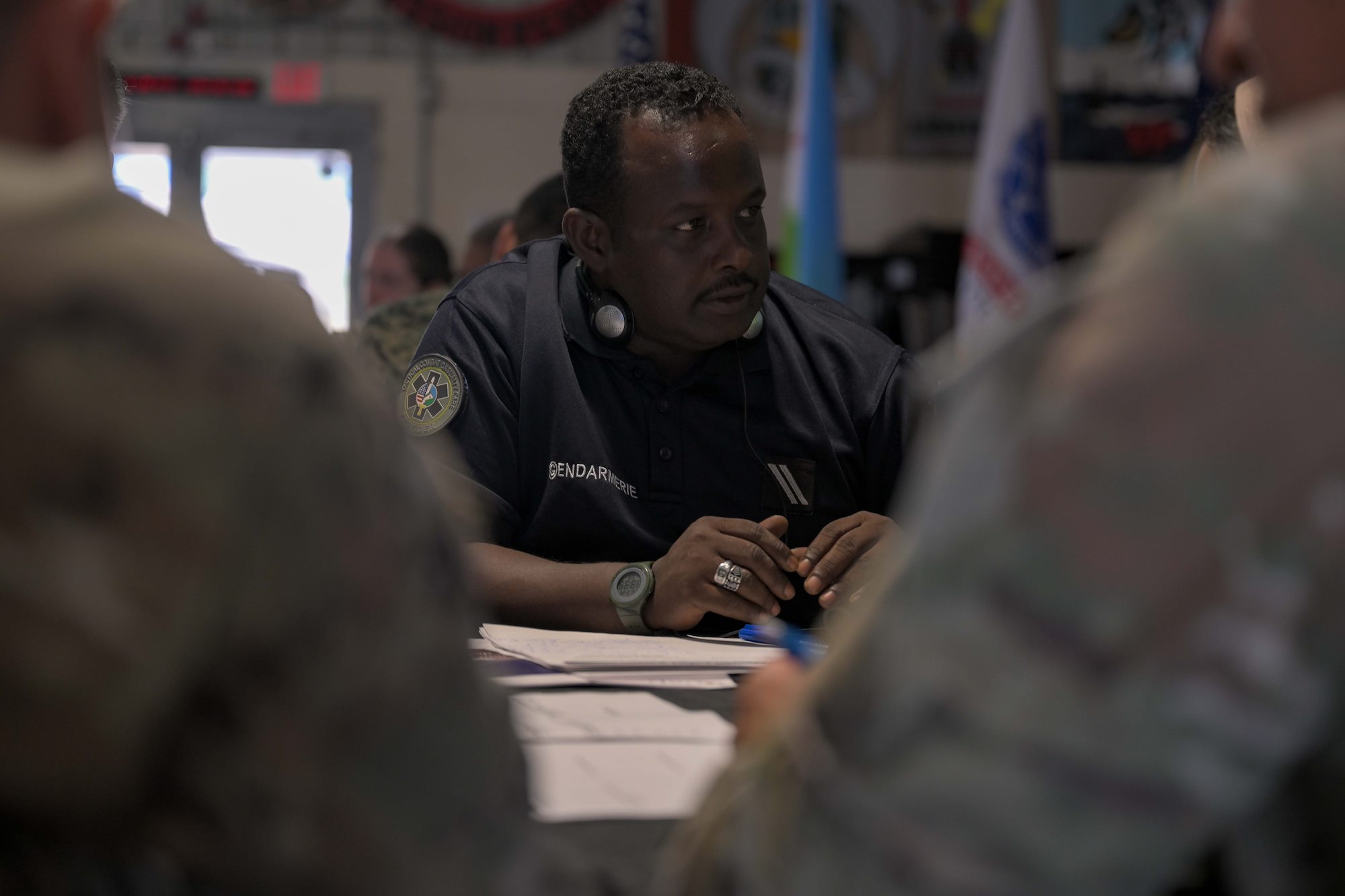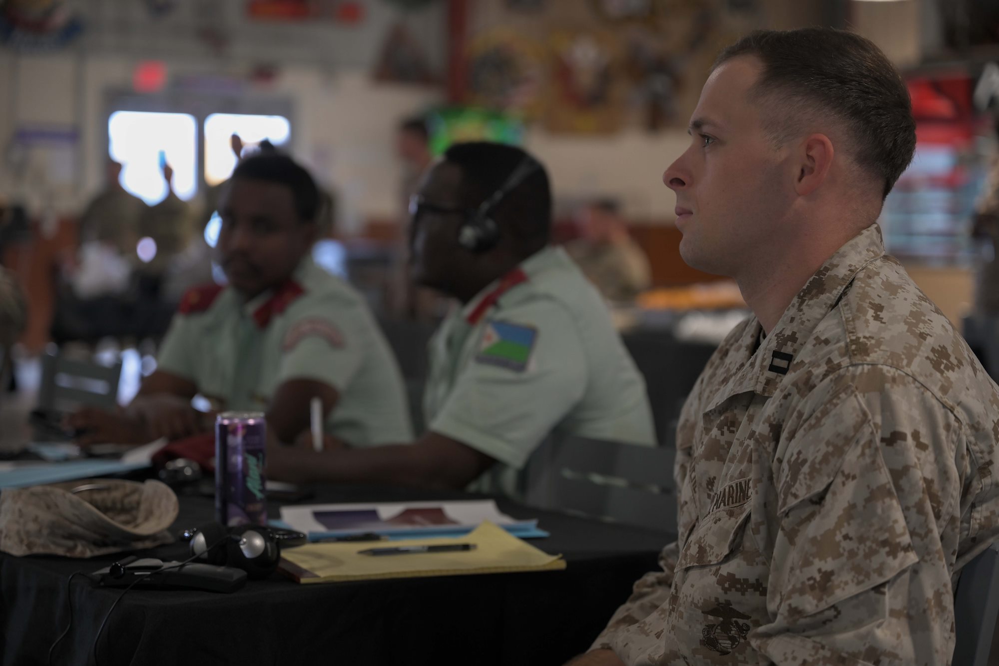 A U.S. Marine listens during a group discussion amongst allies, partners and service members during a Fundamentals of Global Health Engagement course at Camp Lemonnier, Djibouti, Feb. 25, 2025. The three-day course was centered on establishing and improving the awareness level and understanding of U.S. Department of Defense global health engagements with partners and allies. (U.S. Air Force photo by Airman 1st Class Synsere Howard)