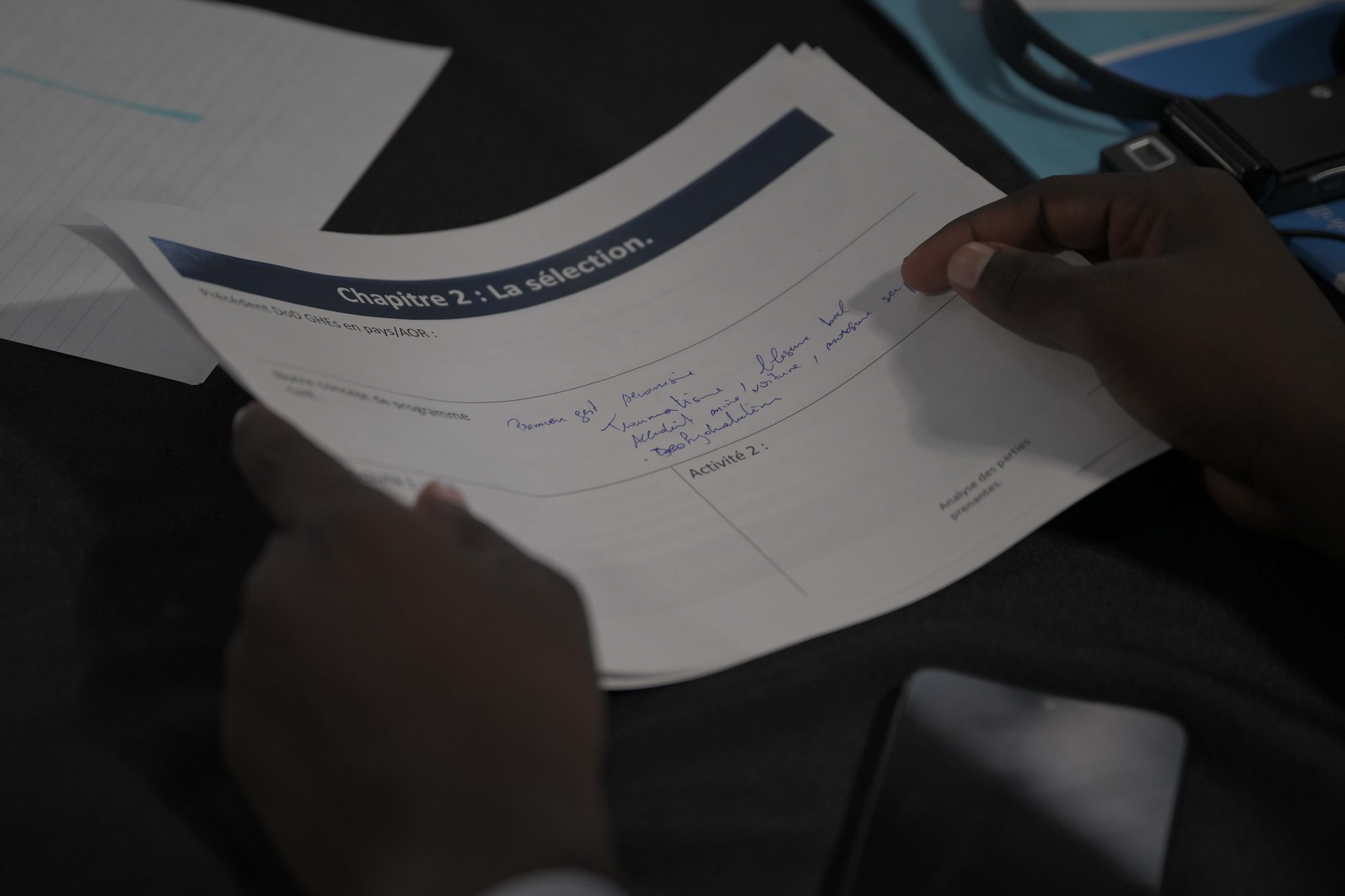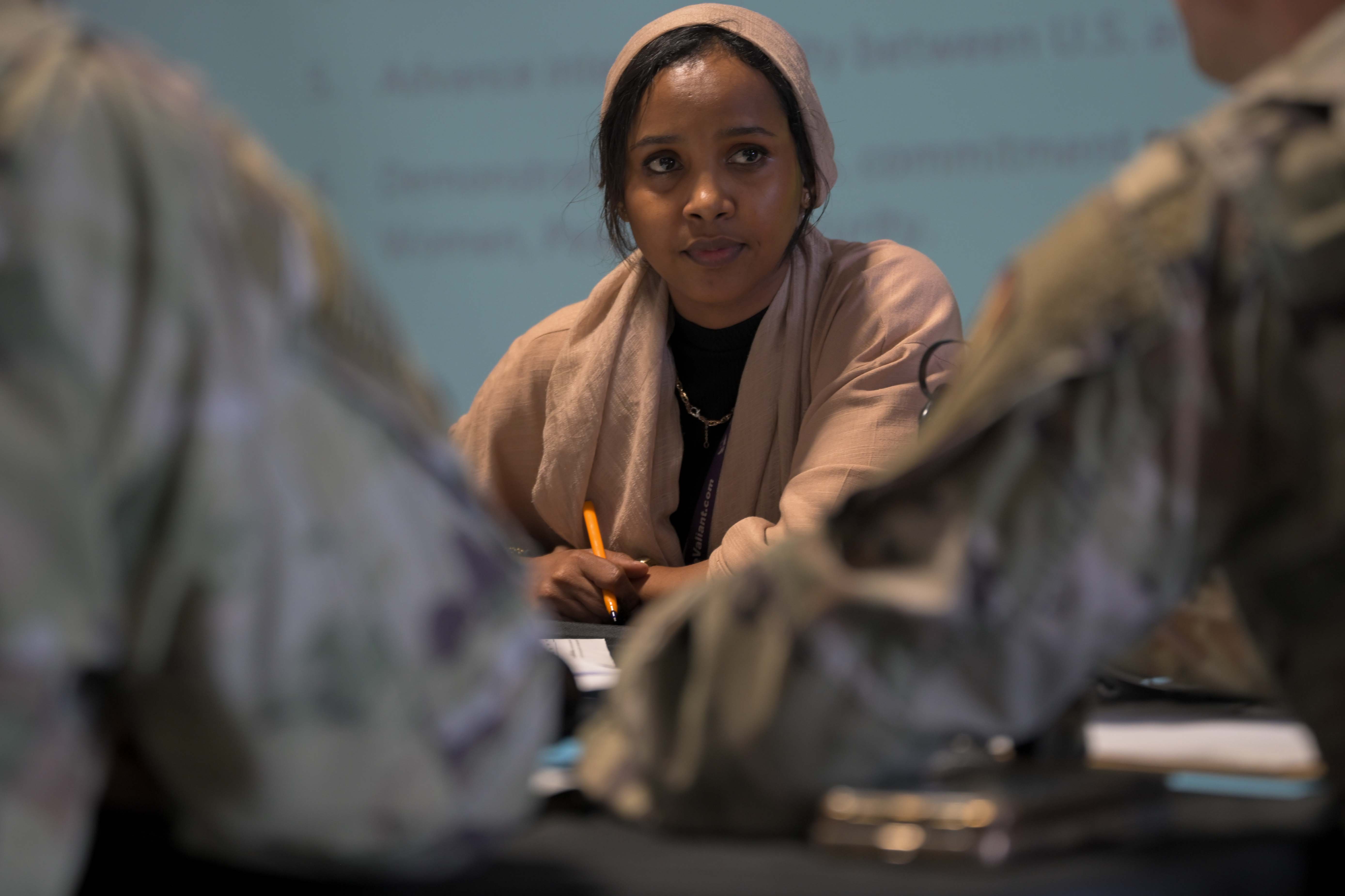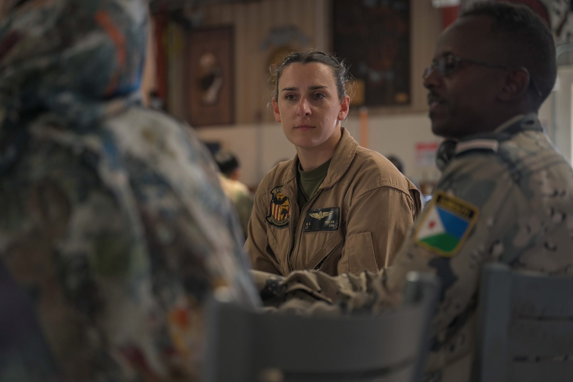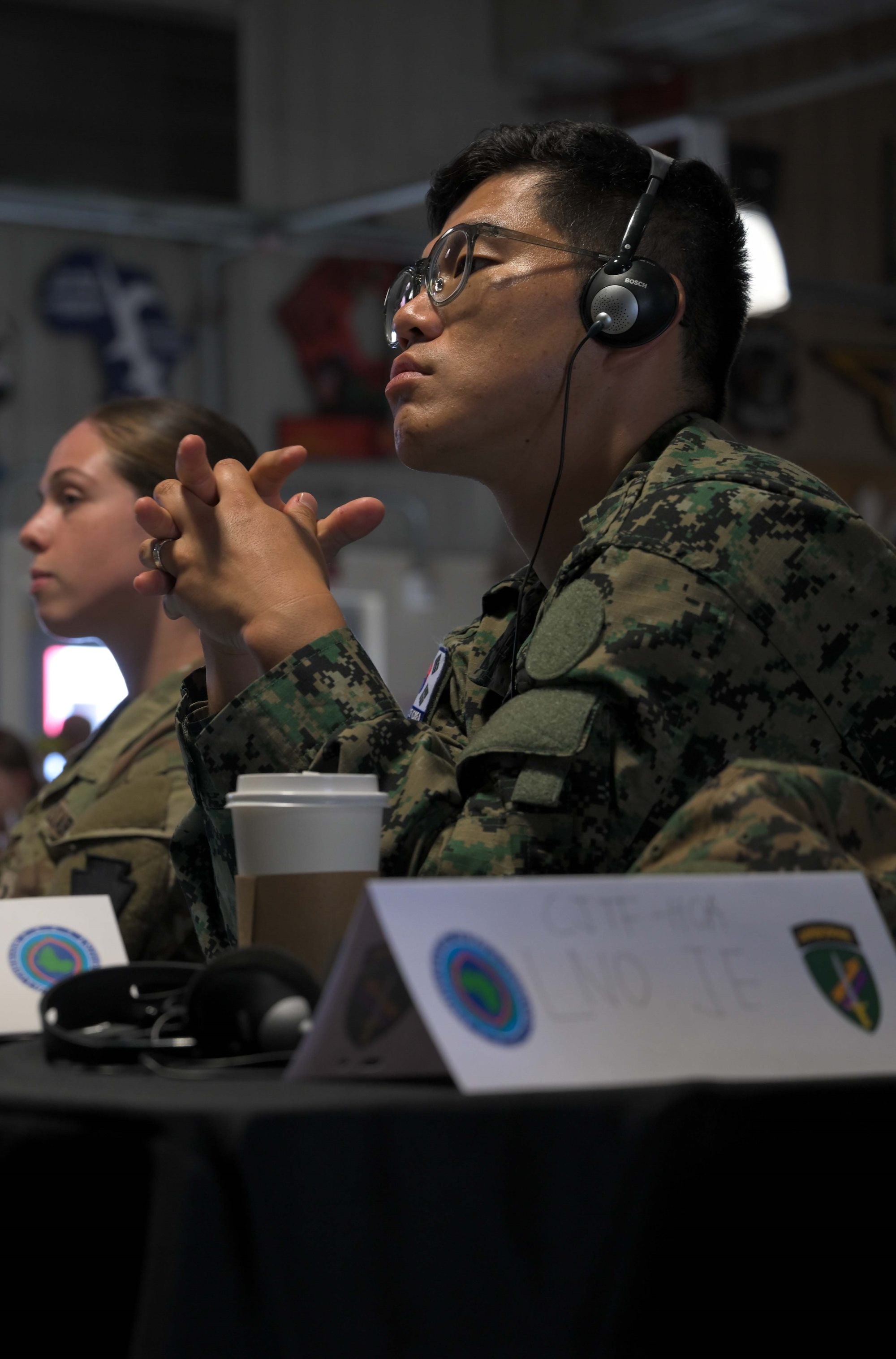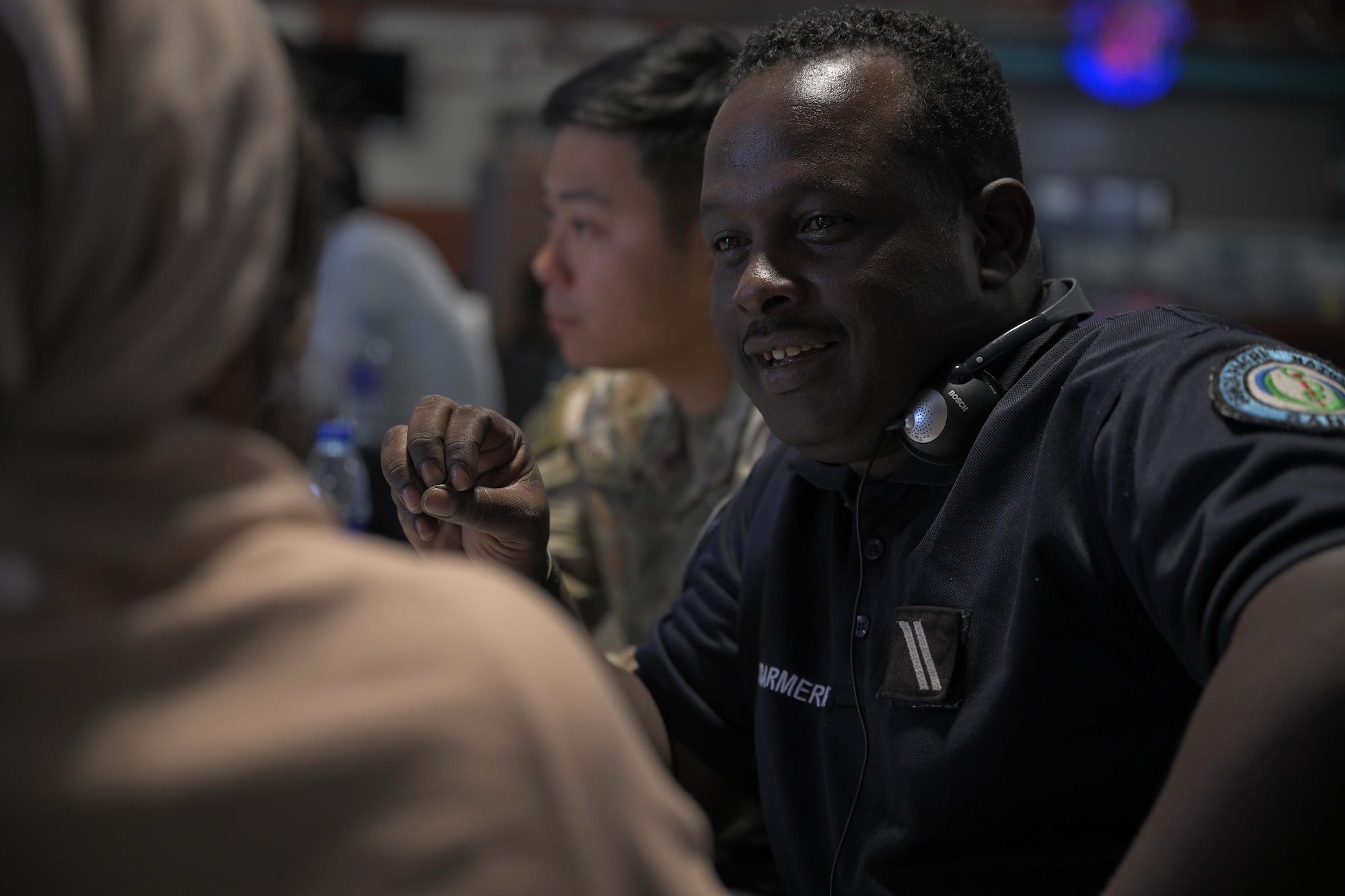 A U.S. Marine listens during a group discussion amongst allies, partners and service members during a Fundamentals of Global Health Engagement course at Camp Lemonnier, Djibouti, Feb. 25, 2025. The three-day course was centered on establishing and improving the awareness level and understanding of U.S. Department of Defense global health engagements with partners and allies. (U.S. Air Force photo by Airman 1st Class Synsere Howard)
