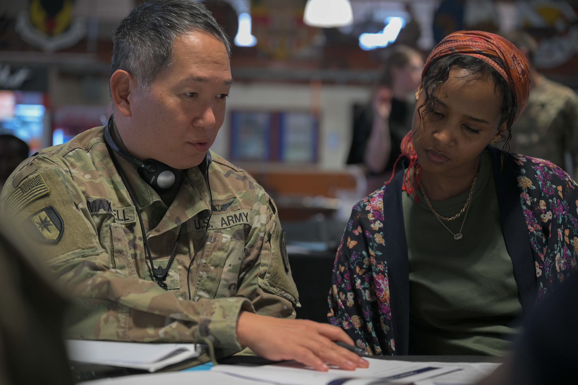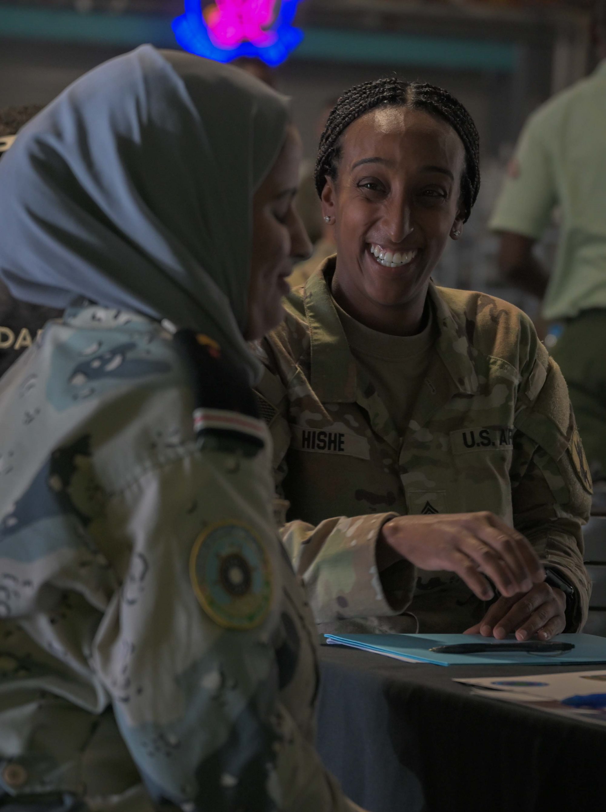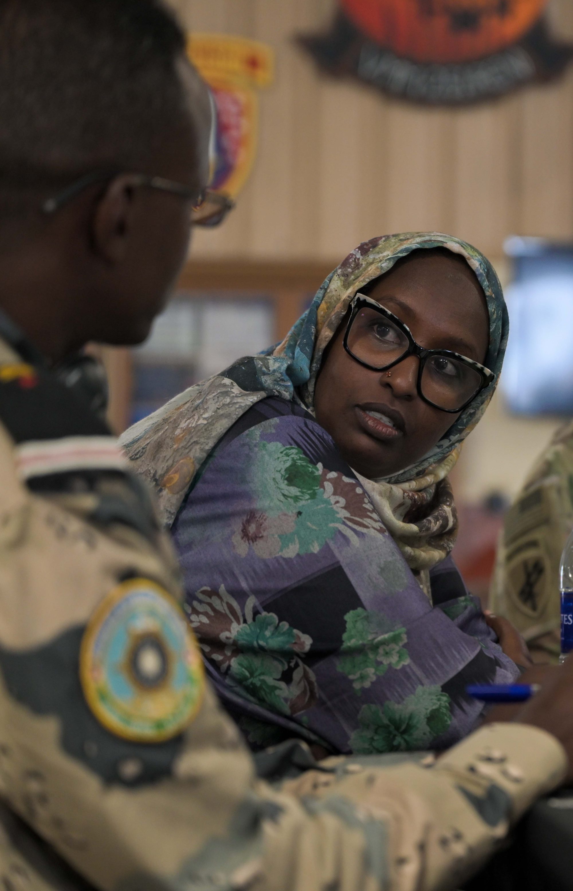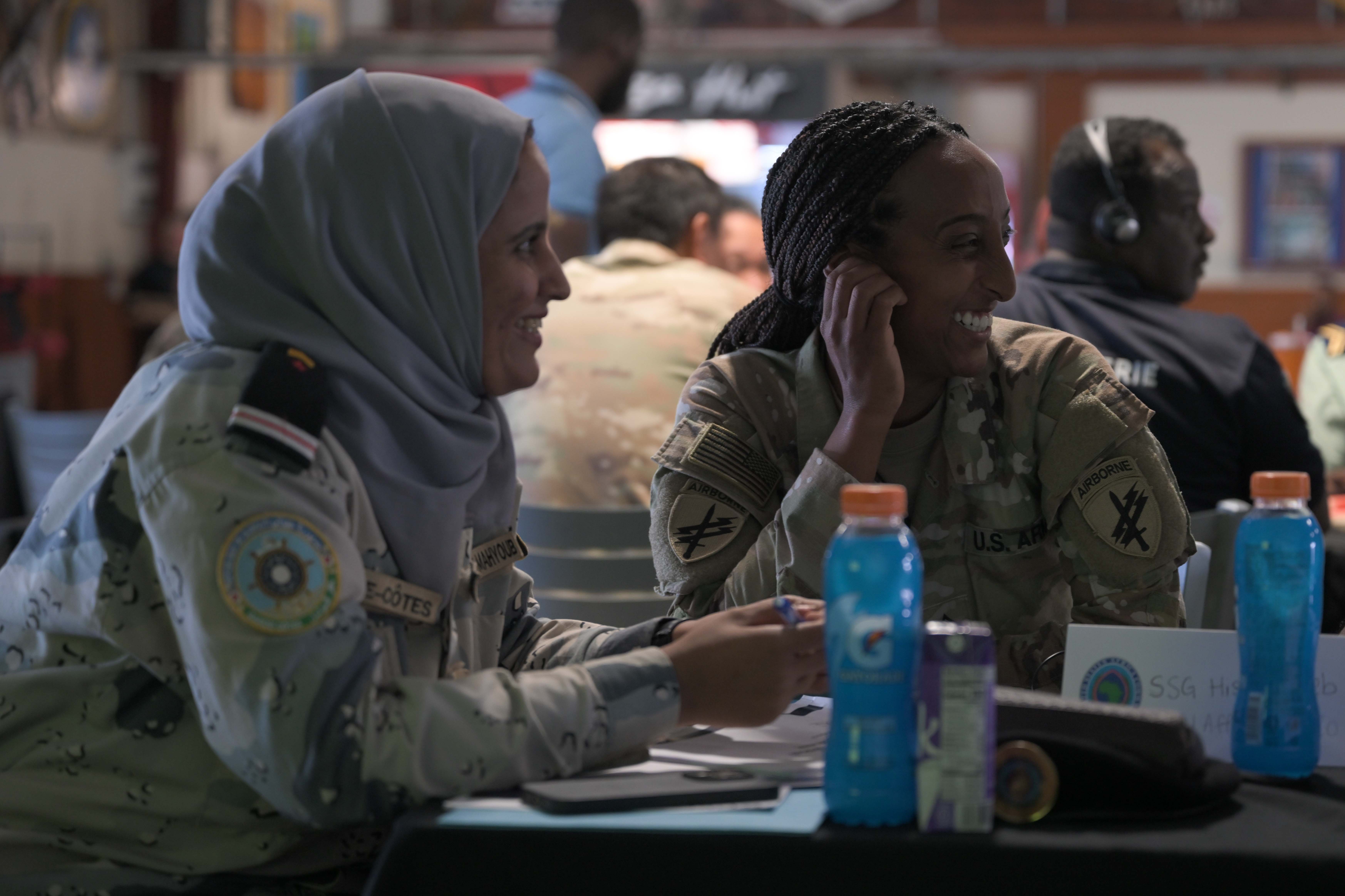 A U.S. Army soldier and a Djibouti Coast Guard service member participate in a group discussion during the Fundamentals of Global Health Engagement course at Camp Lemonnier, Djibouti, Feb. 25, 2025. The FOGHE is a three-day course that improved understanding of the full array of issues surrounding and shaping global health engagements. (U.S. Air Force photo by Airman 1st Class Synsere Howard)