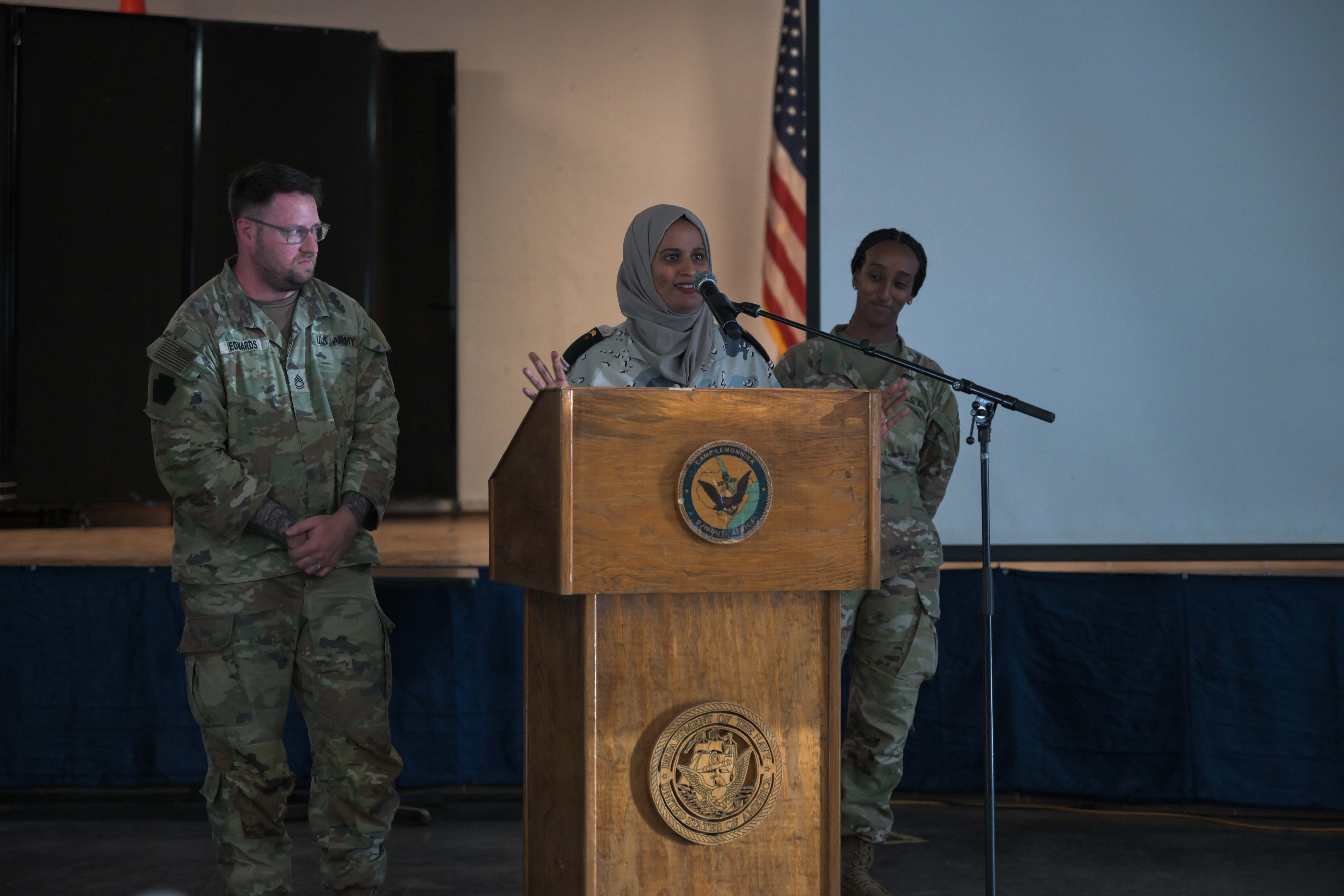 A Djiboutian Coast Guard service member and U.S. Army personnel present a group project during a Fundamentals of Global Health Engagement course at Camp Lemonnier, Djibouti, Feb. 26, 2025. The FOGHE is a three-day course that improved understanding of the full array of issues surrounding and shaping global health engagements. (U.S. Air Force photo by Airman 1st Class Synsere Howard)