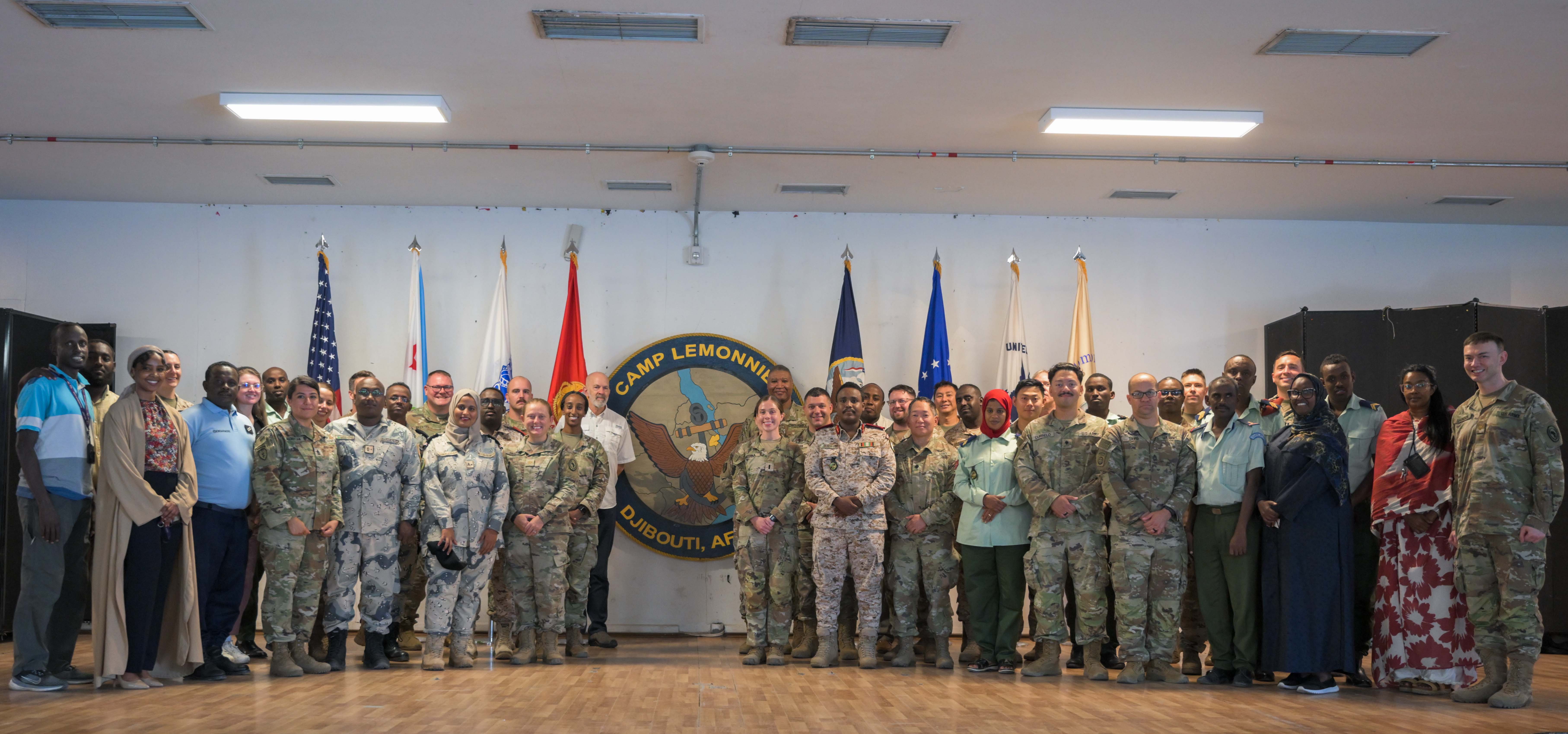 Participants of a Fundamentals of Global Health Engagement course pose for a group photo at Camp Lemonnier, Djibouti, Feb. 26, 2025. The course utilized an interactive seminar-style format to present the knowledge and skills critical to developing and conducting effective GHE programs and activities. (U.S. Air Force photo by Airman 1st Class Synsere Howard)