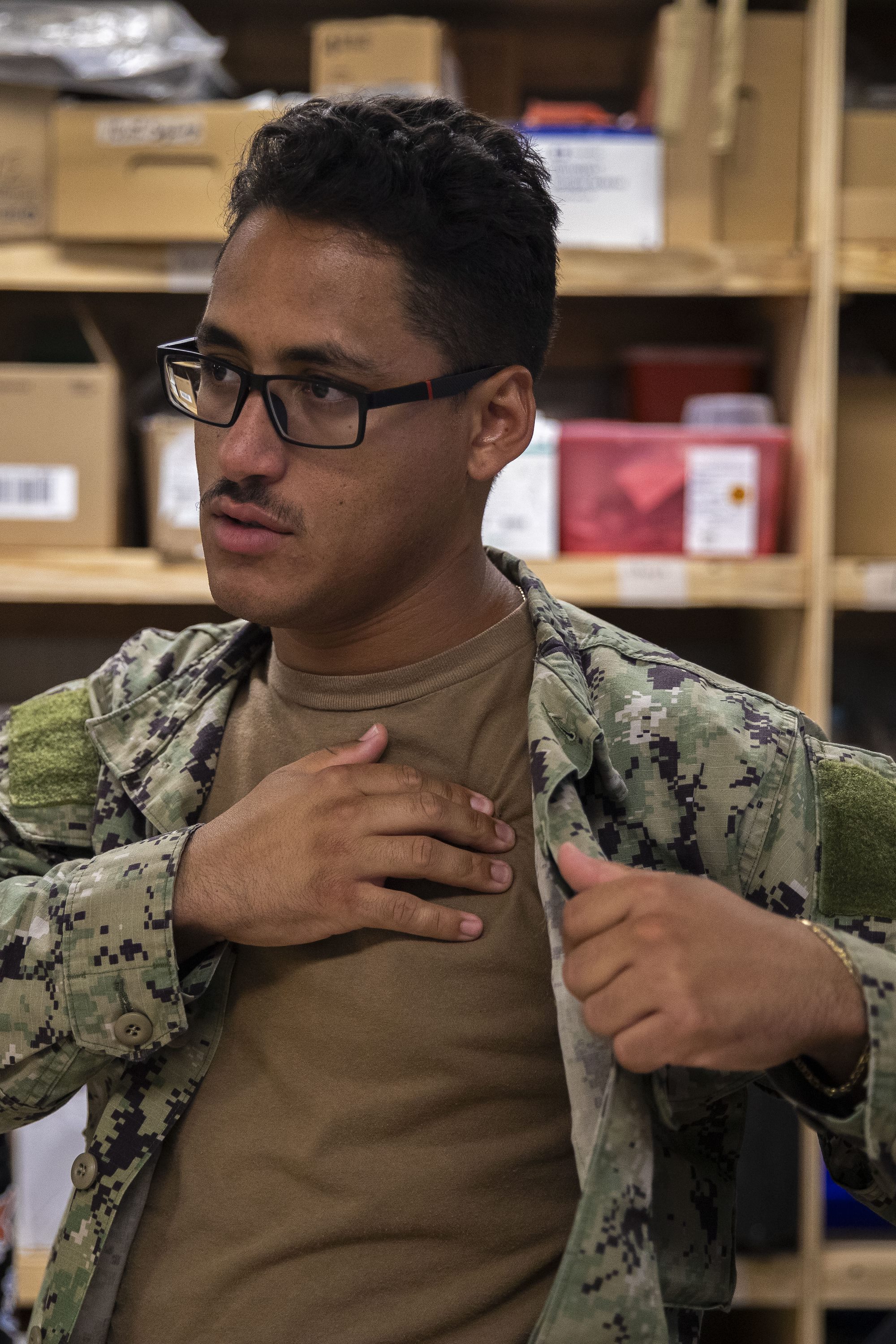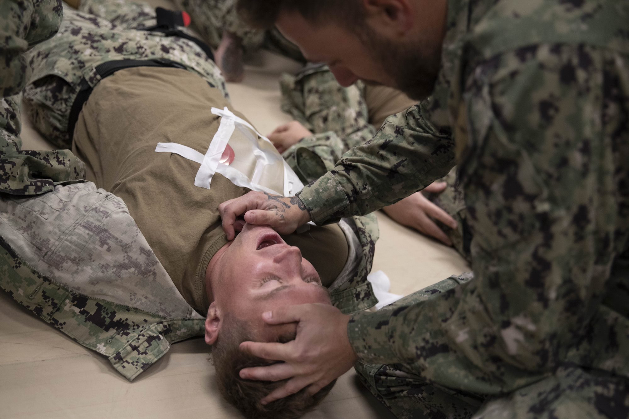 U.S. Navy Sailors practice placing a chest seal during a combat lifesavers course hosted by Combined Joint Task Force – Horn of Africa at Camp Lemonnier, Djibouti, Feb. 20, 2025. The course was designed to simulate a ship. They learned various techniques such as placing a chest decompression needle, packing a wound and wrapping it with medical bandages to control bleeding. (U.S. Army photo by Spc. Micheala Maldonado)