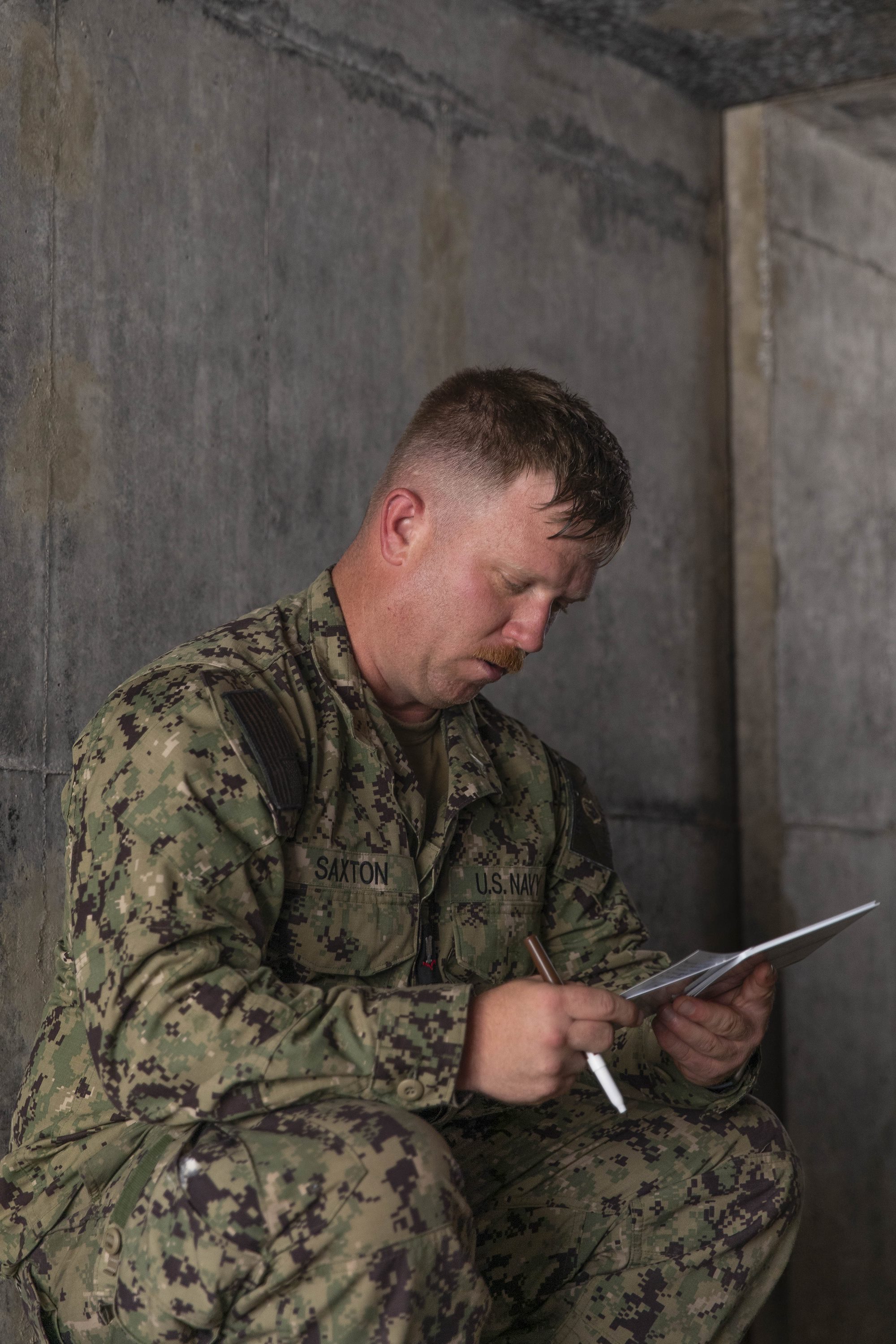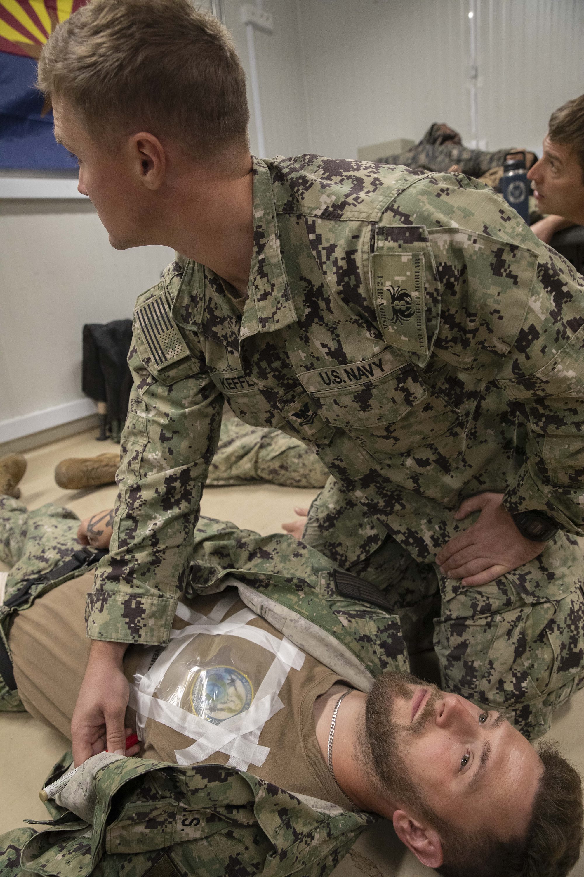 U.S. Navy Sailors attend a combat lifesavers course hosted by Combined Joint Taks Force – Horn of Africa at Camp Lemonnier, Djibouti, Feb. 20, 2025. The course was designed to simulate a ship. They learned various techniques such as placing a chest decompression needle, packing a wound and wrapping it with medical bandages to control bleeding. (U.S. Army photo by Spc. Micheala Maldonado)