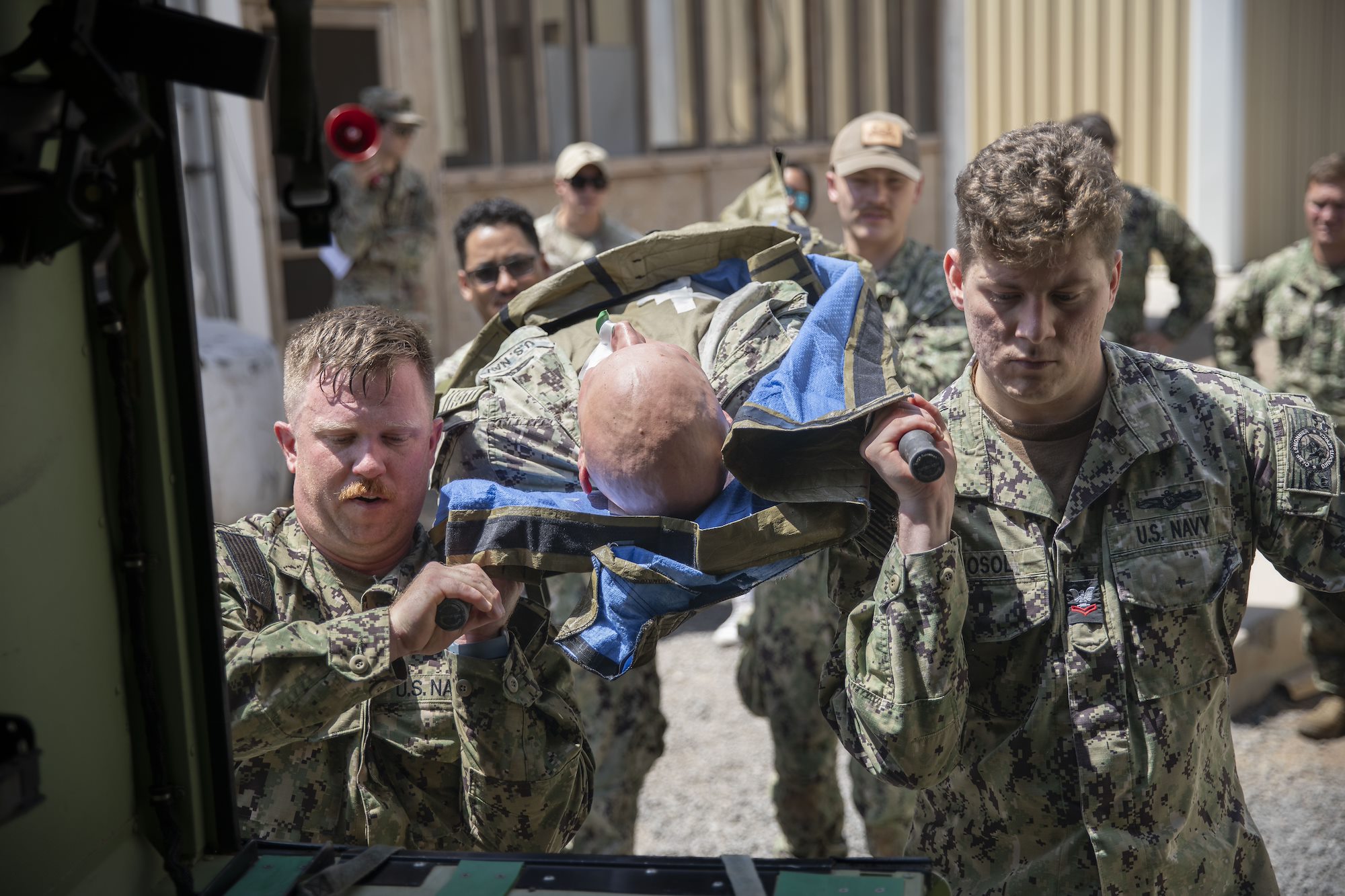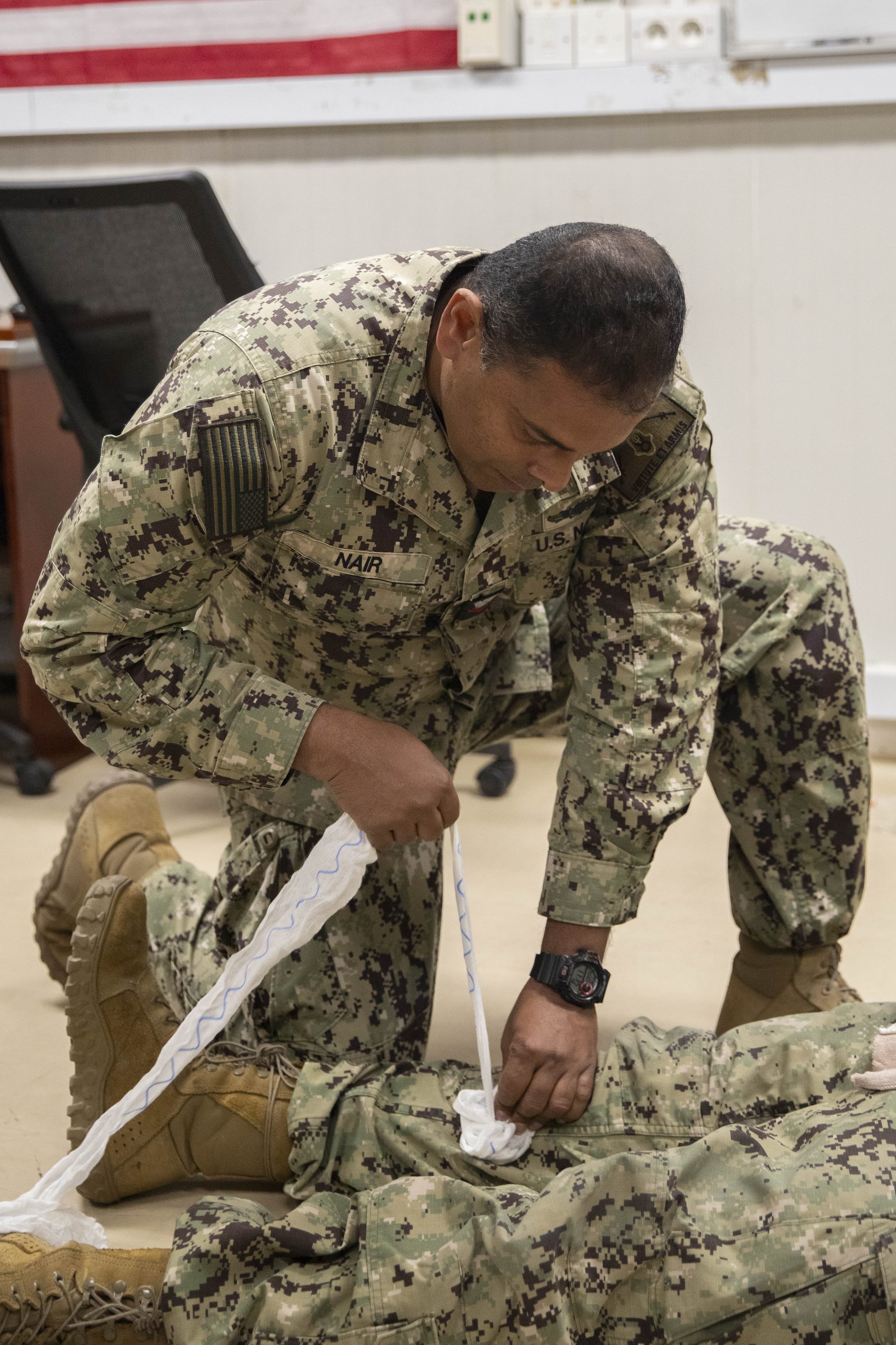 U.S. Navy Sailors practice several life-saving techniques during a combat lifesavers course hosted by Combined Joint Task Force – Horn of Africa assessment at Camp Lemonnier, Djibouti, Feb. 21, 2025. The participants ran drills consisting of placing a nasopharyngeal airway, applying a tourniquet and assessing and caring for different wounds. (U.S. Army photo by Spc. Micheala Maldonado)
