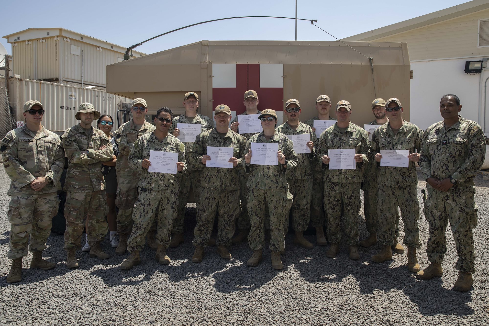 Joint service members pose after completing a combat lifesavers course assessment hosted by Combined Joint Task Force – Horn of Africa at Camp Lemonnier, Djibouti, Feb. 21, 2025. The participants received hands-on training and were able to perform various medical tasks to extend the timeline to get an injured service member emergency medical care. (U.S. Army photo by Spc. Micheala Maldonado)