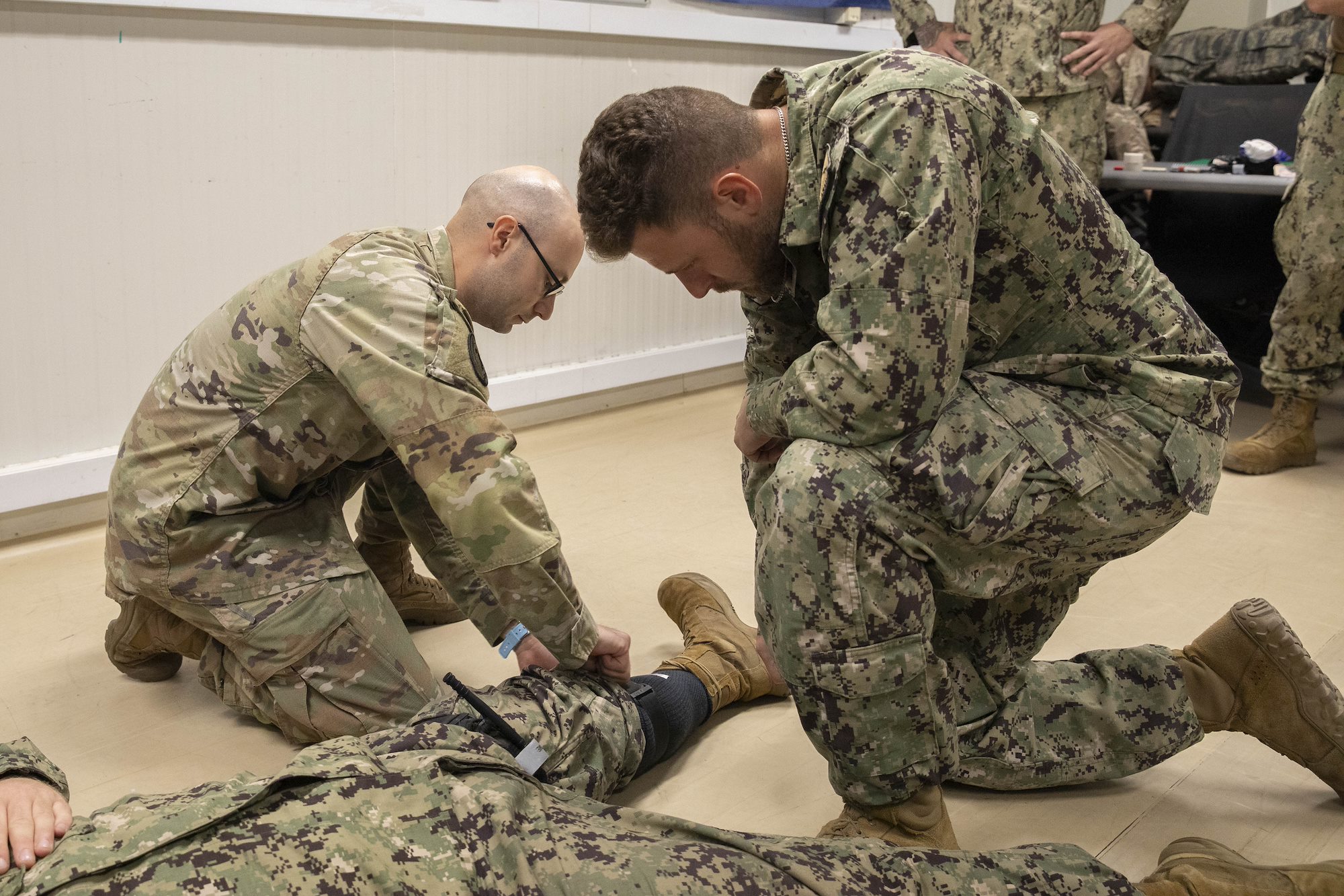 U.S. Army Sgt. Joshua Anderson, Pennsylvania National Guard assigned to Task Force Associator medical personnel, assists in a combat lifesavers course assessment hosted by Combined Joint Task Force – Horn of Africa at Camp Lemonnier, Djibouti, Feb. 21, 2025. The participants ran drills consisting of placing a nasopharyngeal airway, applying a tourniquet and assessing and caring for different wounds. (U.S. Army photo by Spc. Micheala Maldonado)