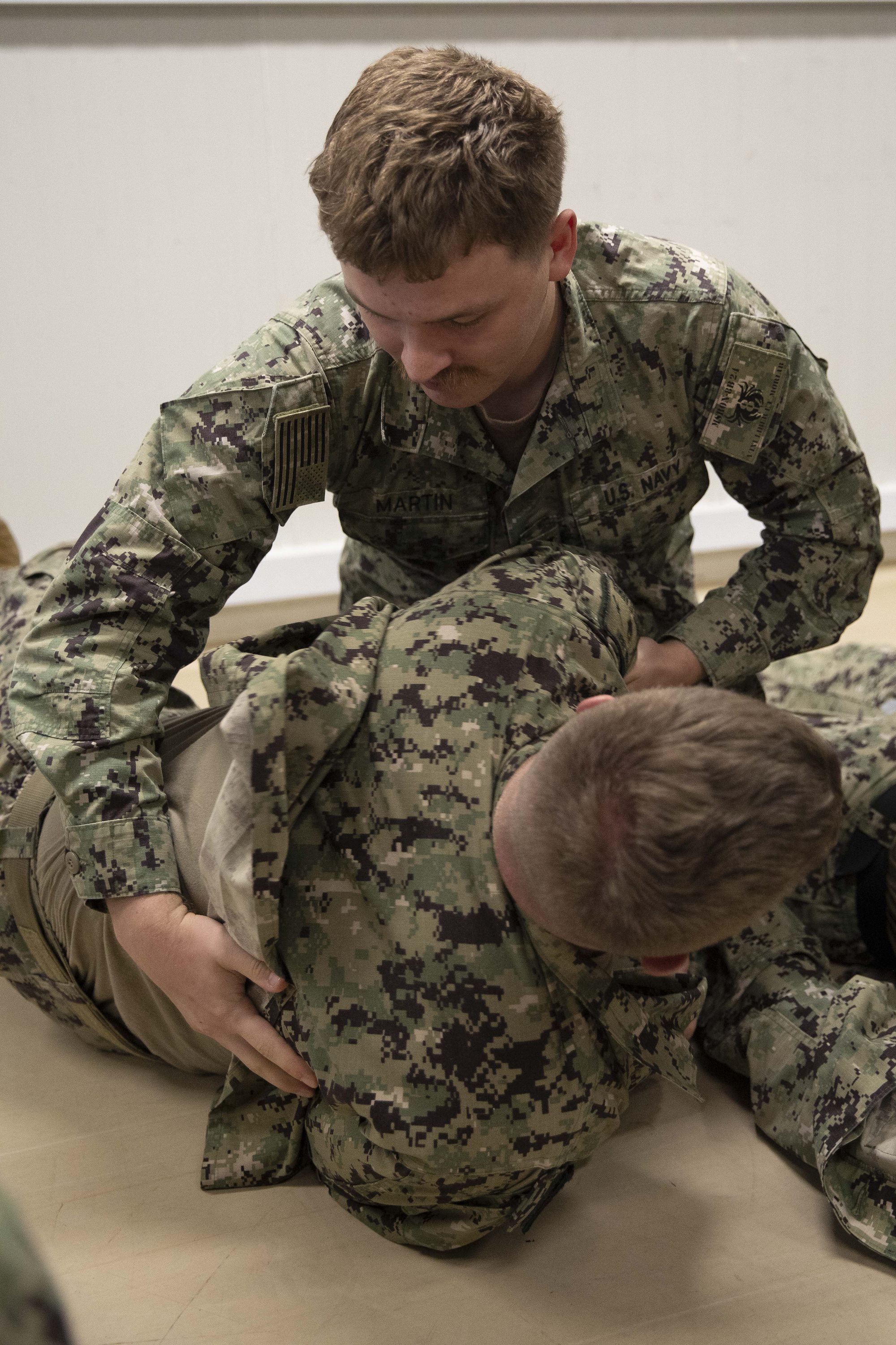 U.S. Navy Sailors practice creating a stabilizing bandage during a combat lifesavers course hosted by Combined Joint Task Force – Horn of African at Camp Lemonnier, Djibouti, Feb. 20, 2025. The course was designed to simulate a ship. They learned various techniques such as placing a chest decompression needle, packing a wound and wrapping it with medical bandages to control bleeding. (U.S. Army photo by Spc. Micheala Maldonado)