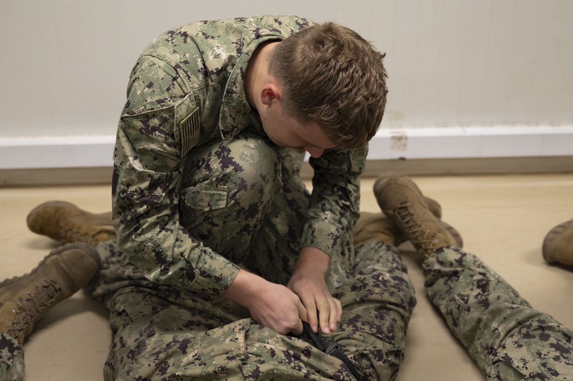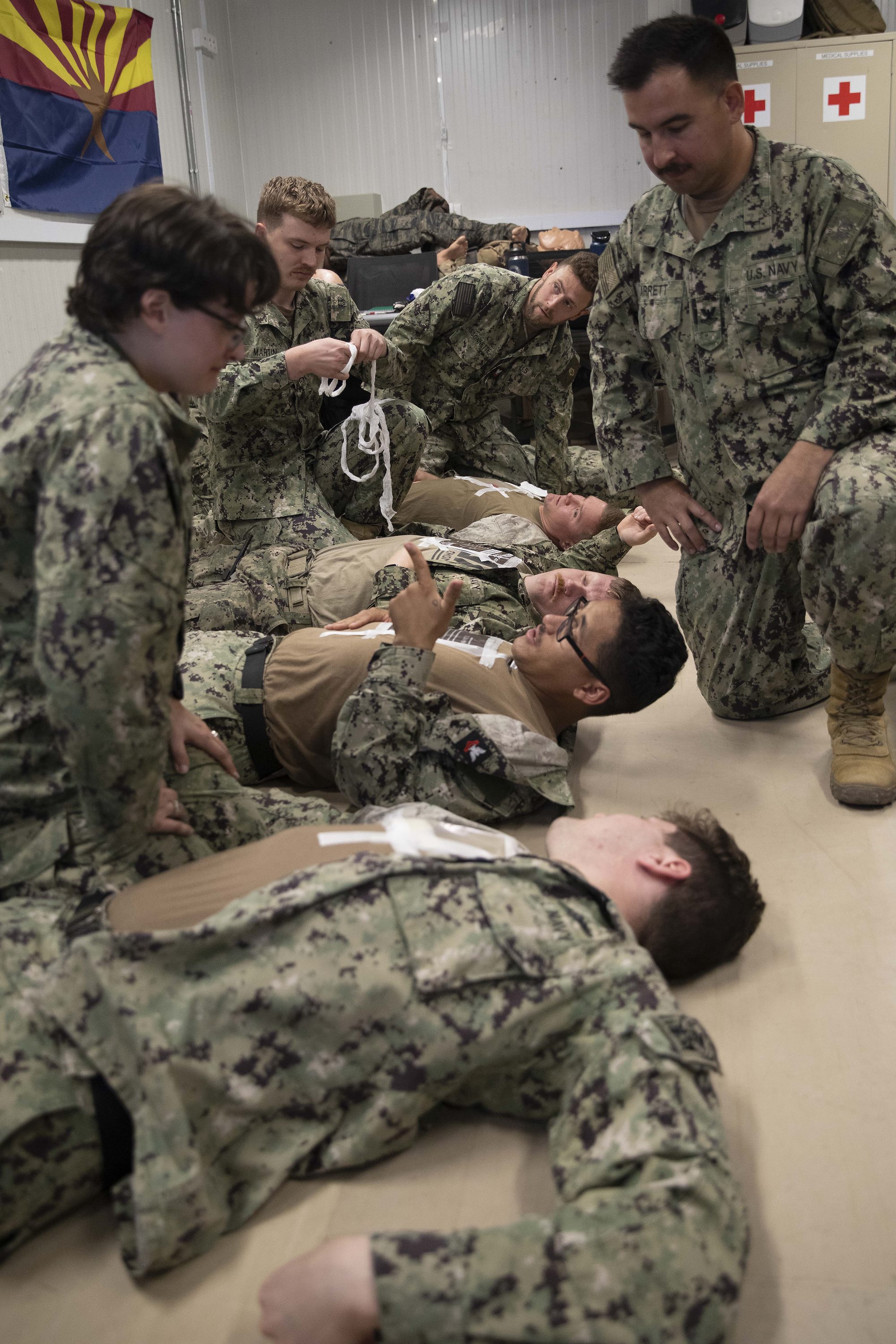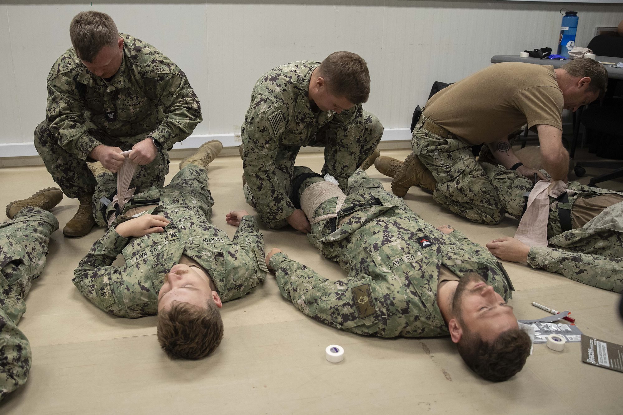 U.S. Navy Sailors practice packing a wound during a combat lifesavers course hosted by Combined Joint Task Force – Horn of Africa at Camp Lemonnier, Djibouti, Feb. 20, 2025. The course was designed to simulate a ship. They learned various techniques such as placing a chest decompression needle, packing a wound and wrapping it with medical bandages to control bleeding. (U.S. Army photo by Spc. Micheala Maldonado)
