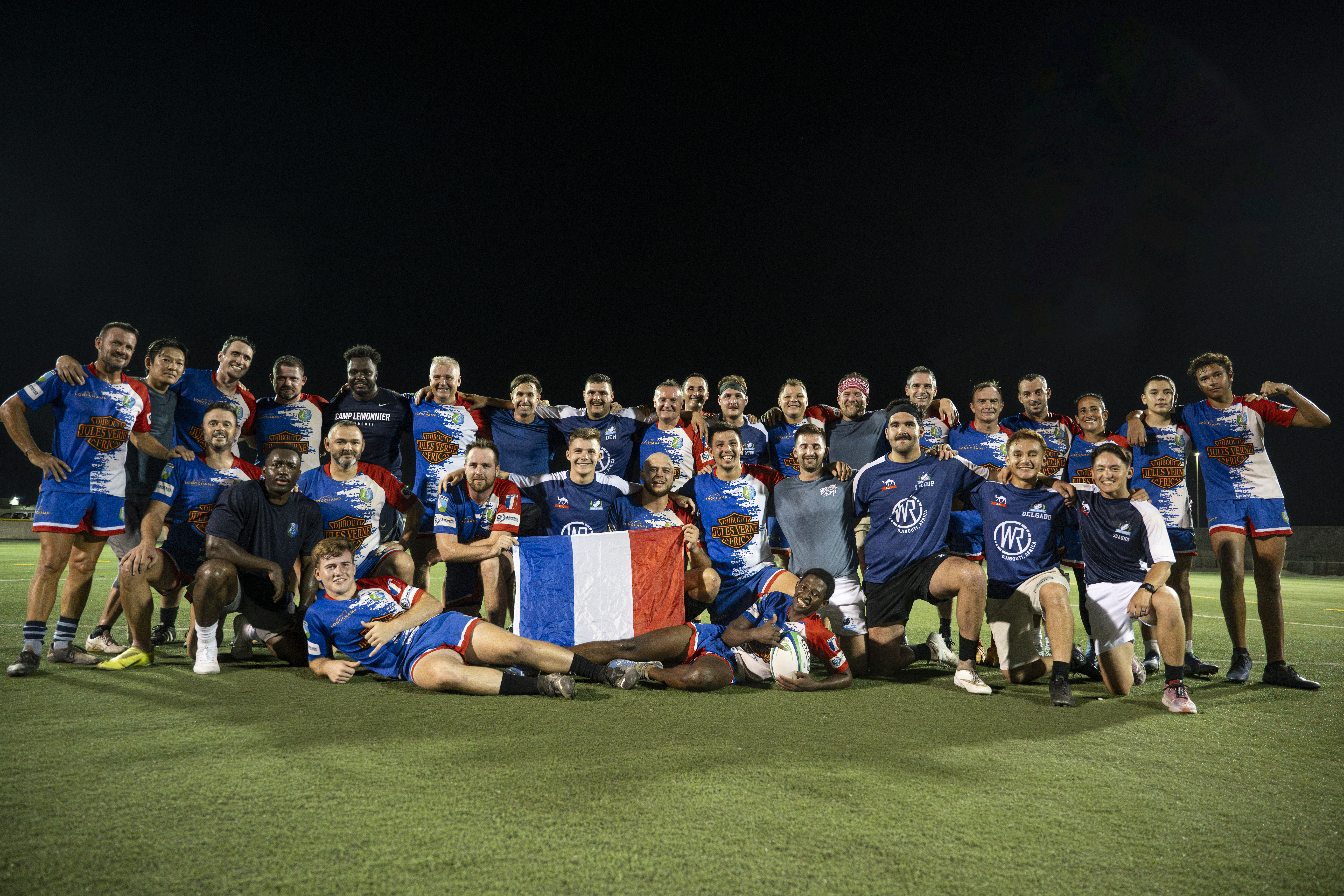 U.S. and French service members pose for a group photo after a Rugby match at Camp Lemonnier, Djibouti, March 13, 2025. Team sports promote long-term relationships and enhance partnerships throughout the region.