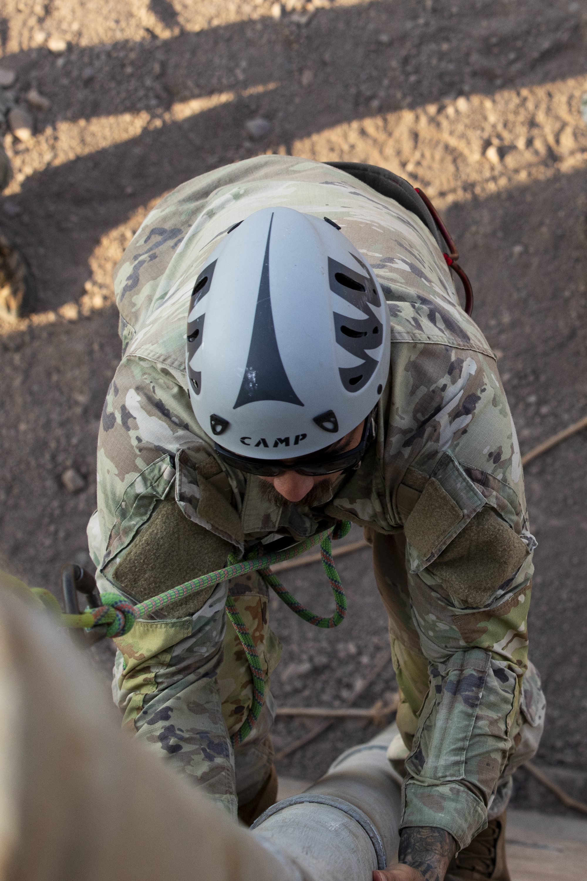 A U.S. service member practices proper recovery drills during a mountain course training for the French Desert Commando Course at the Combat Training Center, Arta Beach, Djibouti March 16, 2025. This year marked the ten-year anniversary with the U.S. participating in the French-led course. (U.S. Army photo by Spc Micheala Maldonado)