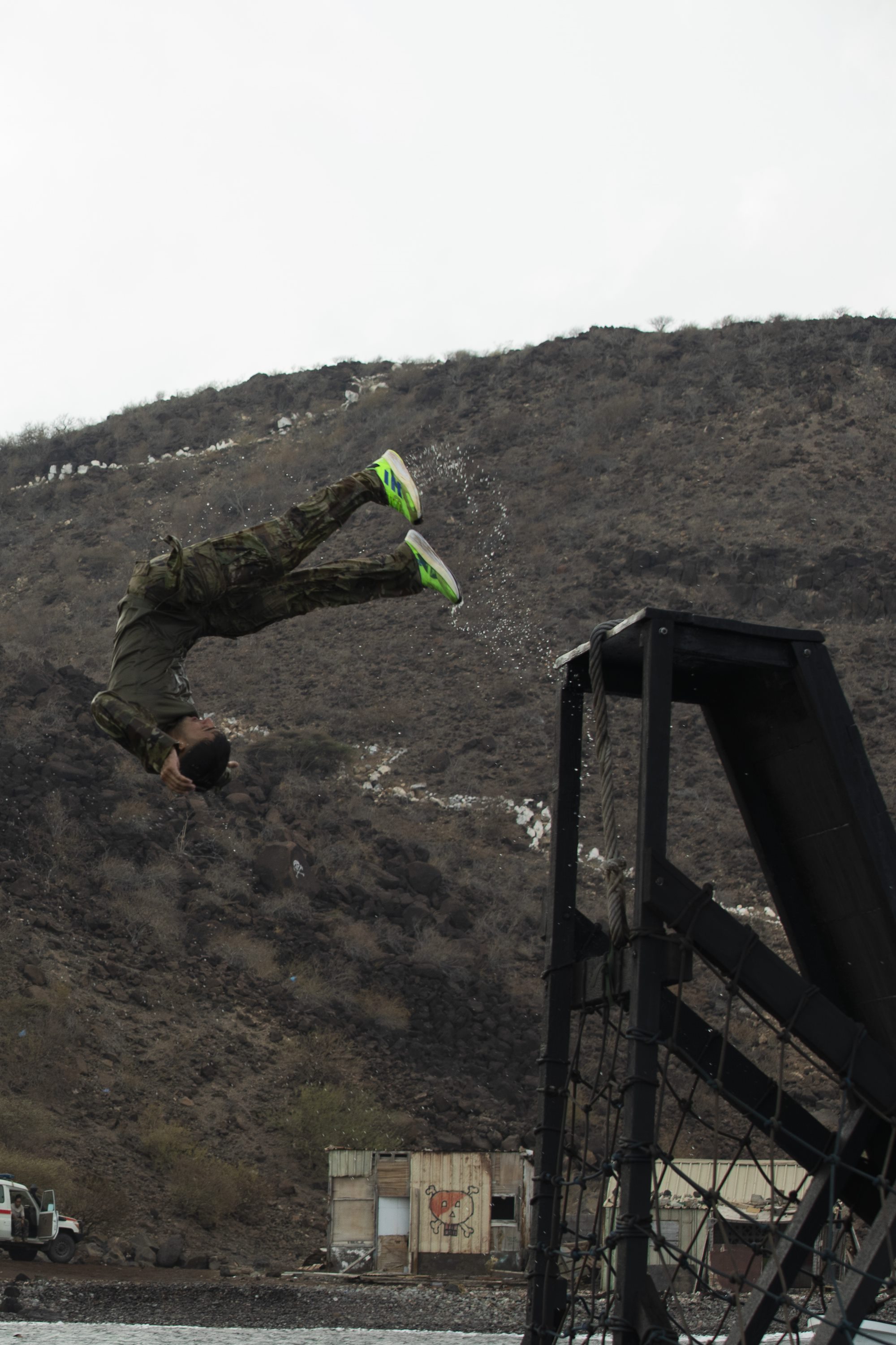 A U.S. service member completes a water obstacle course during the French Desert Commando Course at the Combat Training Center, Arta Beach, Djibouti March 18, 2025. The multi-day course consisted of various land and water obstacles, combative training and extreme endurance exercises in order to challenge participants both physically and mentally. (U.S. Army photo by Spc Micheala Maldonado)