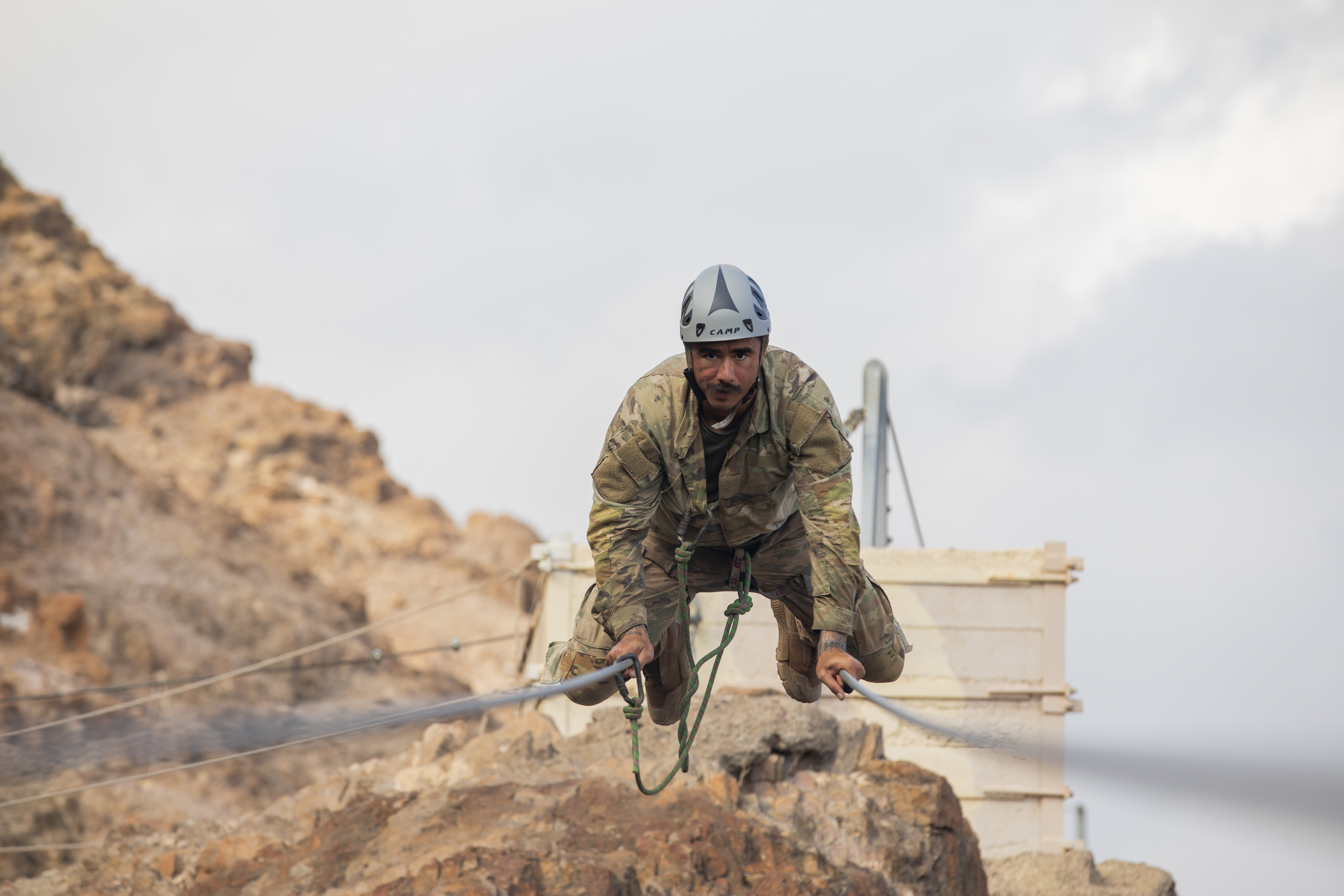 A U.S. service member performs one of three rope portions during the mountain course for the French Desert Commando Course at the Combat Training Center, Arta Beach, Djibouti March 20, 2025. The multi-day course consisted of various land and water obstacles, combative training and extreme endurance exercises that challenged participants both physically and mentally. (U.S. Army photo by Spc. Micheala Maldonado)